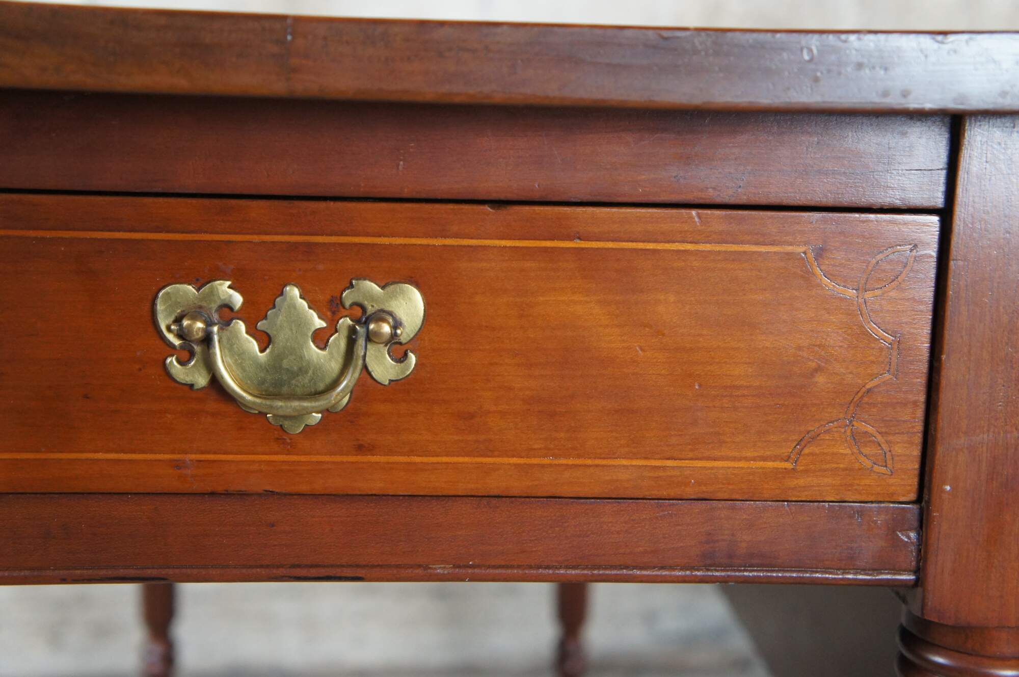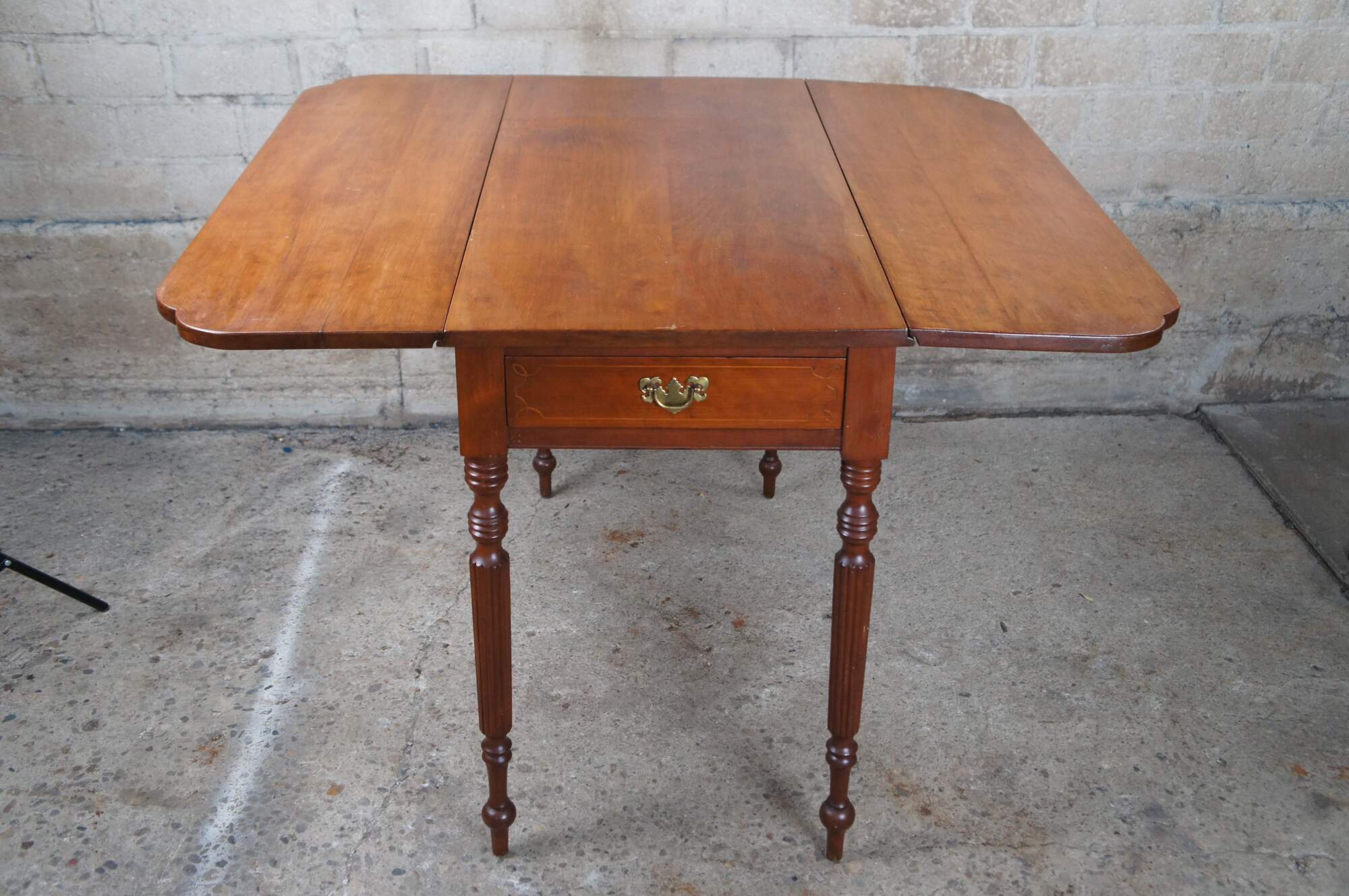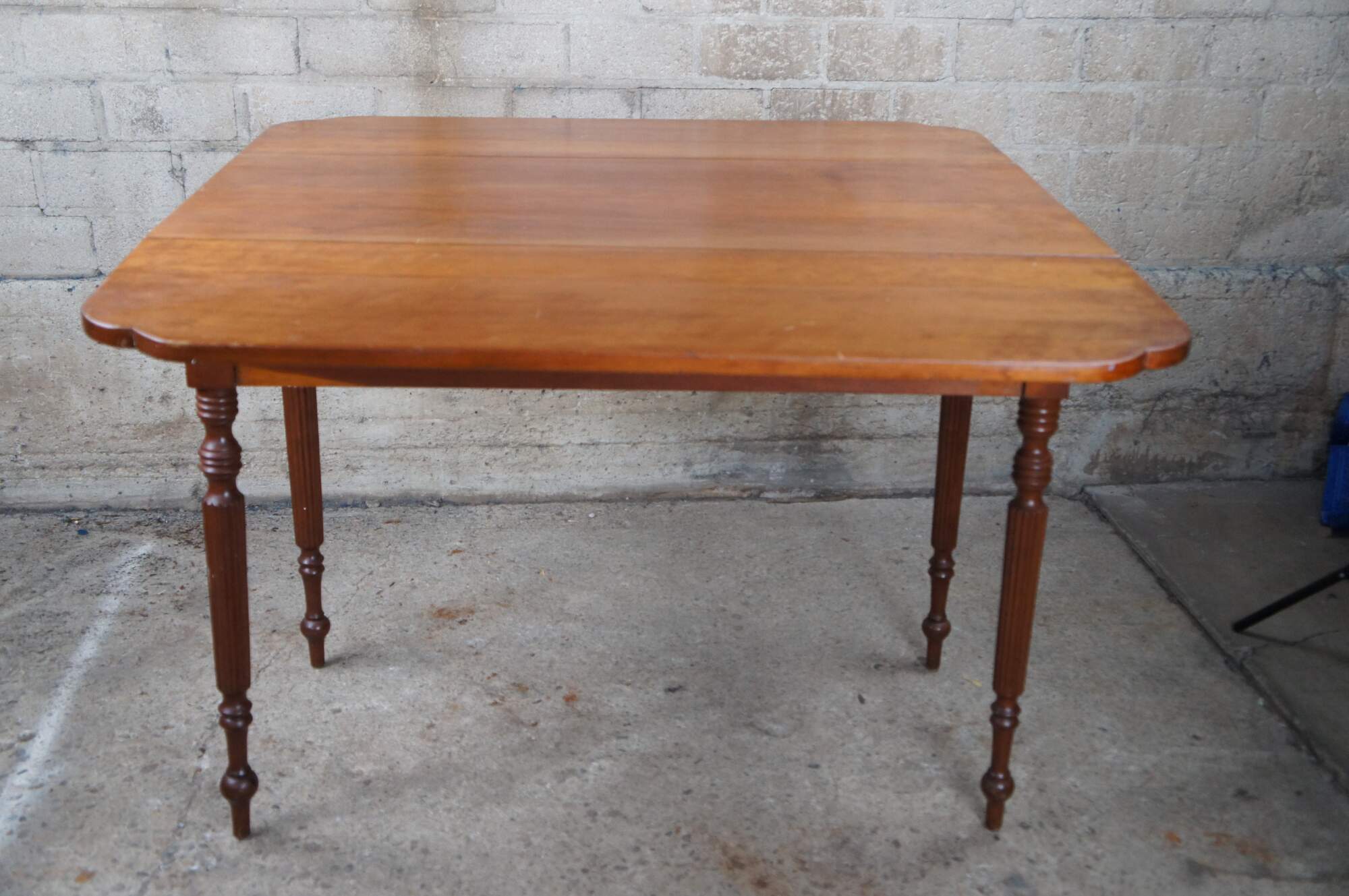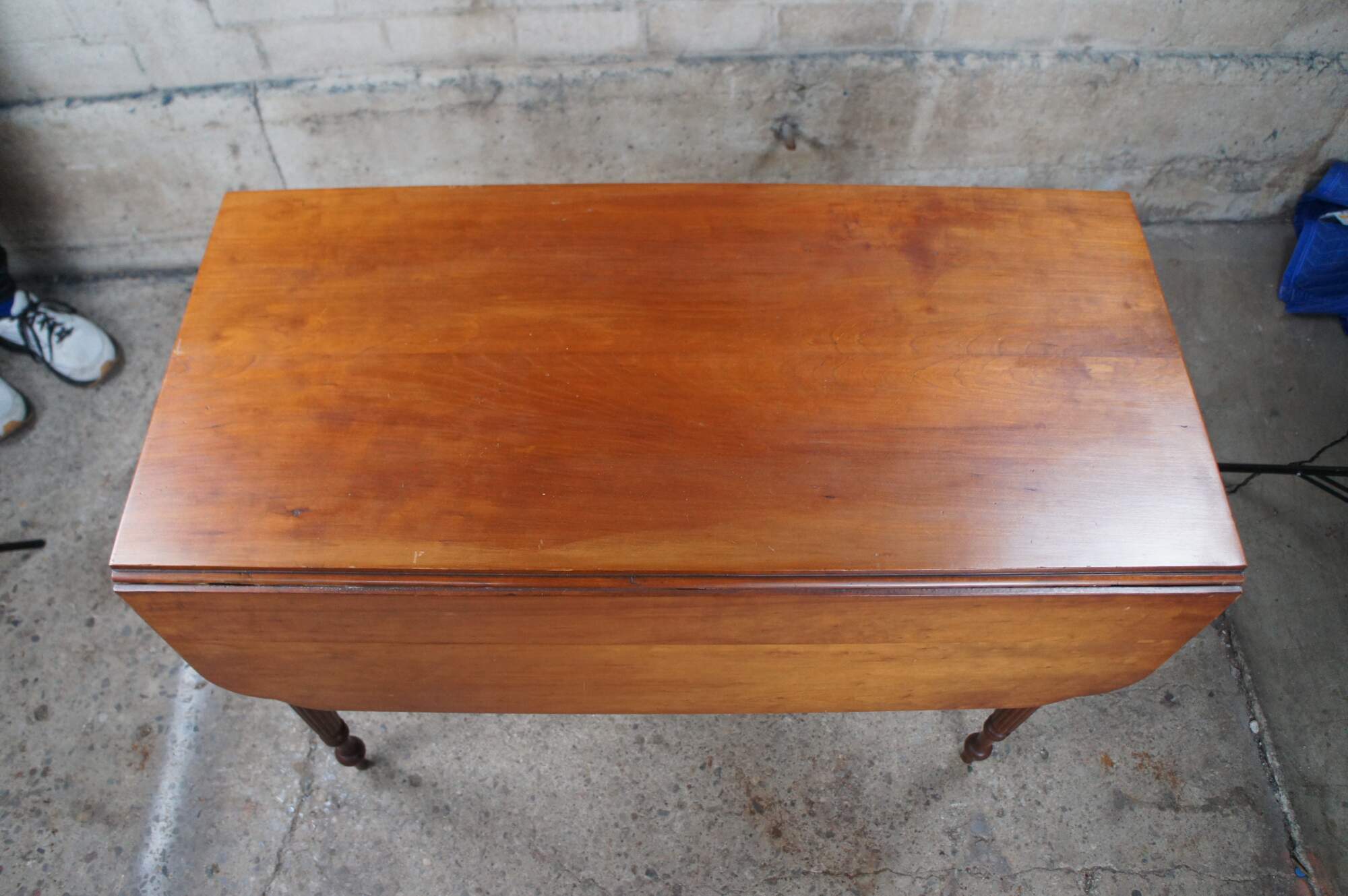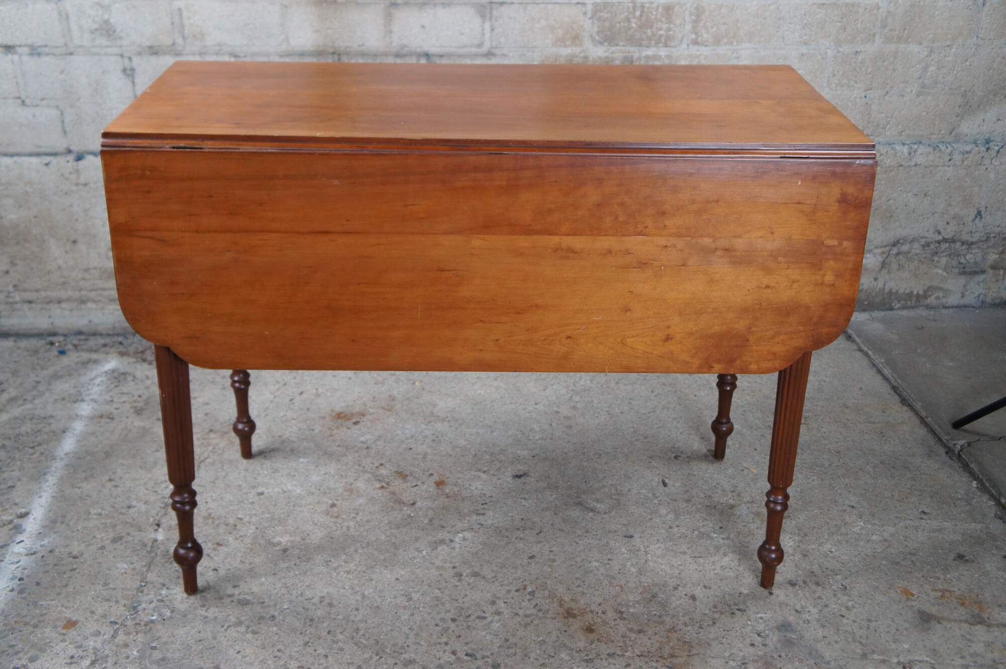 Early 19th Century American Sheraton Drop Leaf Table. Made from cherry with a hand-dovetailed and inlaid drawer within the frieze. The table features contoured corners and is supported by ring-turned-reeded legs leading to arrow feet. Great for use as a dining / breakfast table or console table.