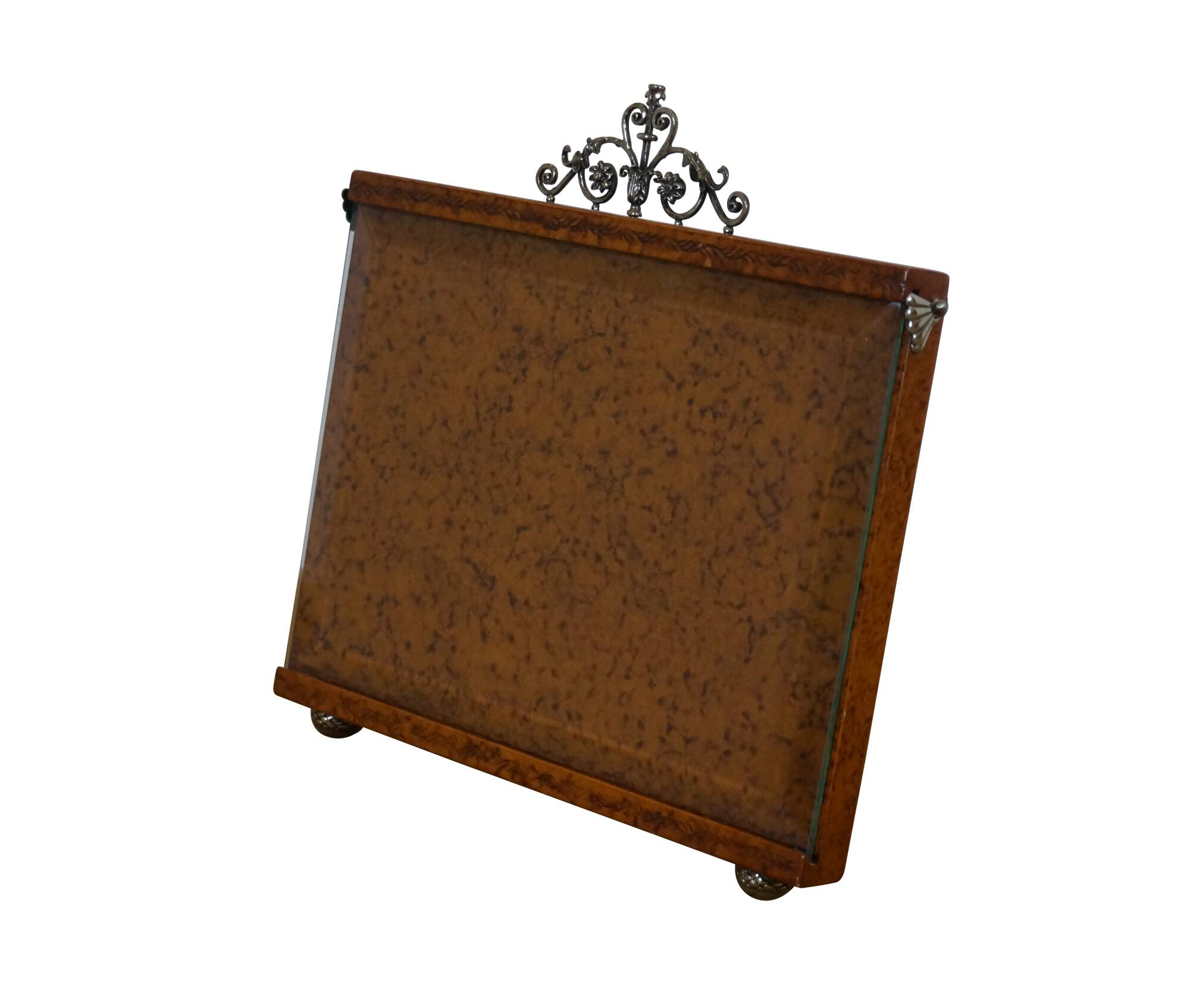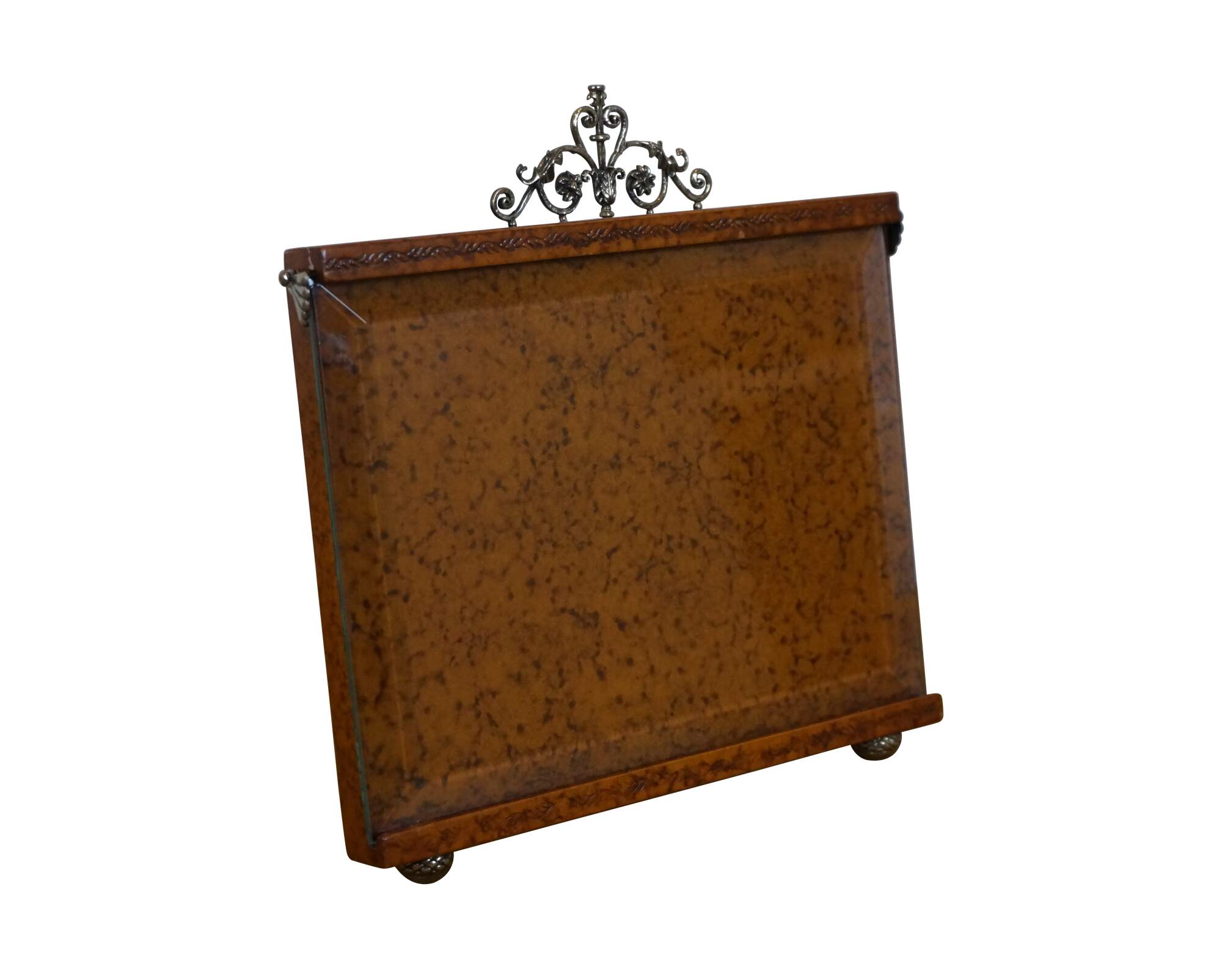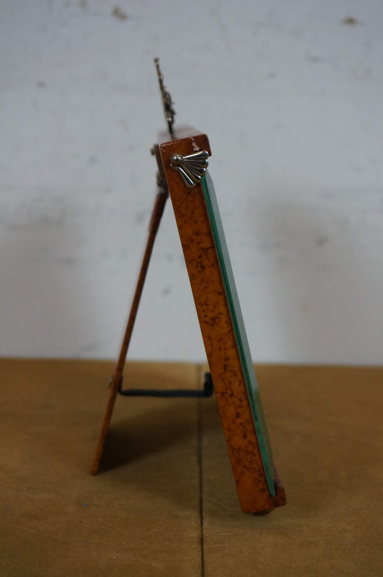 Late 20th century faux burl wood easel-style photo frame by Maitland Smith. Silver plate acorn feet and floral vine crest. Beveled glass front slides seamlessly onto the front of the frame, held in place with swiveling scallops at the corners. Handmade in the Philippines.
