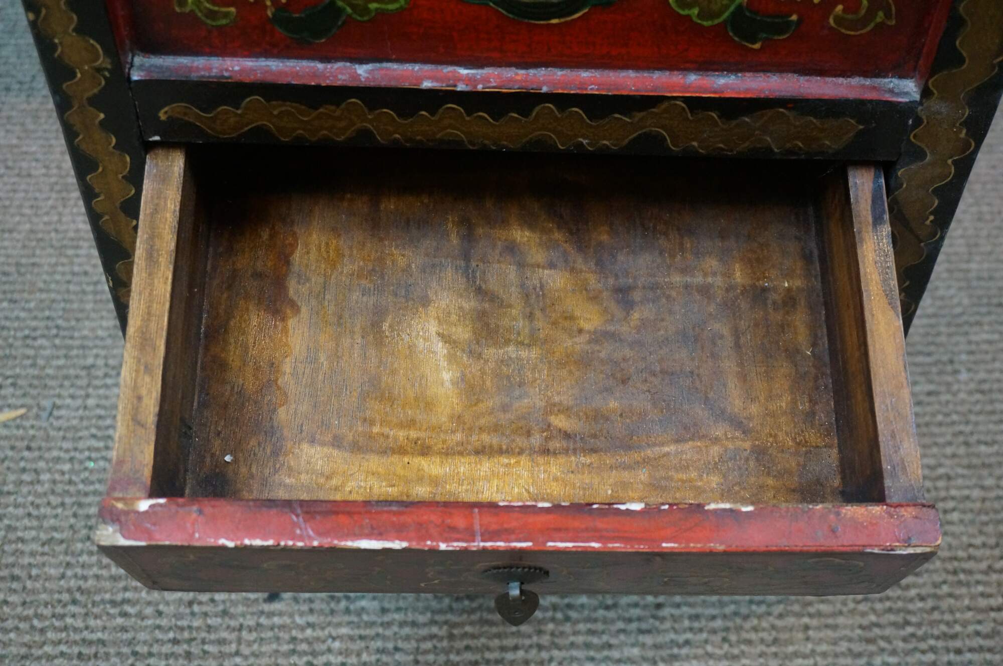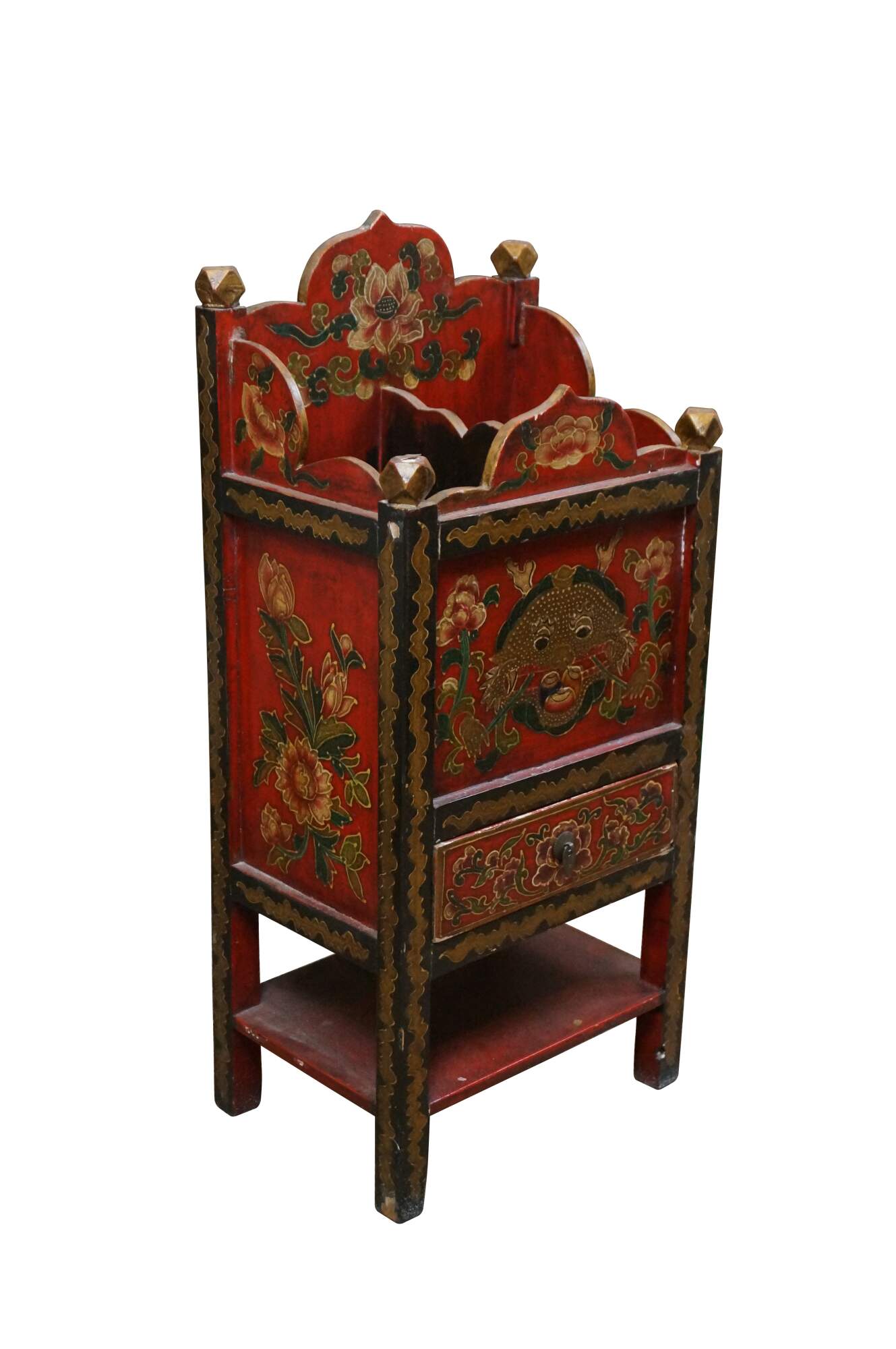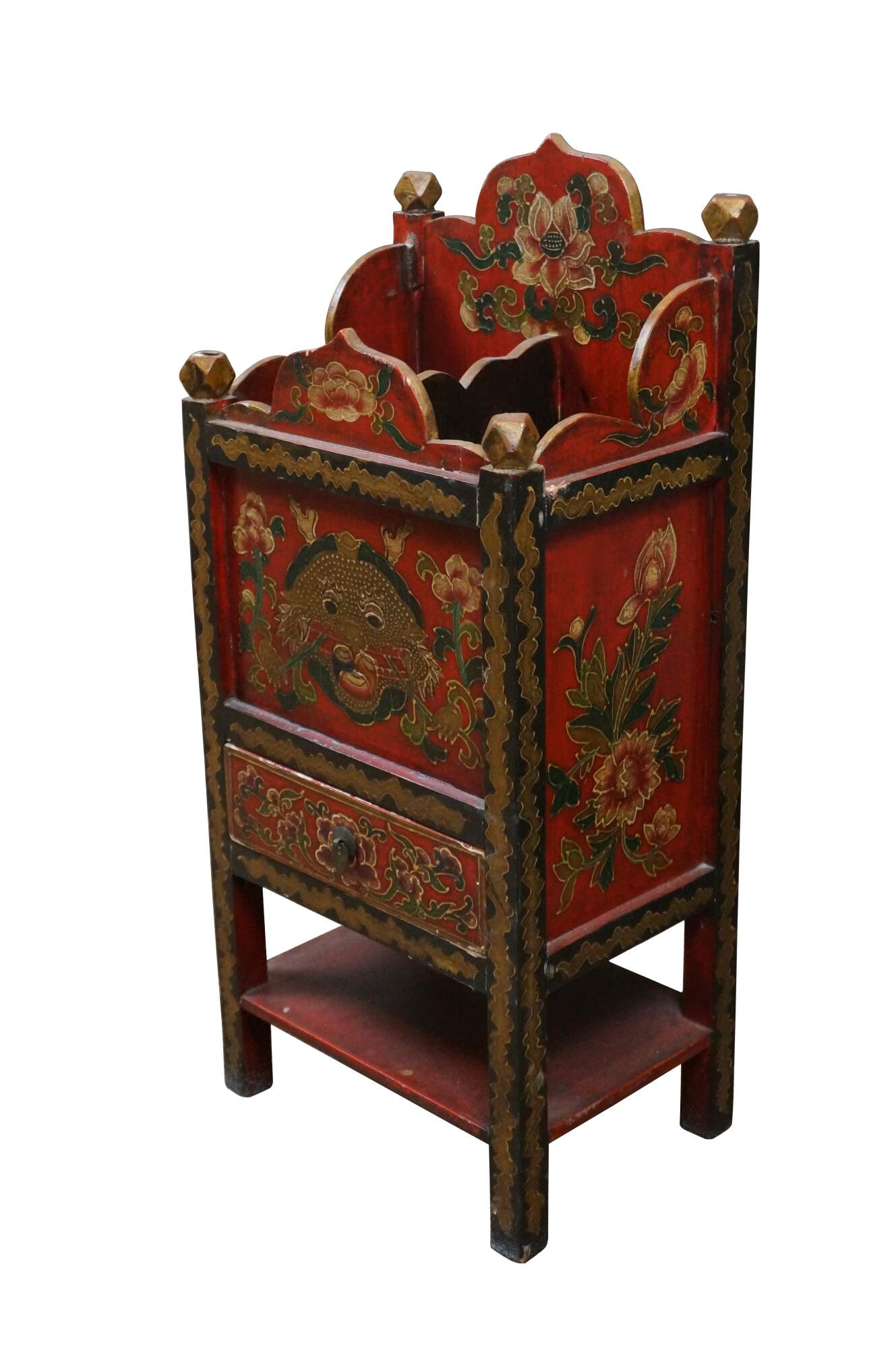 Charming 20th-century Tibetan hand-painted cabinet with drawer. Features a red gold, green, and black dragon motif. The top is divided for storage with a drawer and shelf below. Would work well as a parasol or small umbrella stand, or in a bathroom as a toilet paper holder.