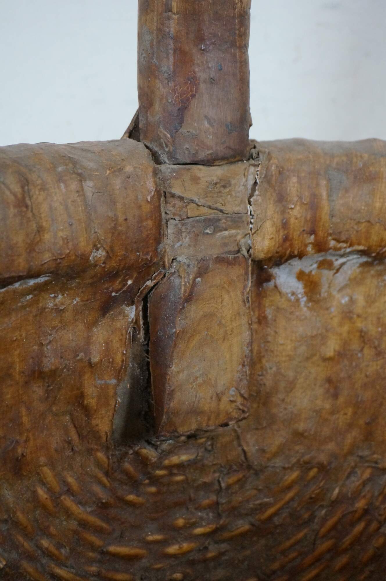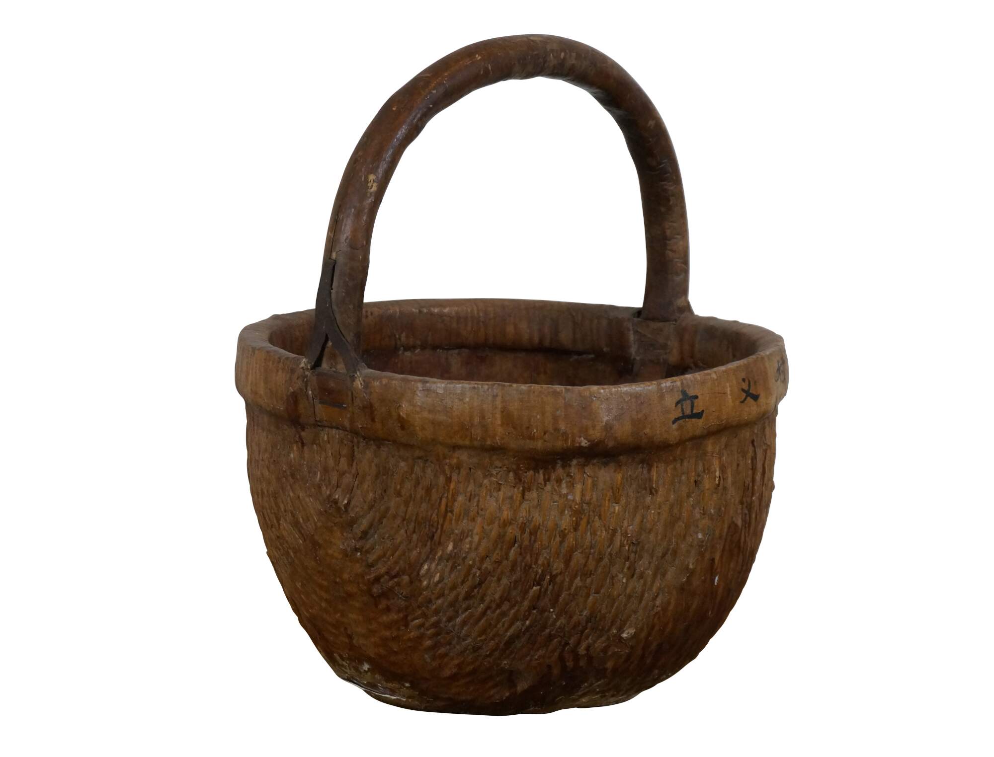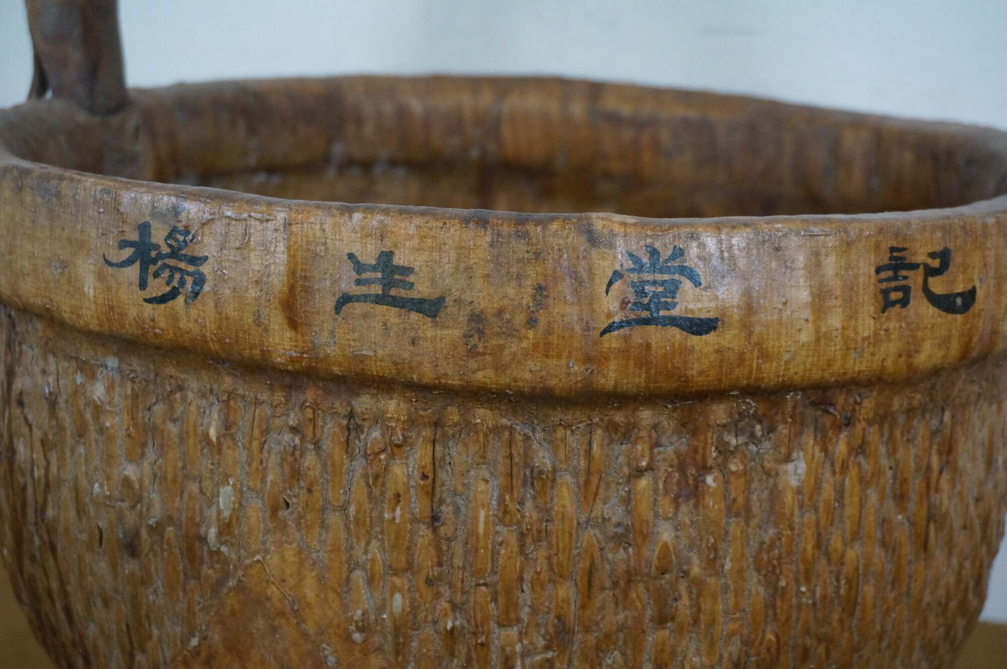 Mid 20th Century Chinese Rice Basket. Made from woven reed with a bentwood handle and caligraphy.