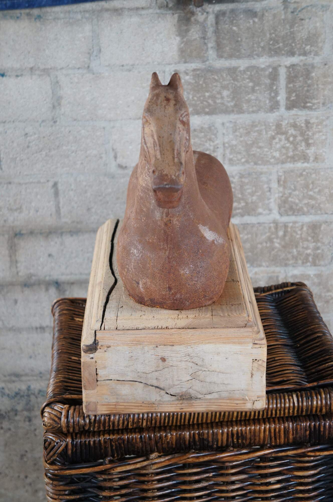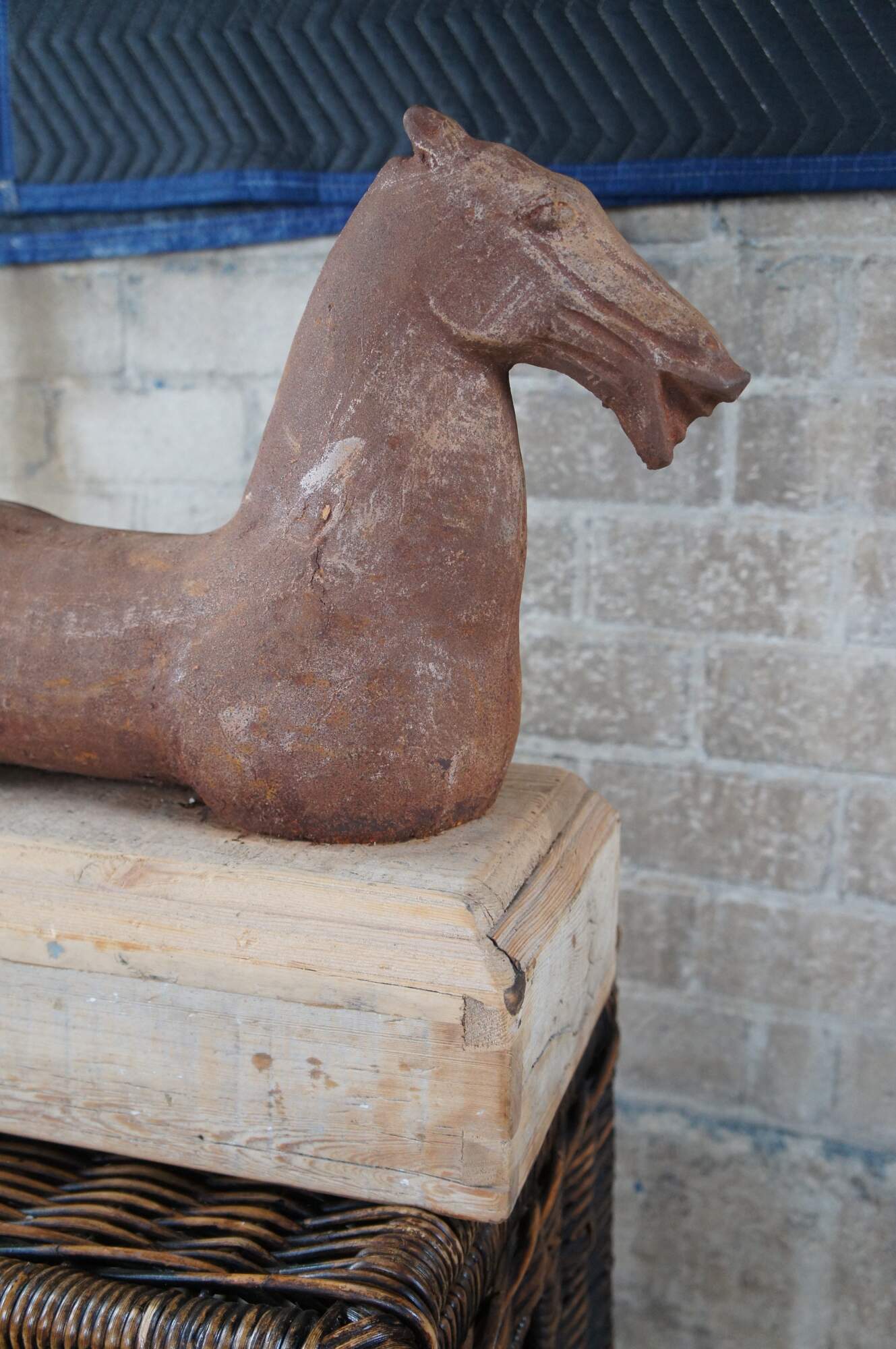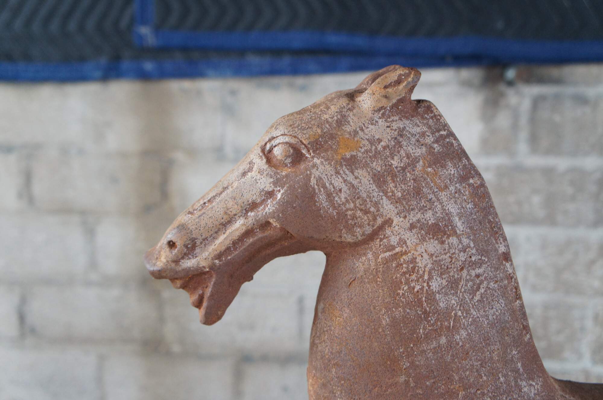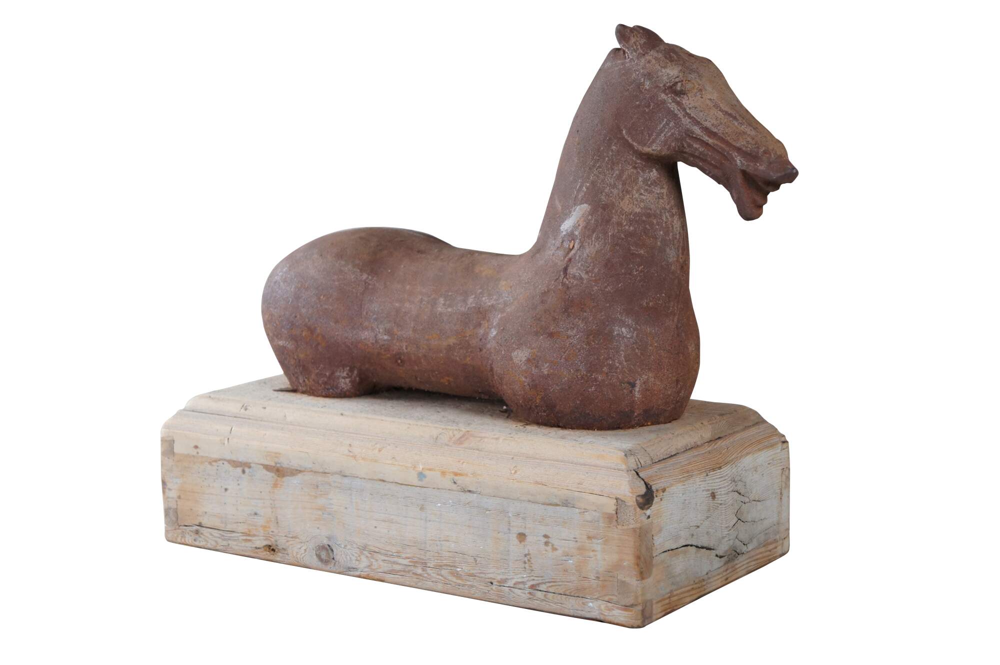 20th-century cast iron sculpture or hitching post of a Han (or Tang) Dynasty-style horse with muscular cheeks, open mouth, and no legs. Mounted on a hollow, dovetailed, unfinished wood base.