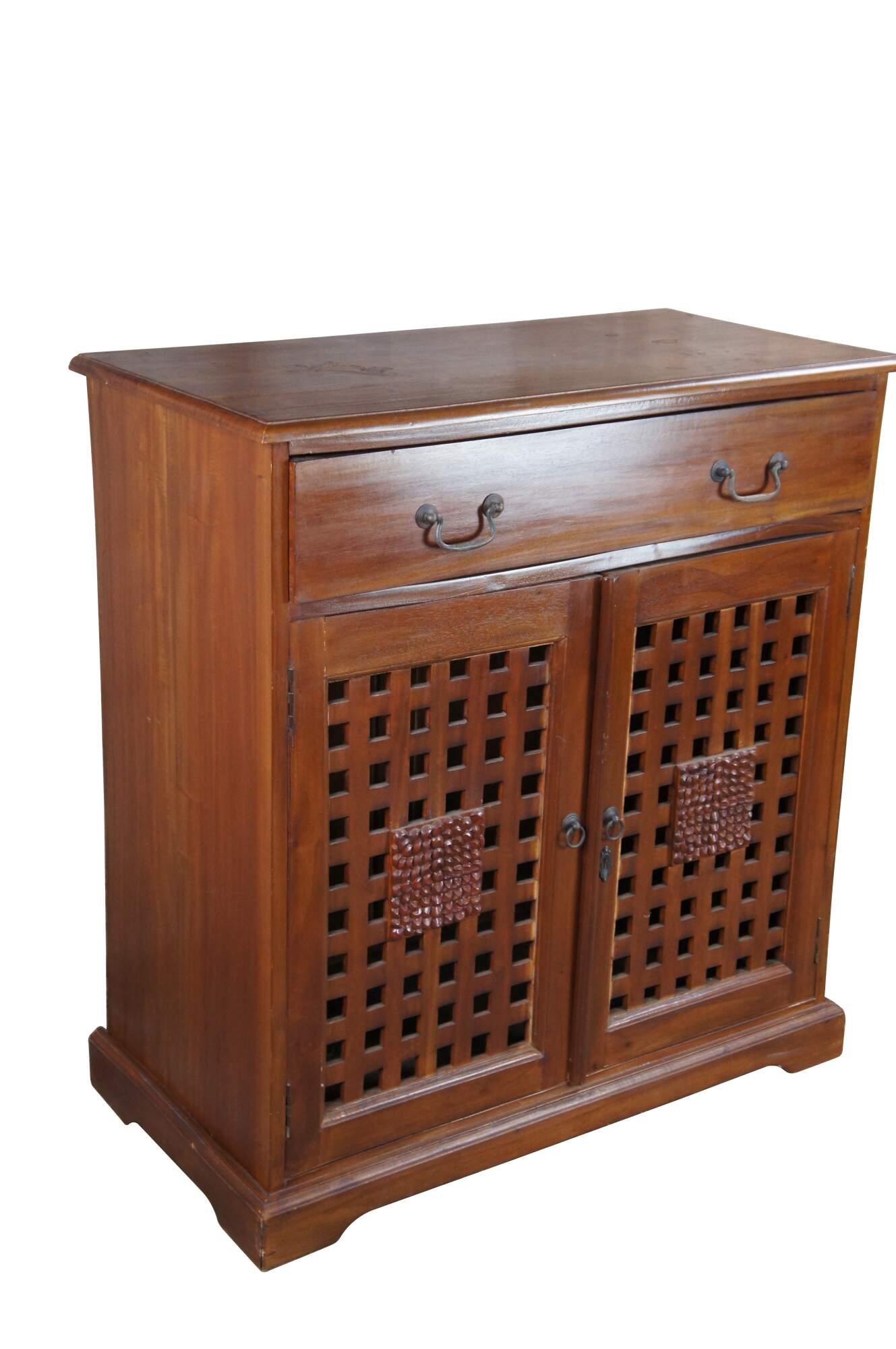Late 20th Century Indonesian Mahogany Cabinet. Features a dovetailed drawer over lattice doors carved at the center. Great for use as a console table, drybar, server, buffet or cupboard.