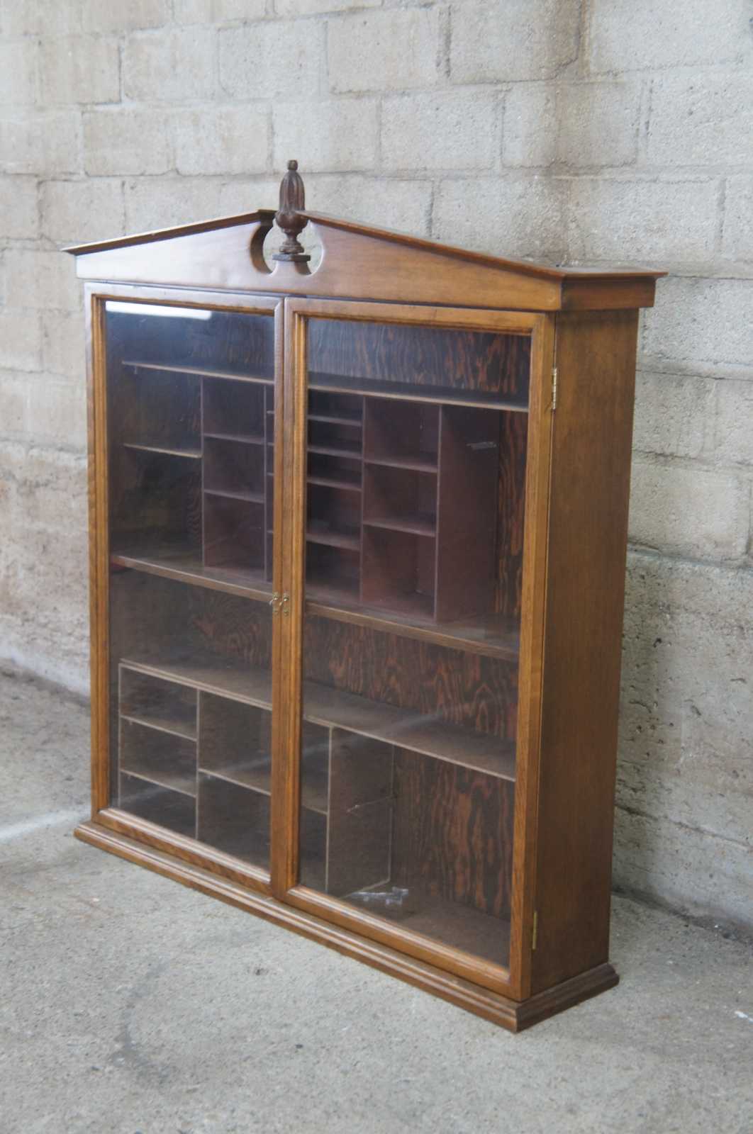 George III style wall curio or display cabinet, circa mid 20th century. Made of walnut featuring a broken pediment top, interior shelves with optional inserts, and glass doors locked by fish clasp. Two available. One has brass American Eagle finial, one has elongated acorn trophy finial.