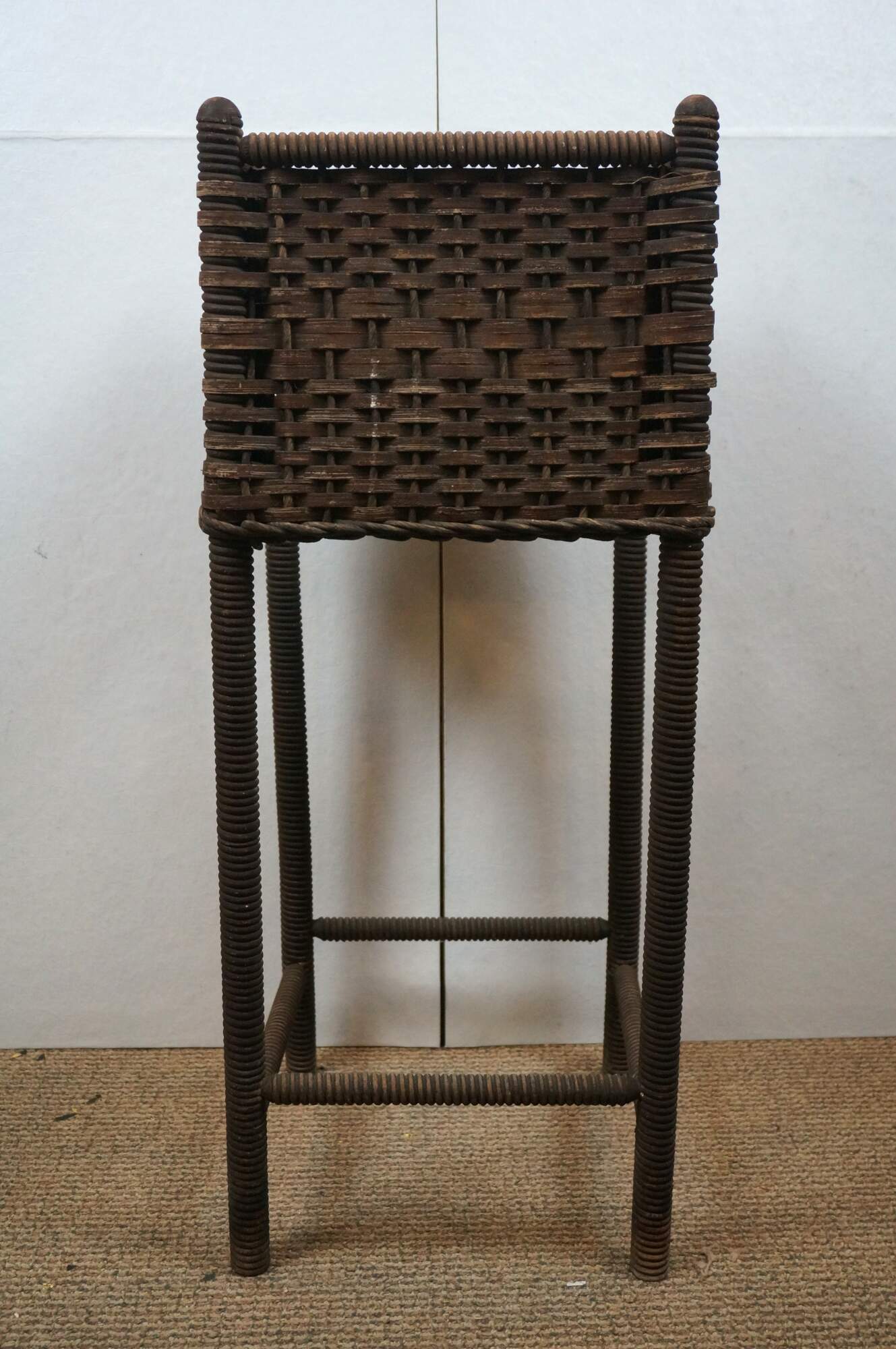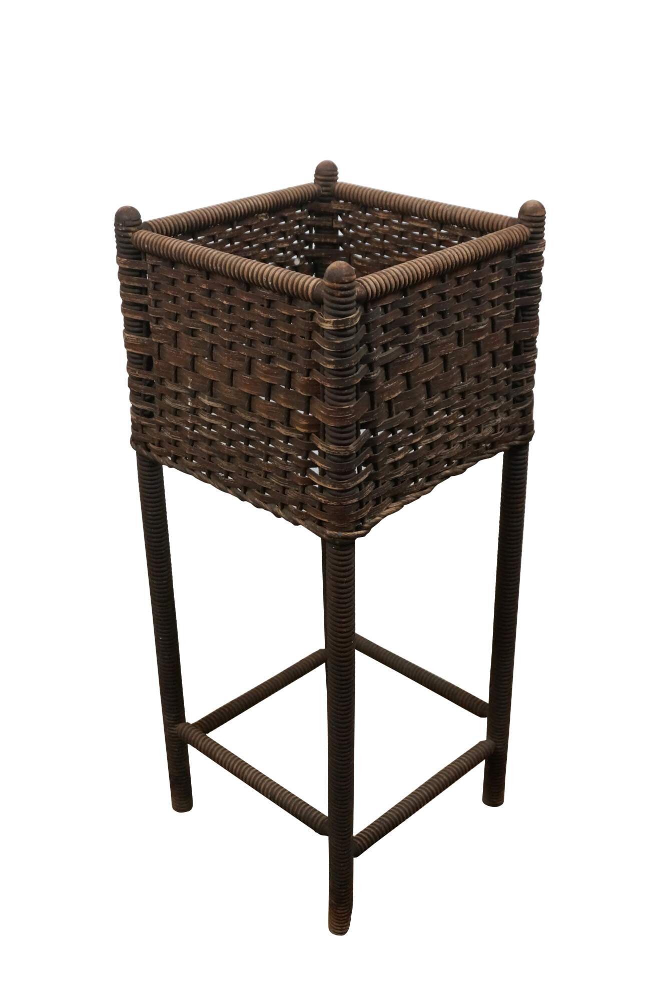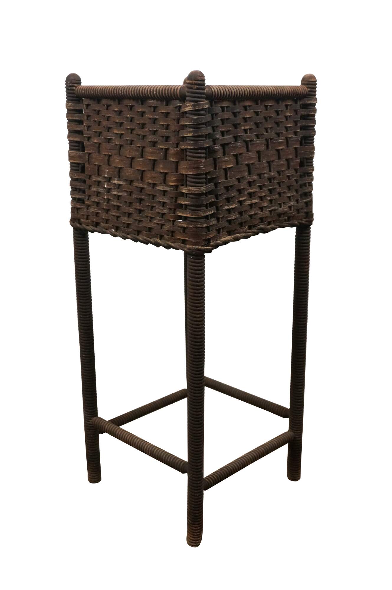 Vintage 20th century square basket plant stand with tight barley twist, turned wood legs and woven wicker sides. Fits insert up to 9.5.