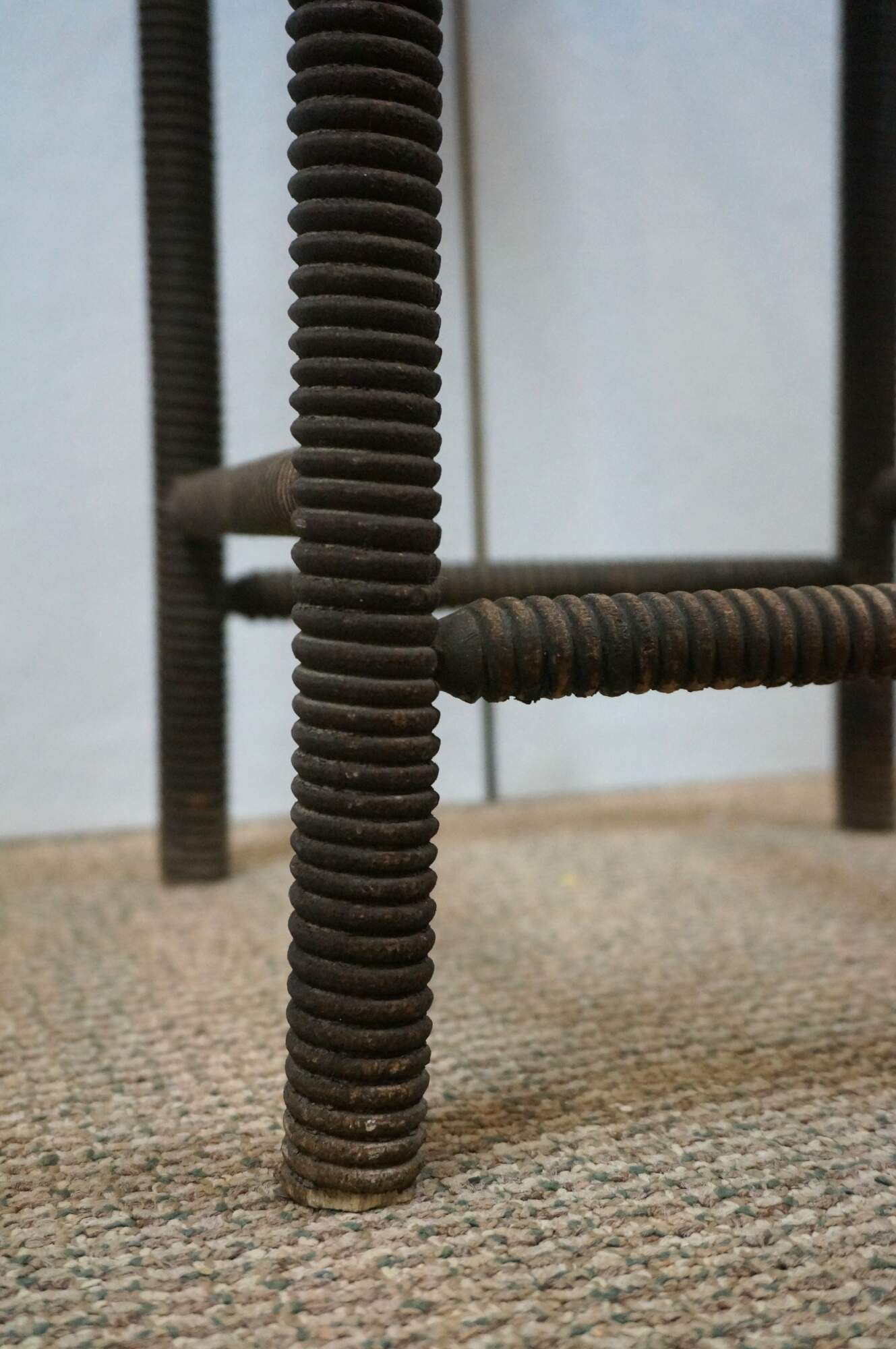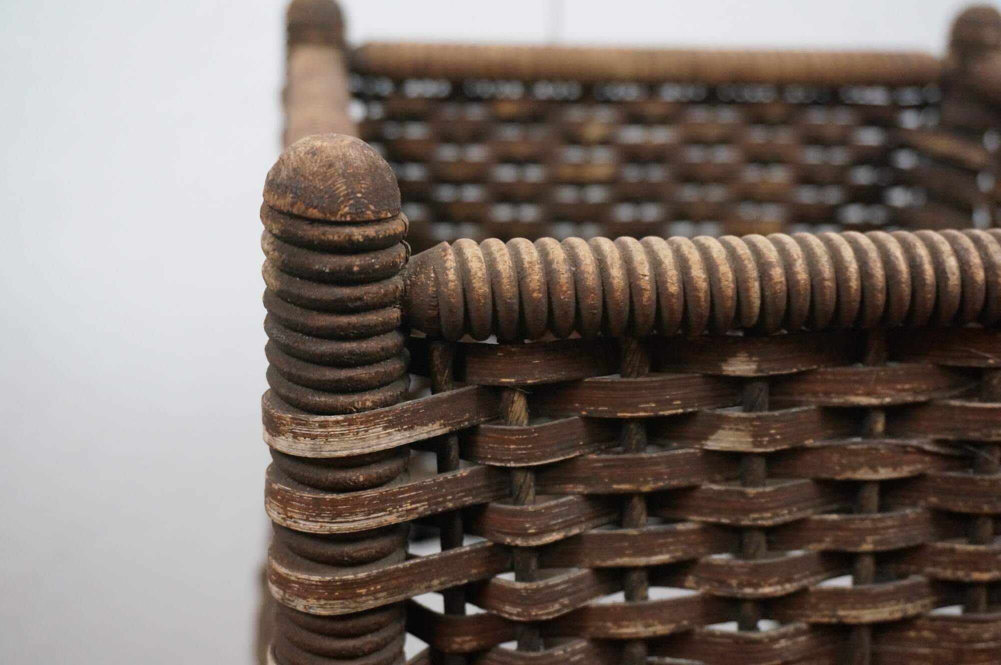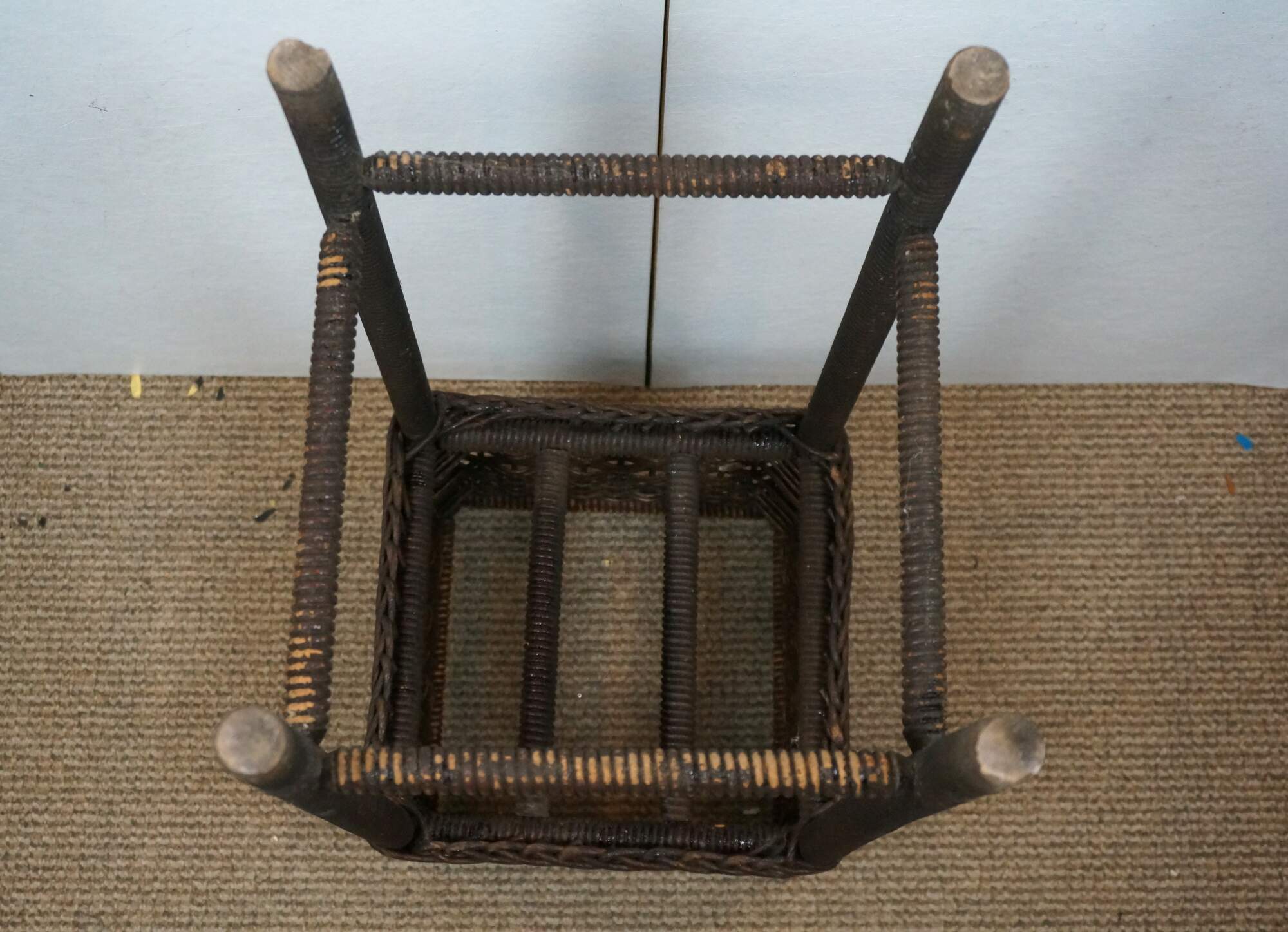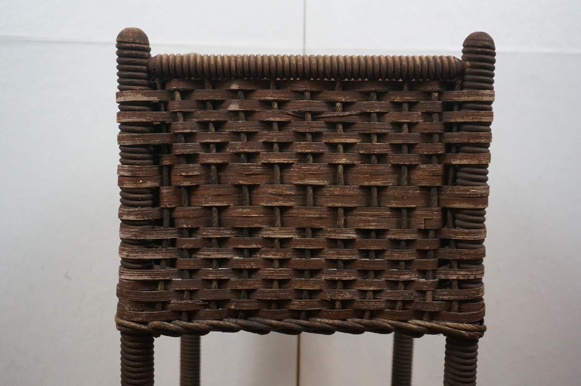 Vintage 20th century square basket plant stand with tight barley twist, turned wood legs and woven wicker sides. Fits insert up to 9.5.