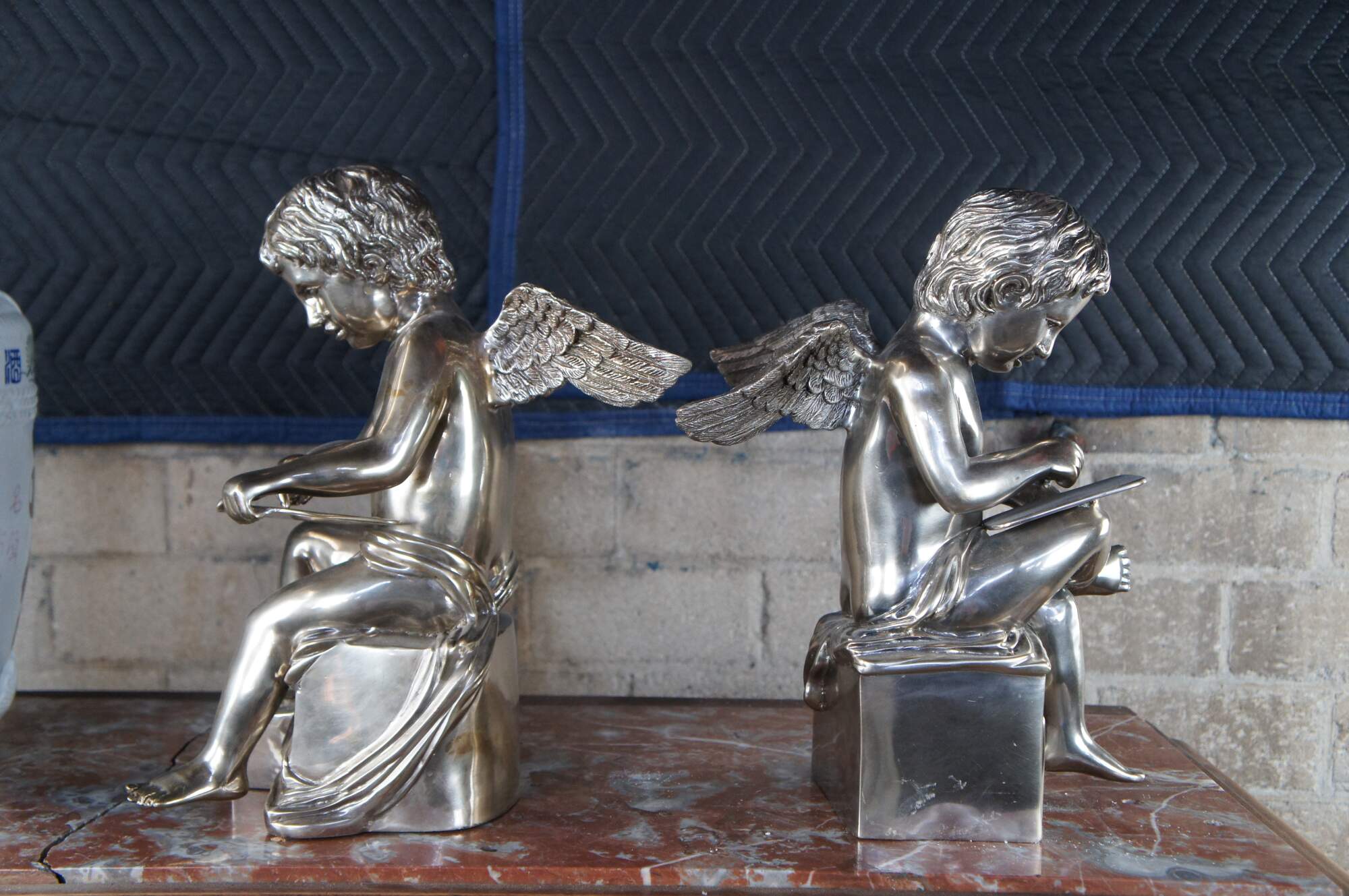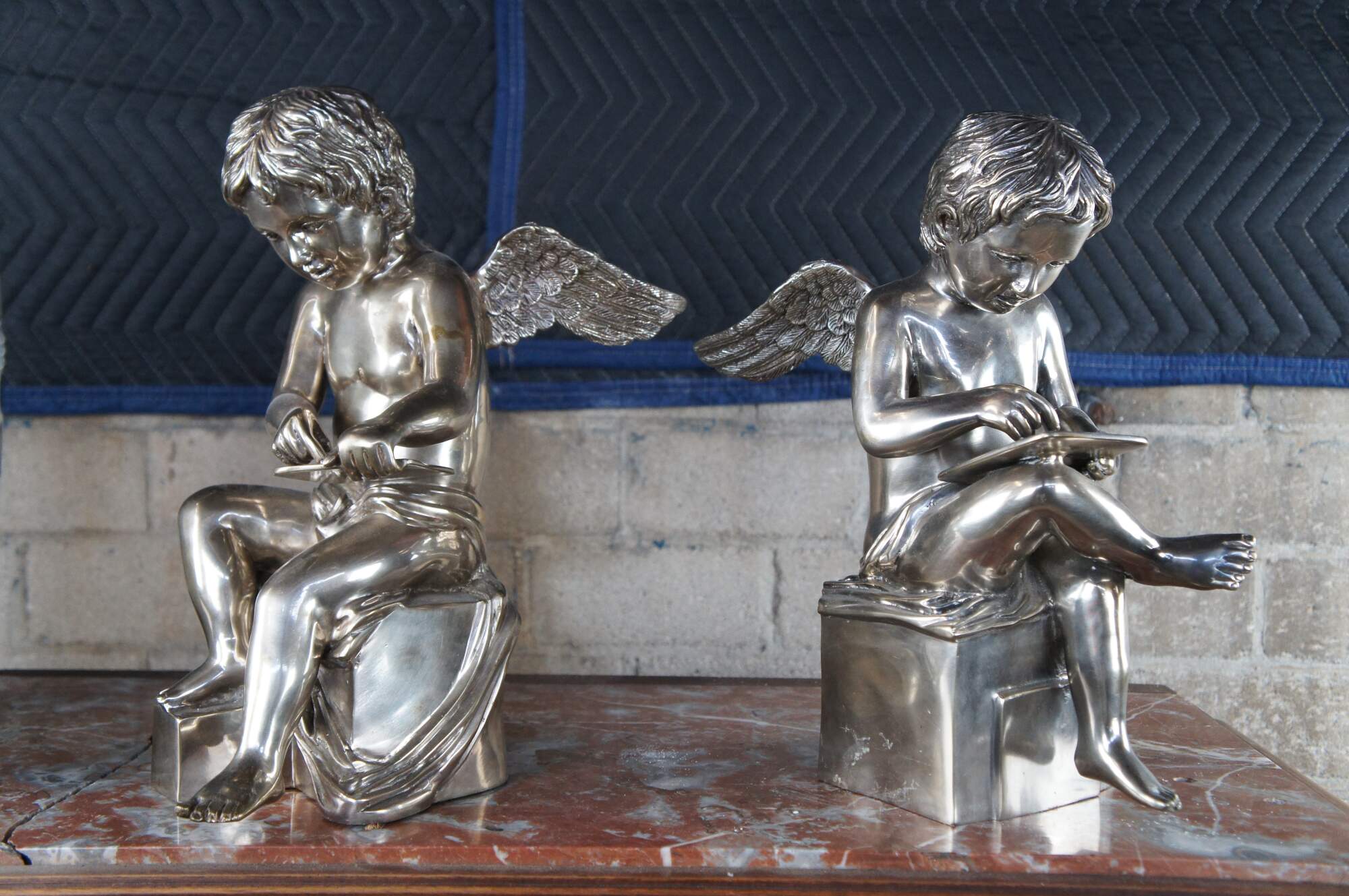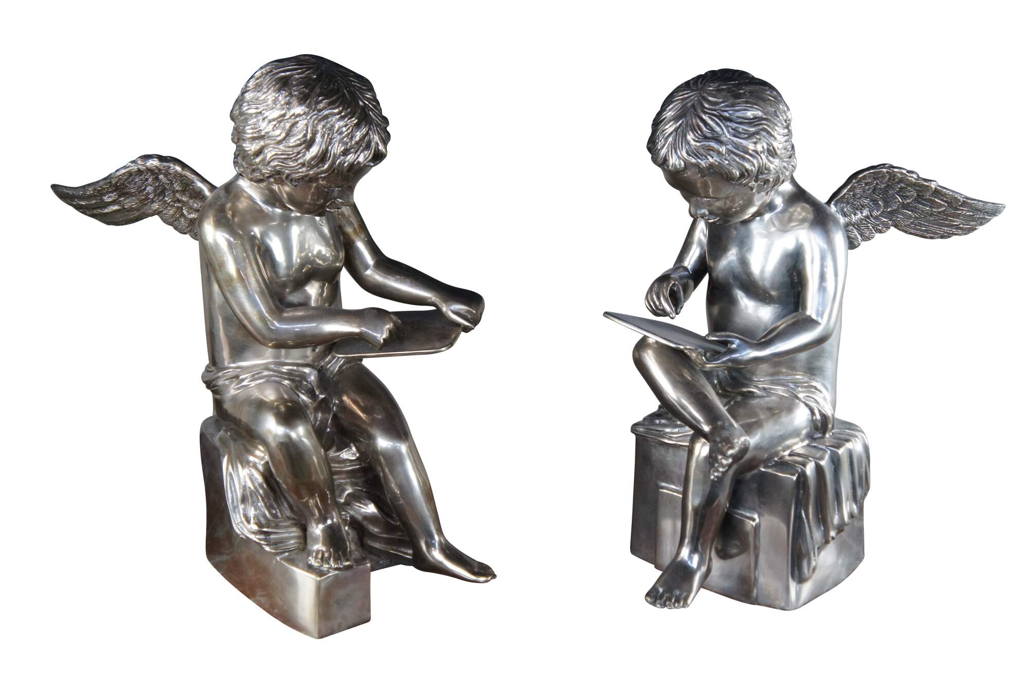 Set of silver hollowware sculptural angel figurines or bookends. Each boy is seated on a plinth with a tablet in hand and outstretched wings at the backside. A fun addition to any setting.