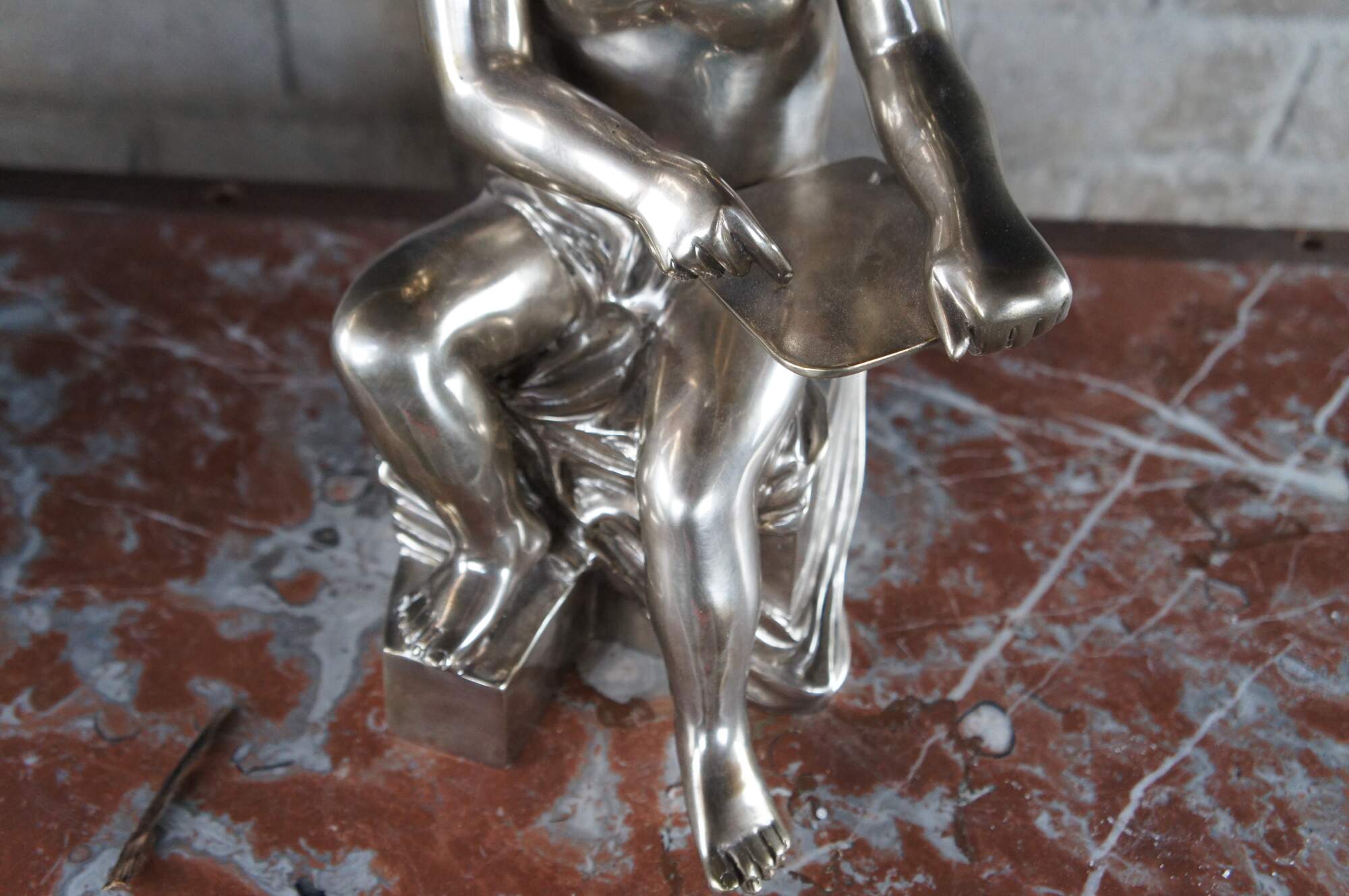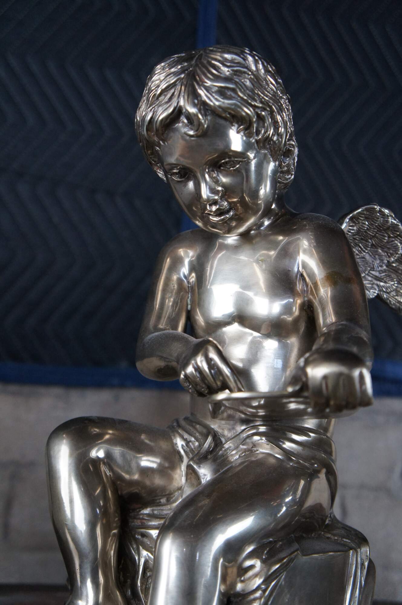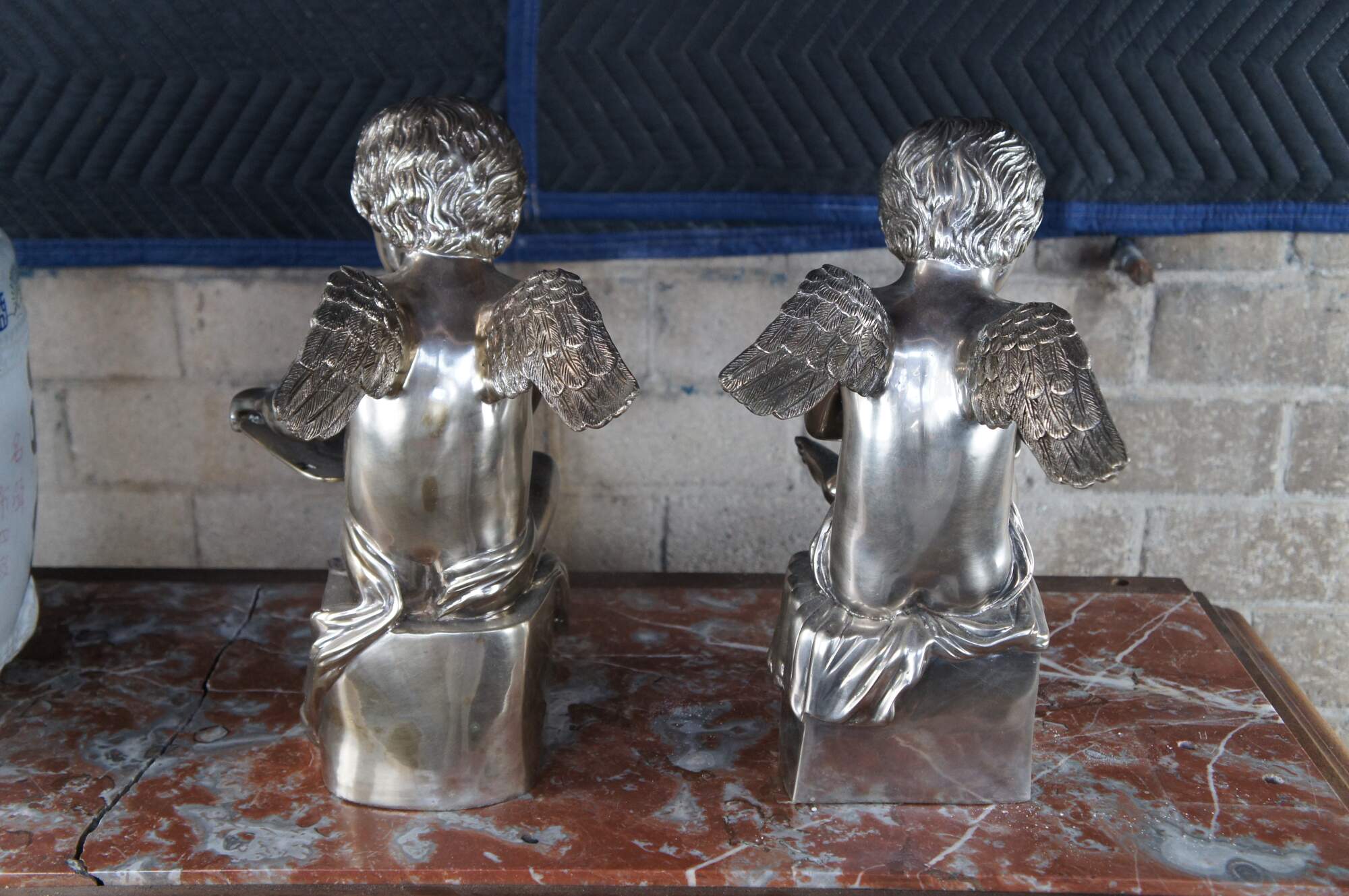 Set of silver hollowware sculptural angel figurines or bookends. Each boy is seated on a plinth with a tablet in hand and outstretched wings at the backside. A fun addition to any setting.
