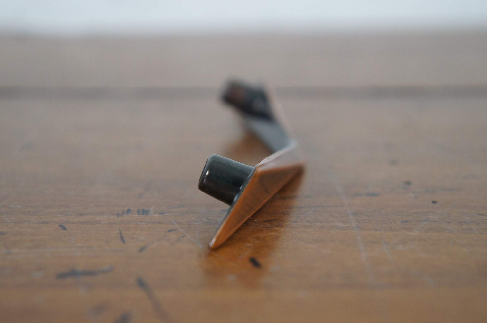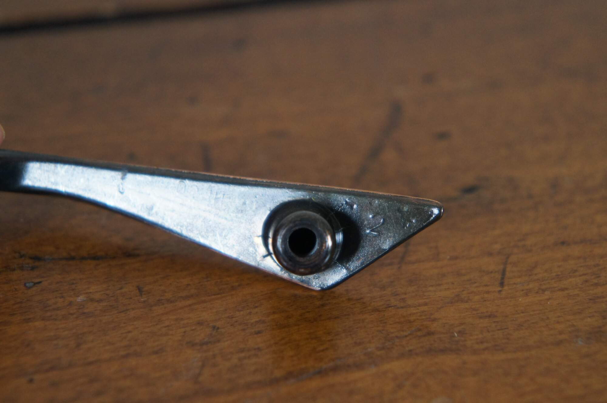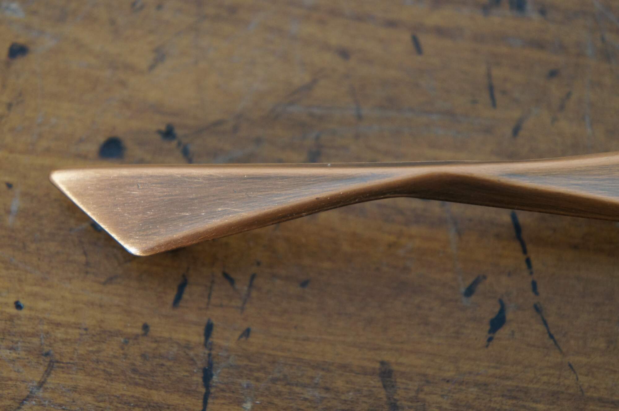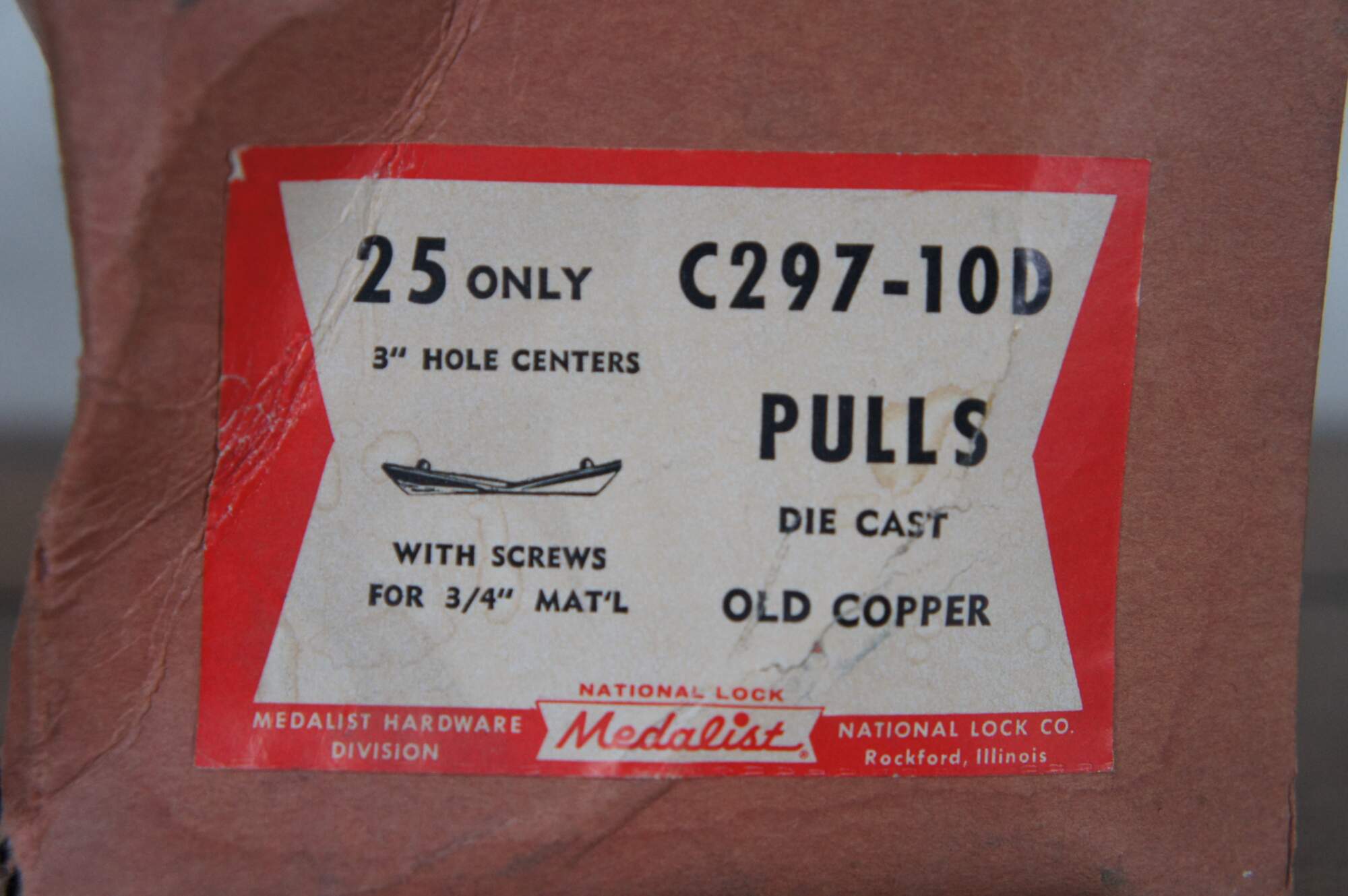 7 Available – art deco style National Lock Co Medalist hardware, item number C297-10D drawer pulls, die cast in a mid-century modern angular bow shape, in an Old Copper finish. 3" center hole, 3.375" length, scres included.
