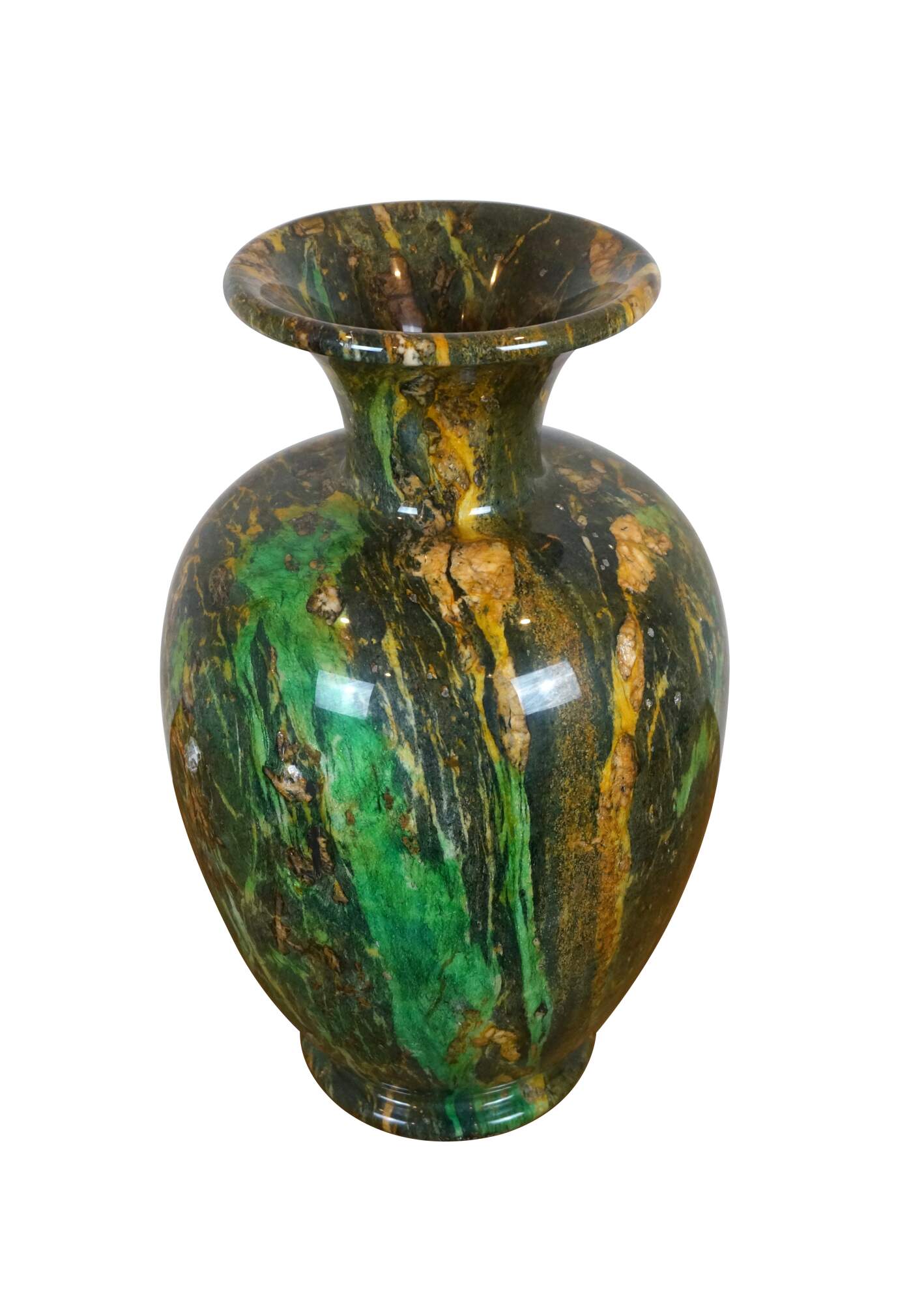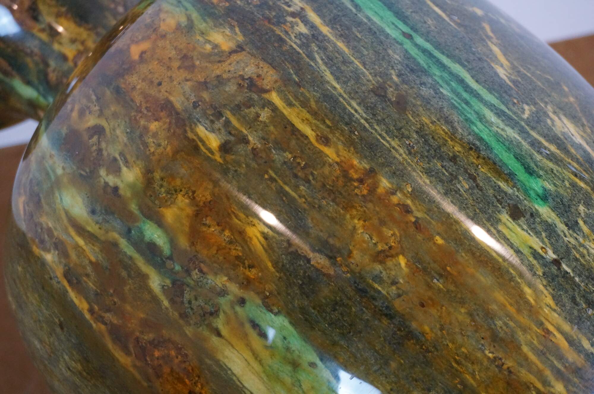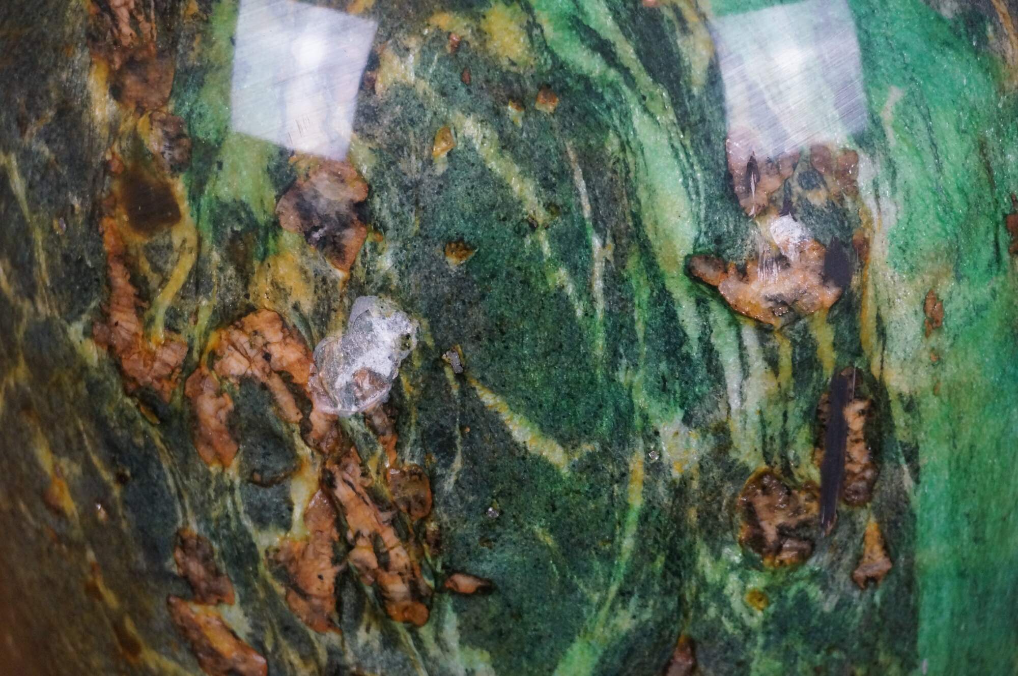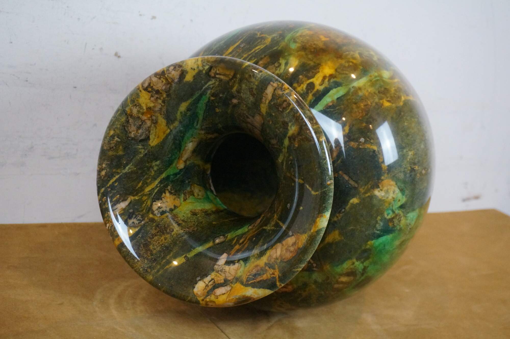 Vintage Chinese carved and polished jade/marble featuring shades of green with yellow, black, and bright green veining.
