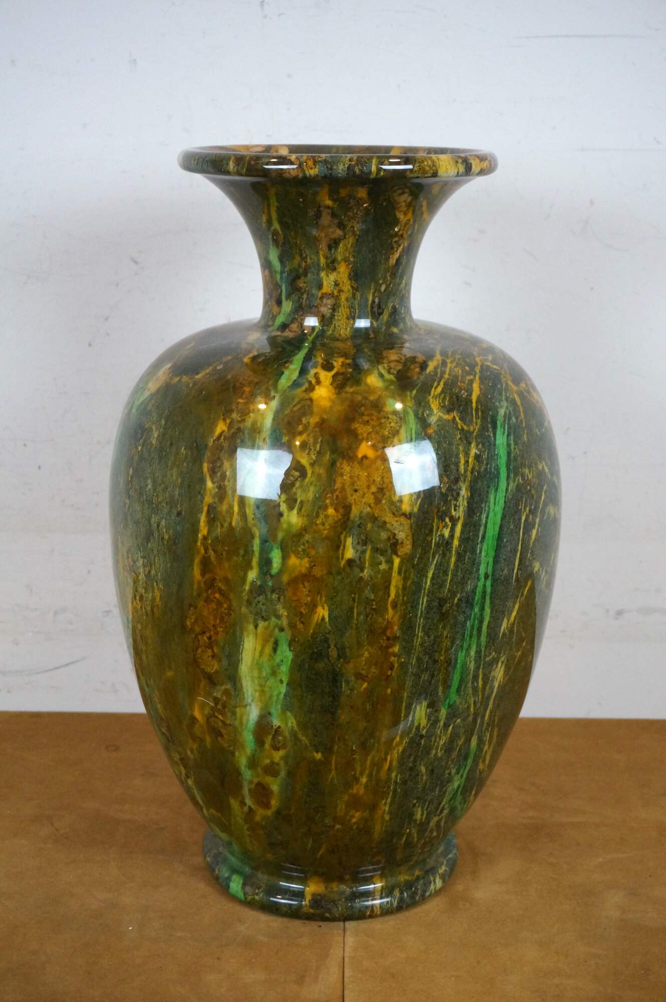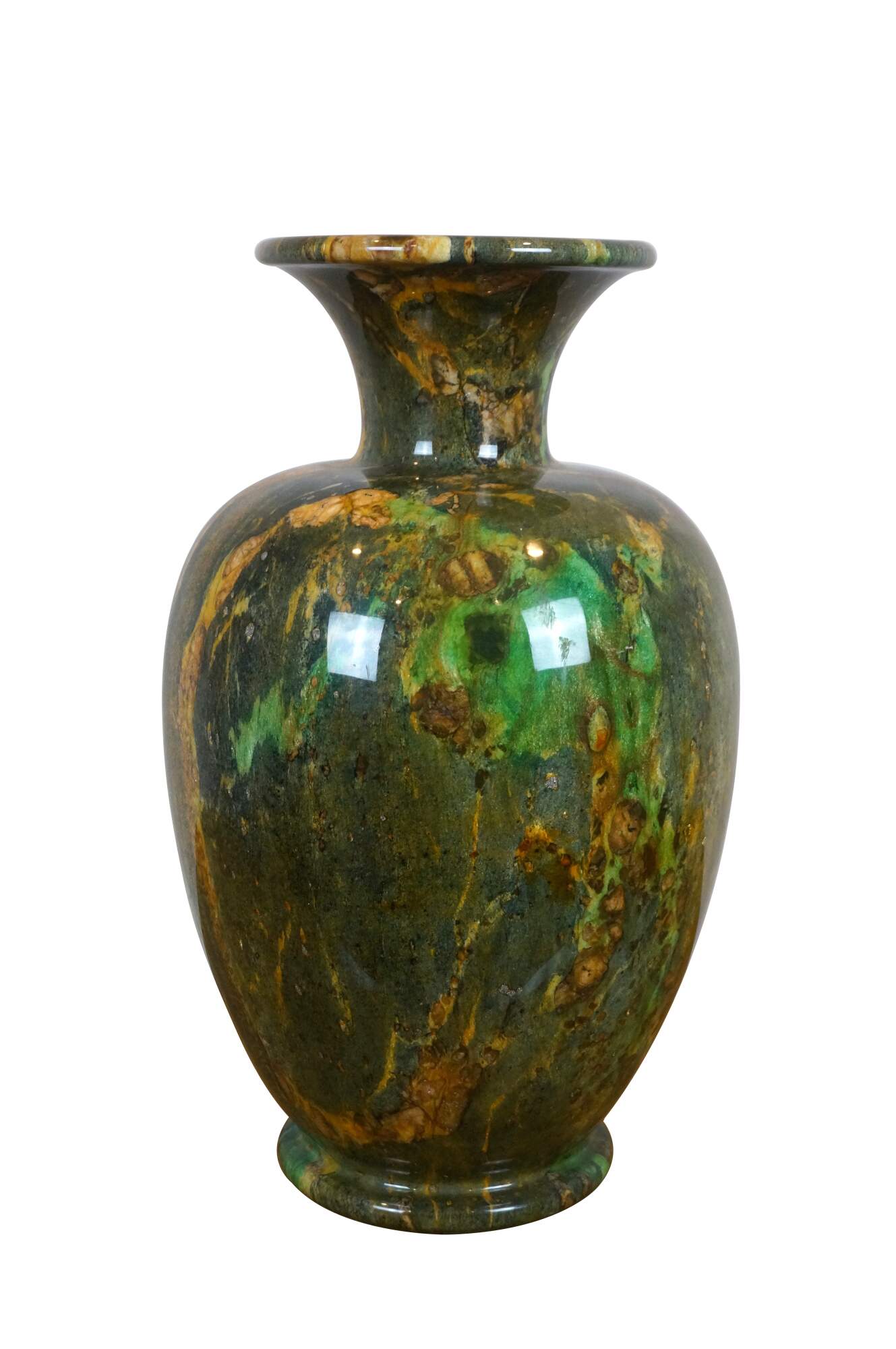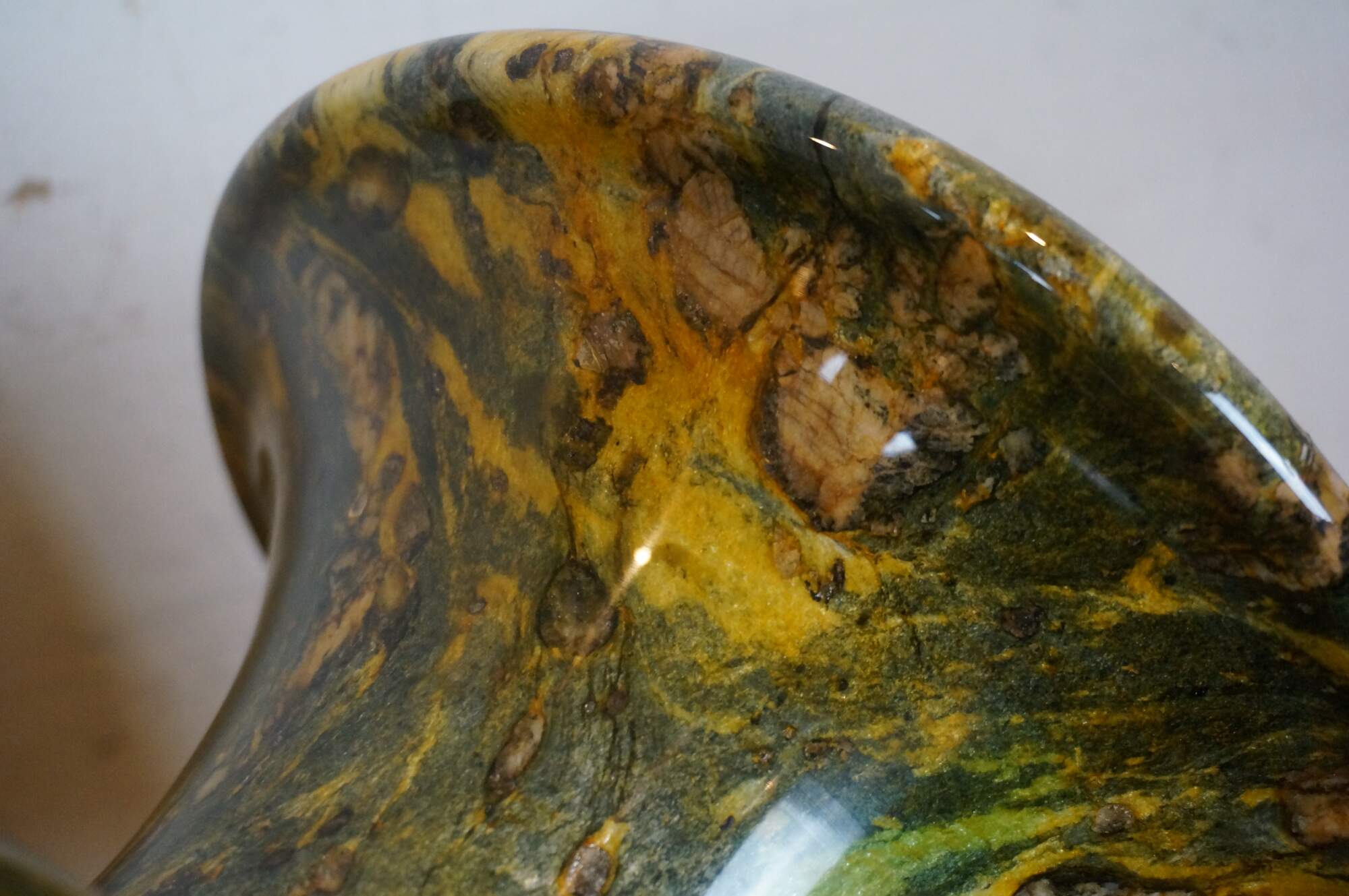 Vintage Chinese carved and polished jade/marble featuring shades of green with yellow, black, and bright green veining.