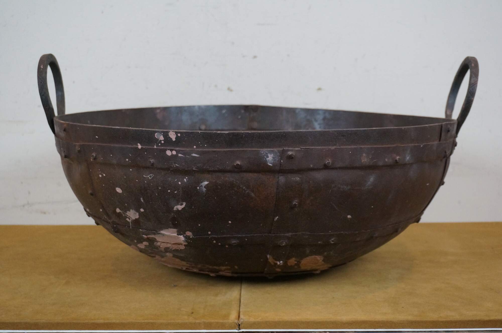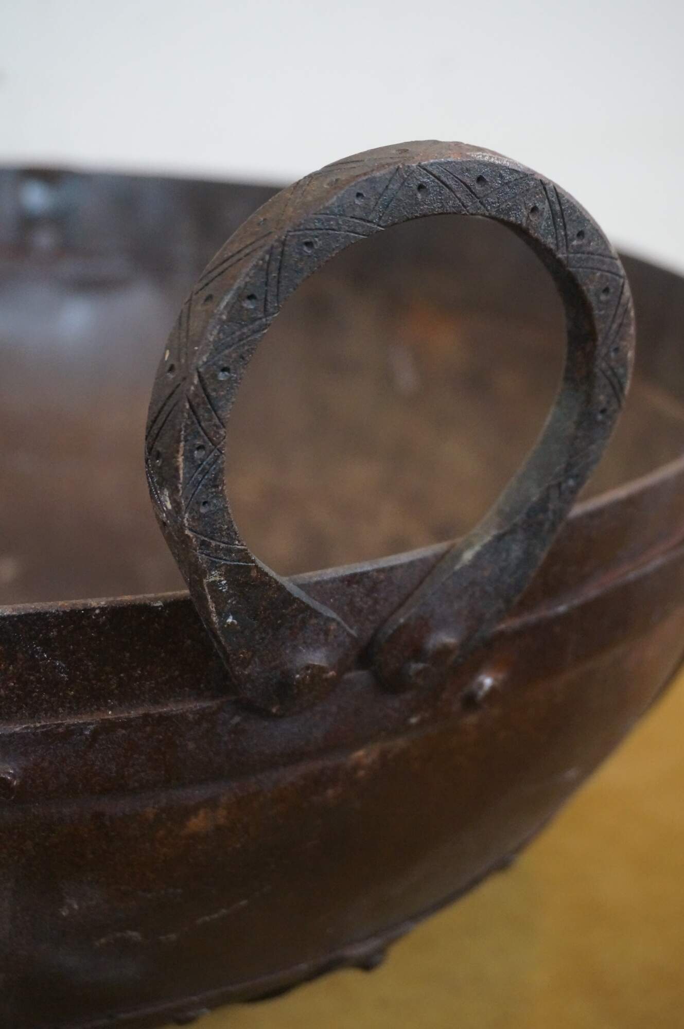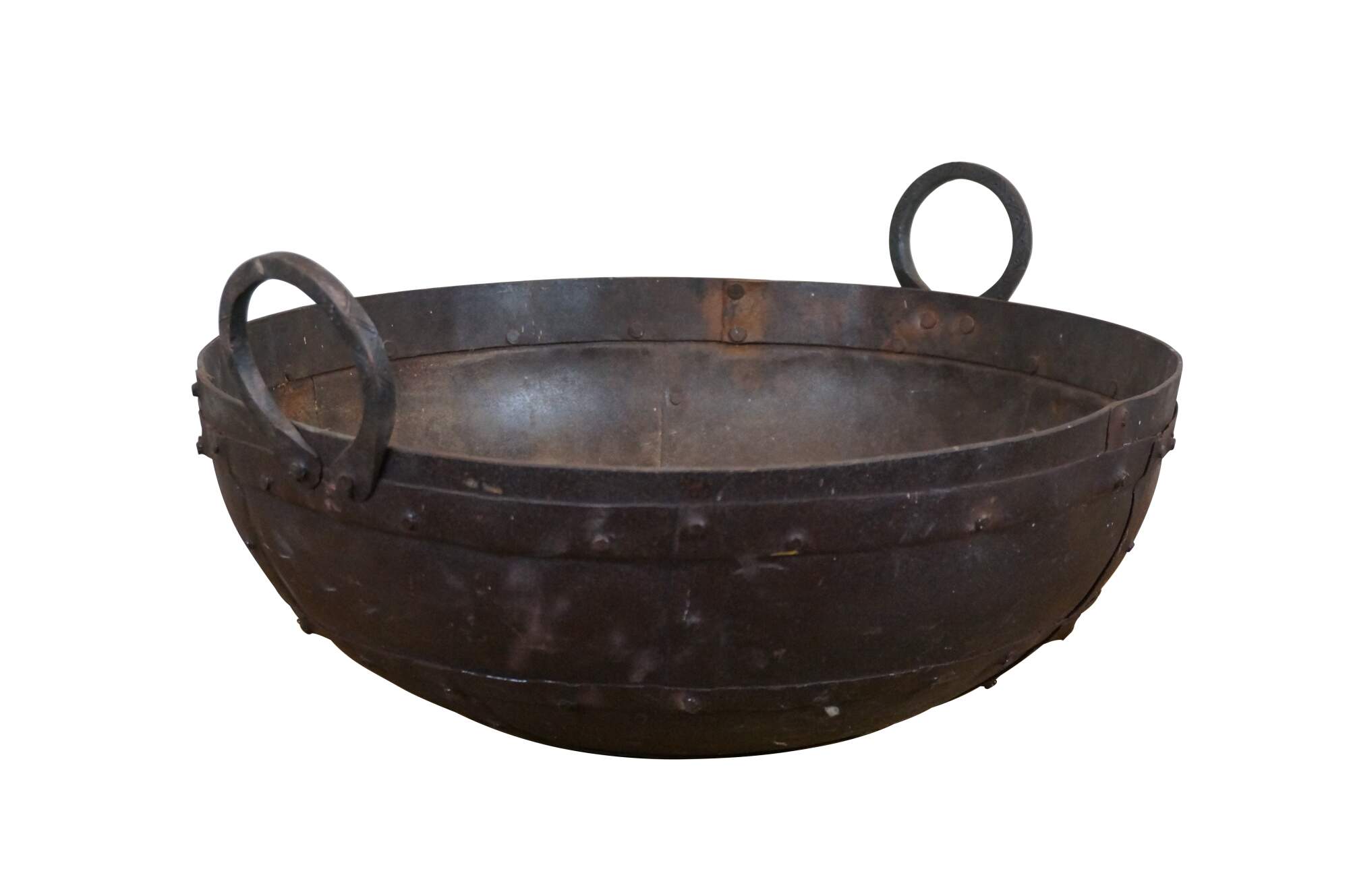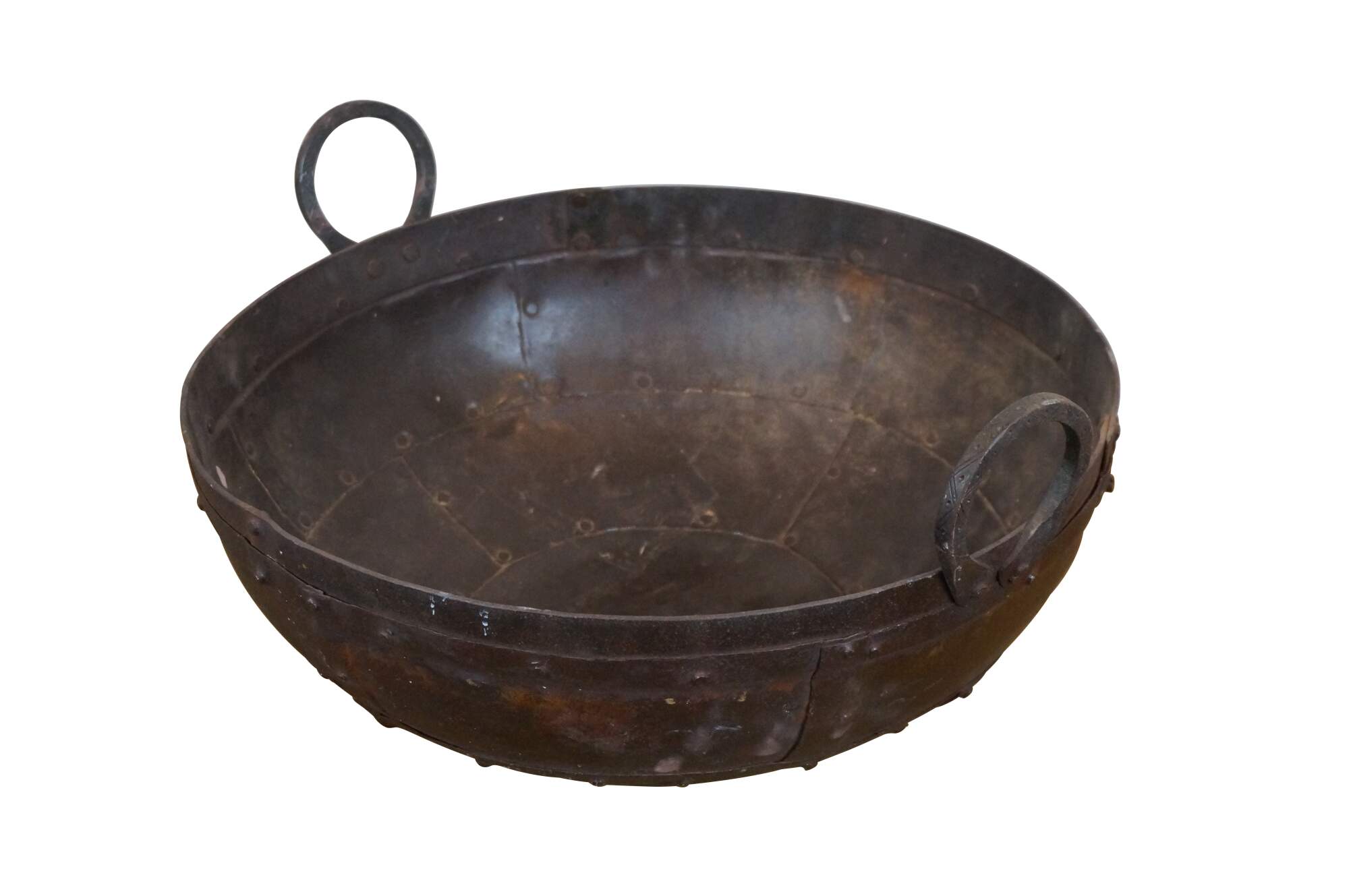 Vintage mid to early-century Indian kadai / kadhai fire pit / fire bowl. Round form with banded sides and two fixed handles, etched with geometric design.