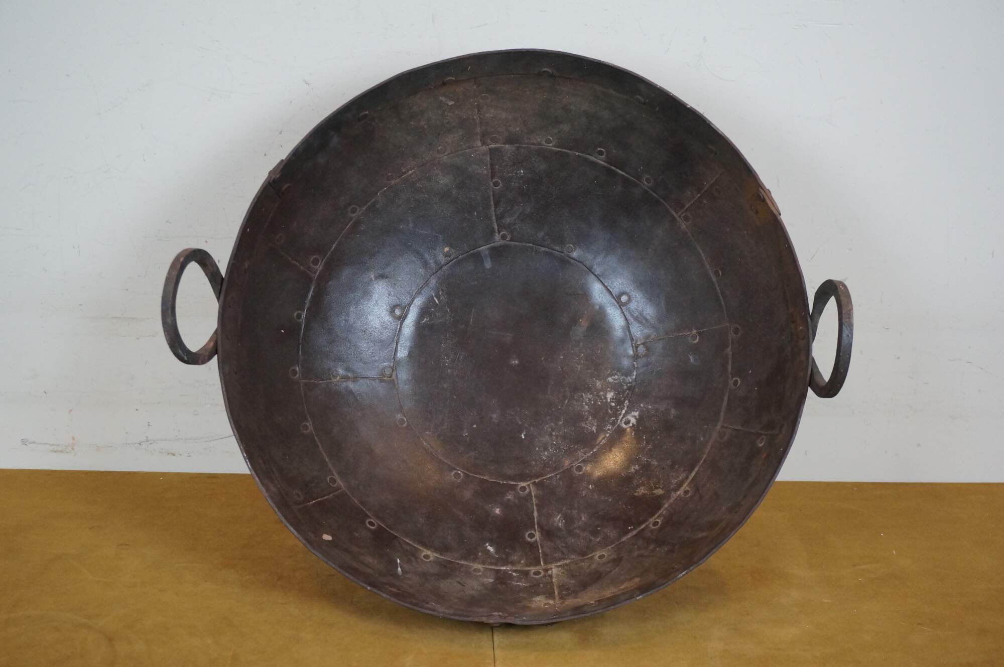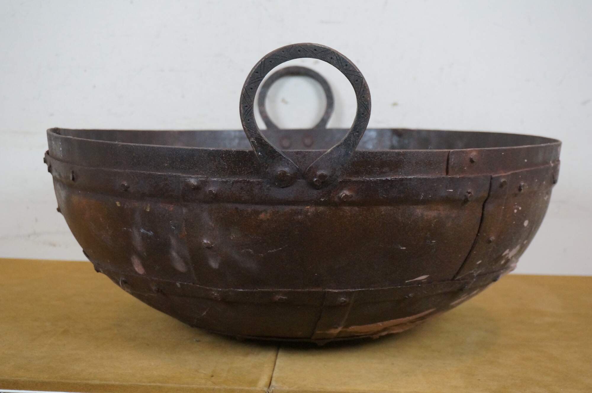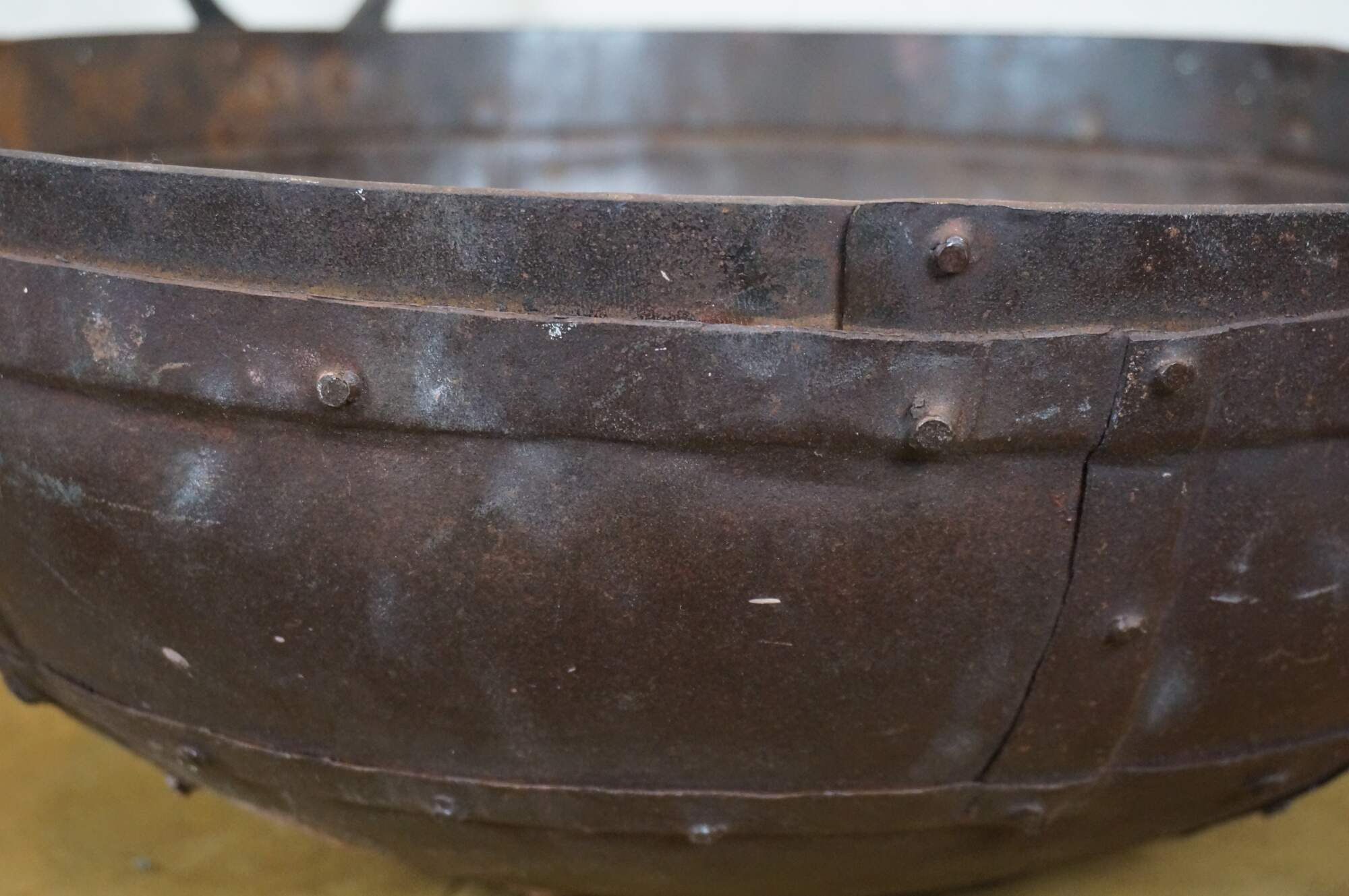 Vintage mid to early-century Indian kadai / kadhai fire pit / fire bowl. Round form with banded sides and two fixed handles, etched with geometric design.
