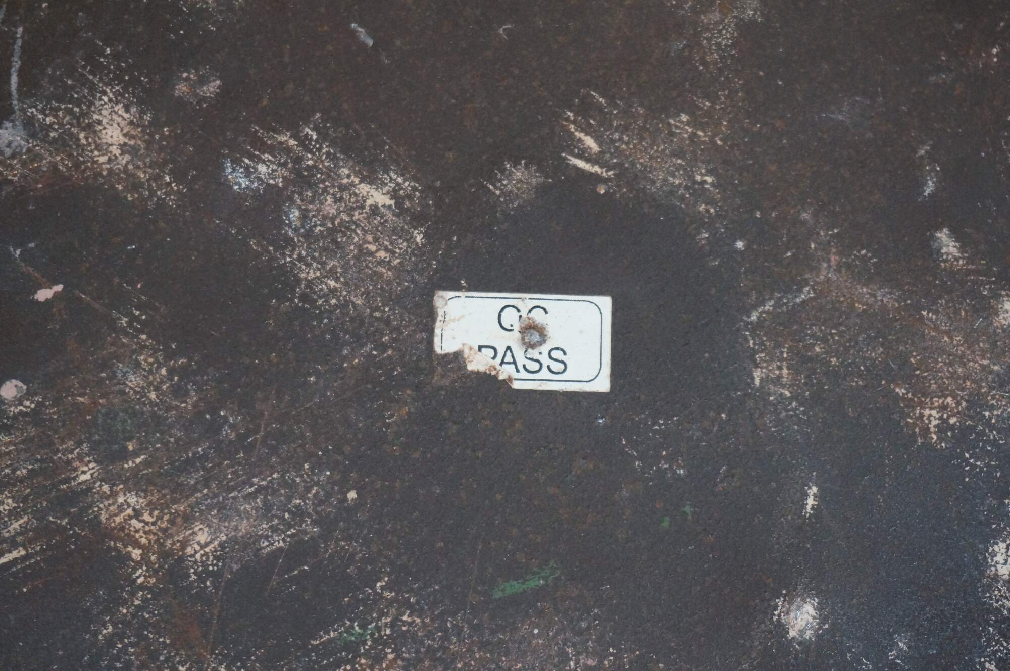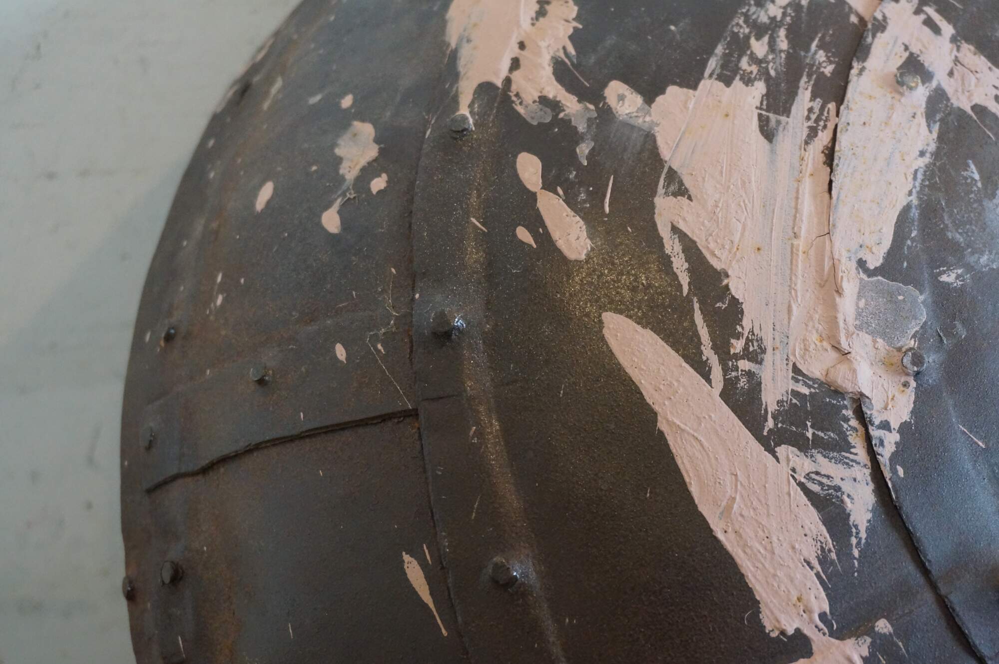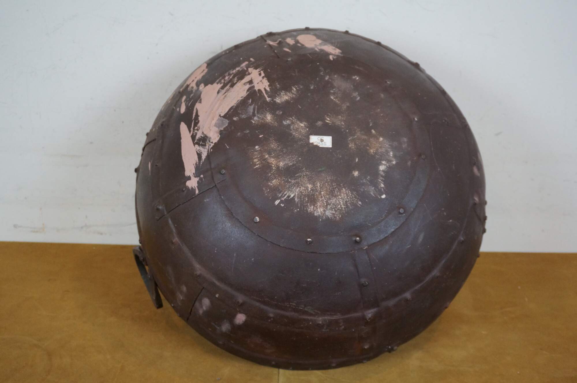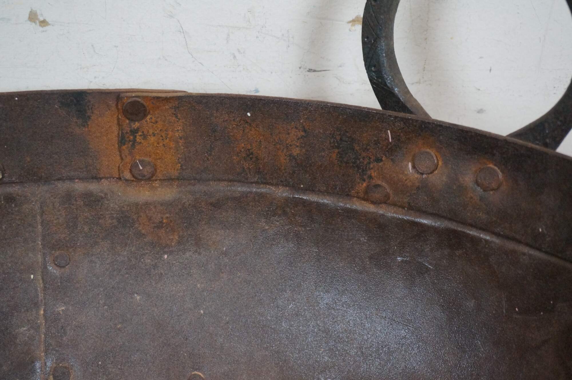Vintage mid to early-century Indian kadai / kadhai fire pit / fire bowl. Round form with banded sides and two fixed handles, etched with geometric design.
