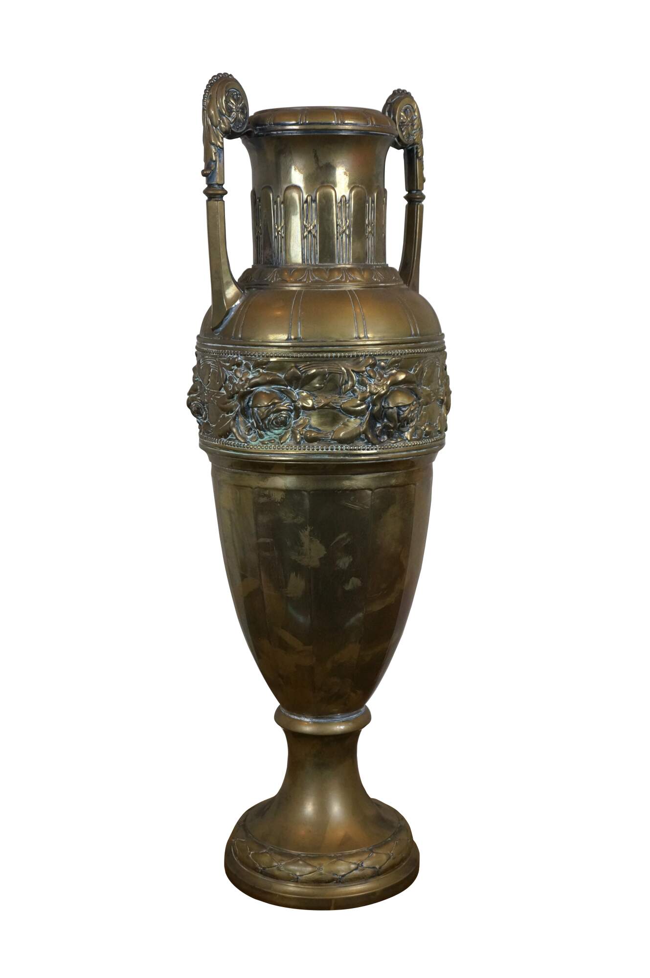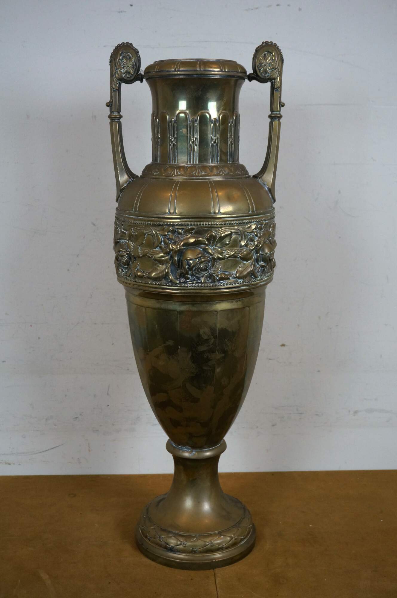 Vintage Neoclassical Empire-style tall brass urn / cassolette / amphora vase with scrolled handles and a repousse band showing a vine of roses and small blossoms winding around bundled staves.