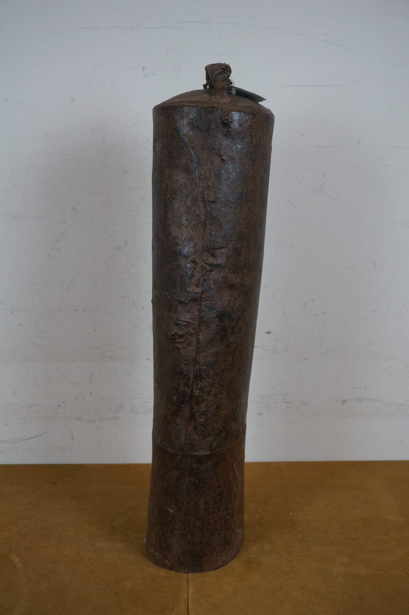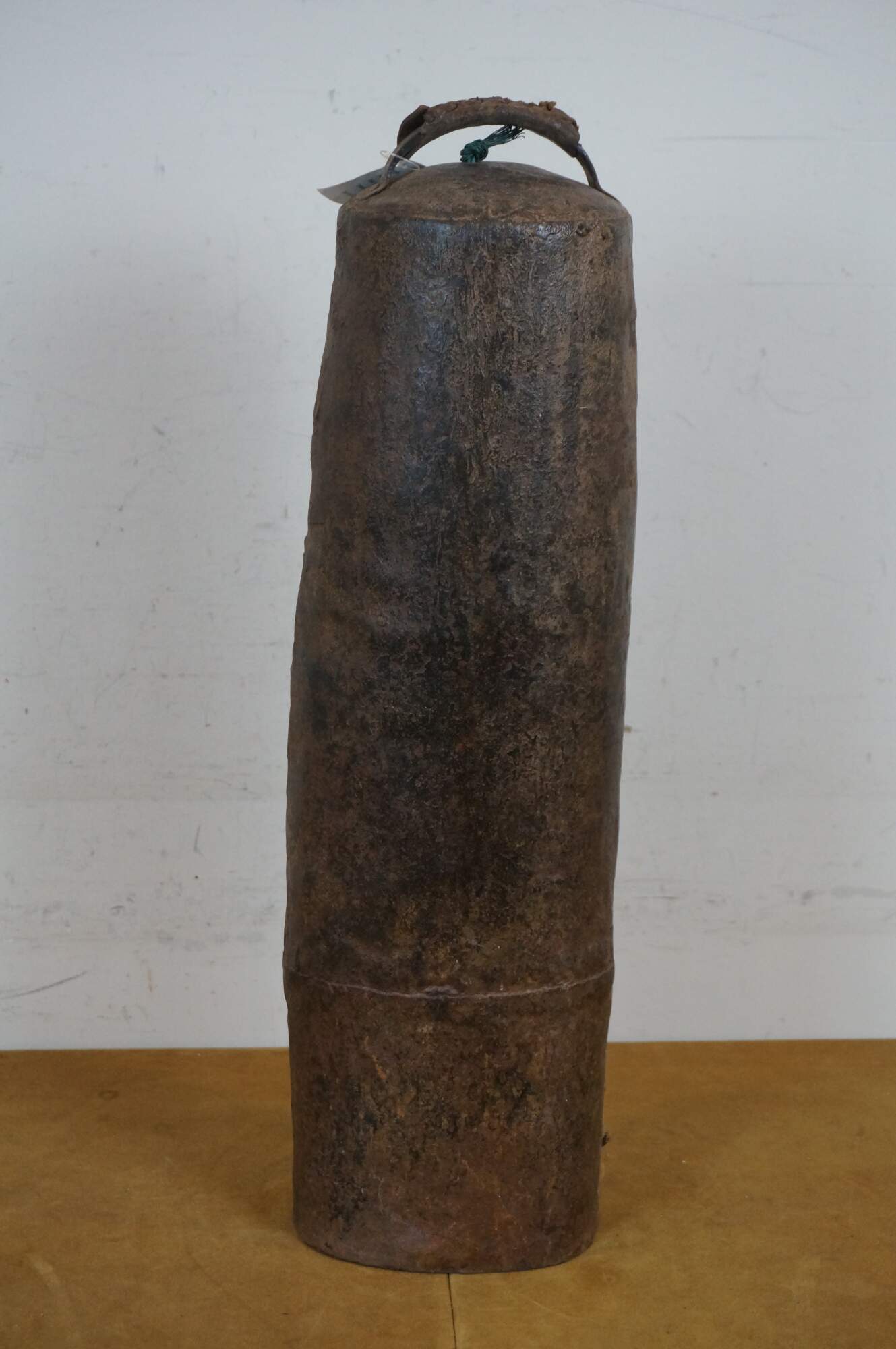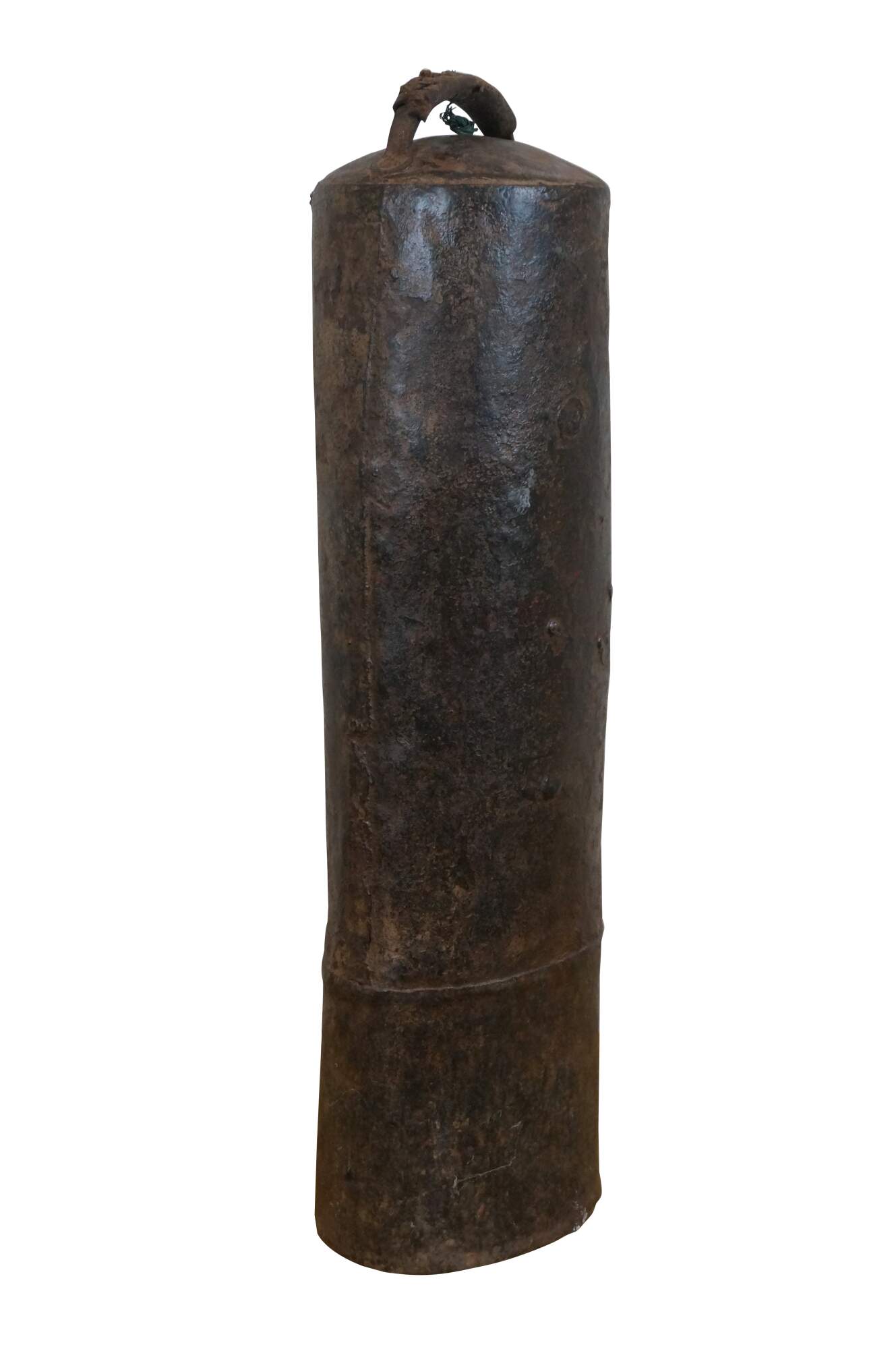 Antique iron camel / cow / horse / livestock bell (loutuo lingdang) - long, narrow, cylindrical form with a leather-wrapped handle on top and a brush-wrapped clapper.