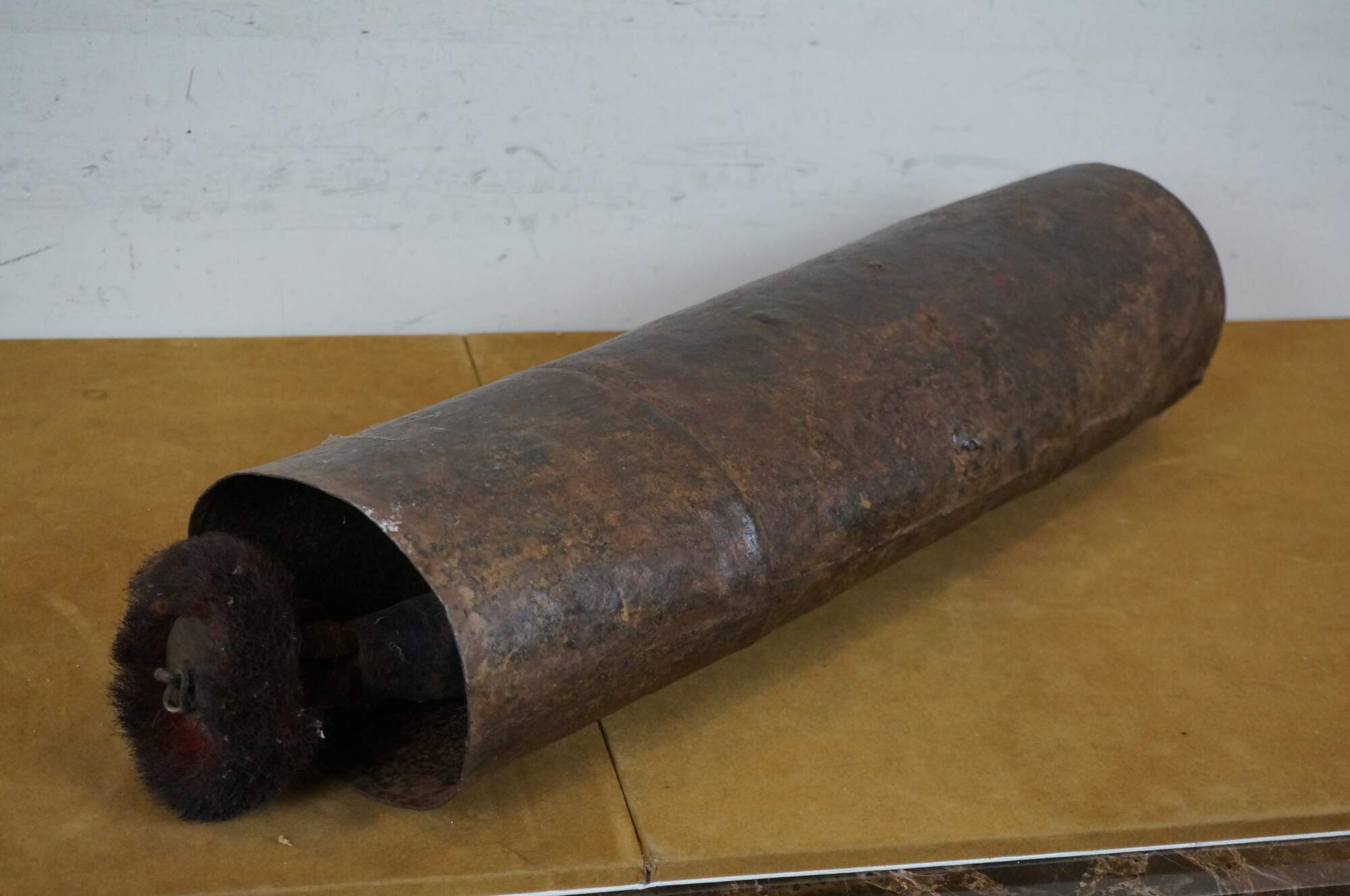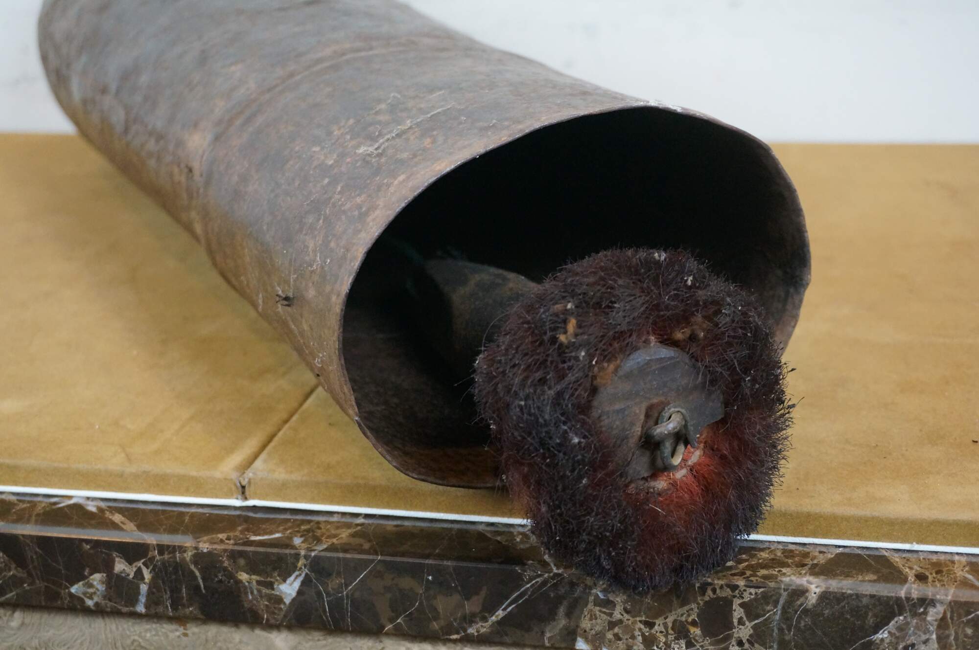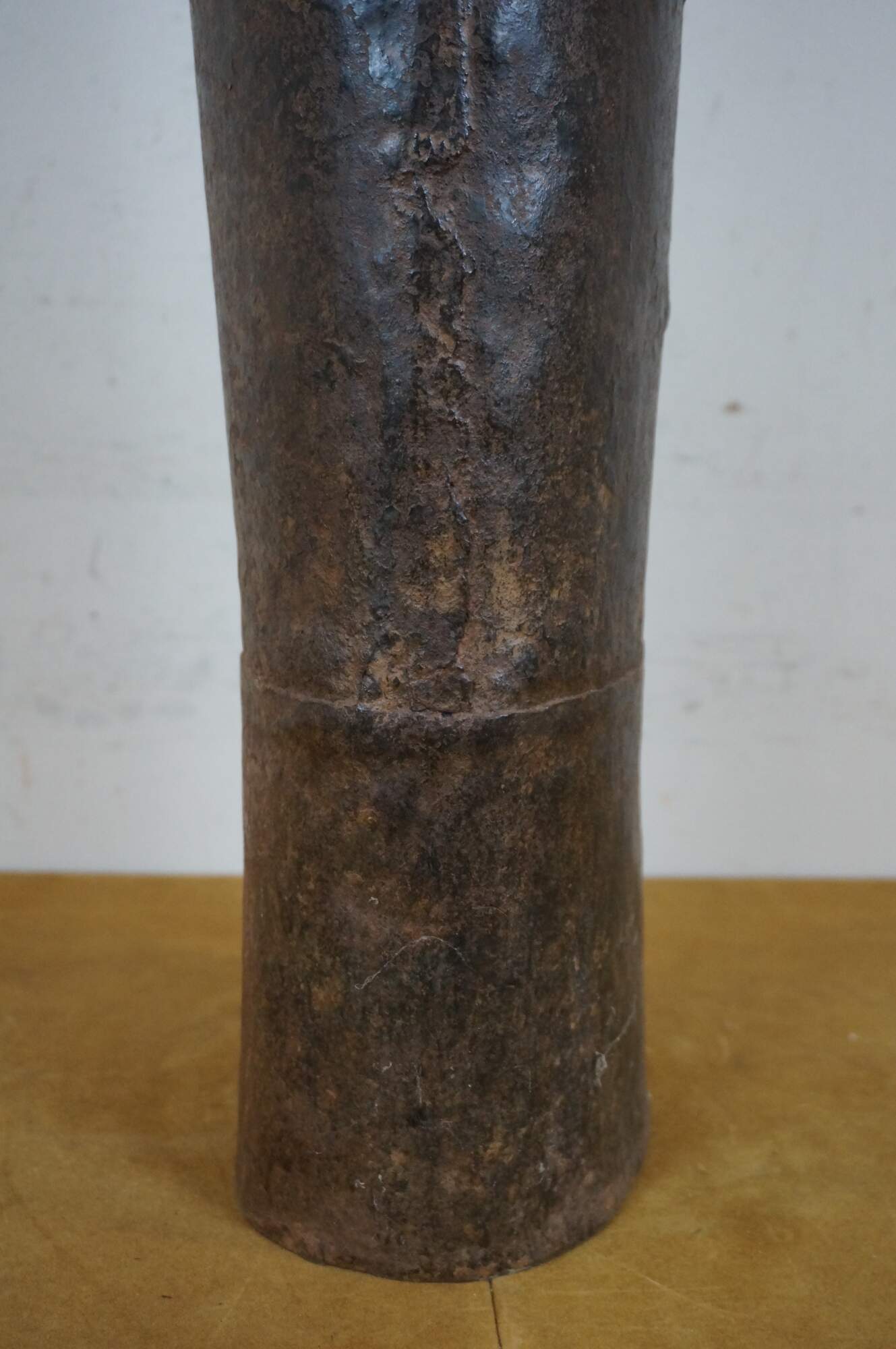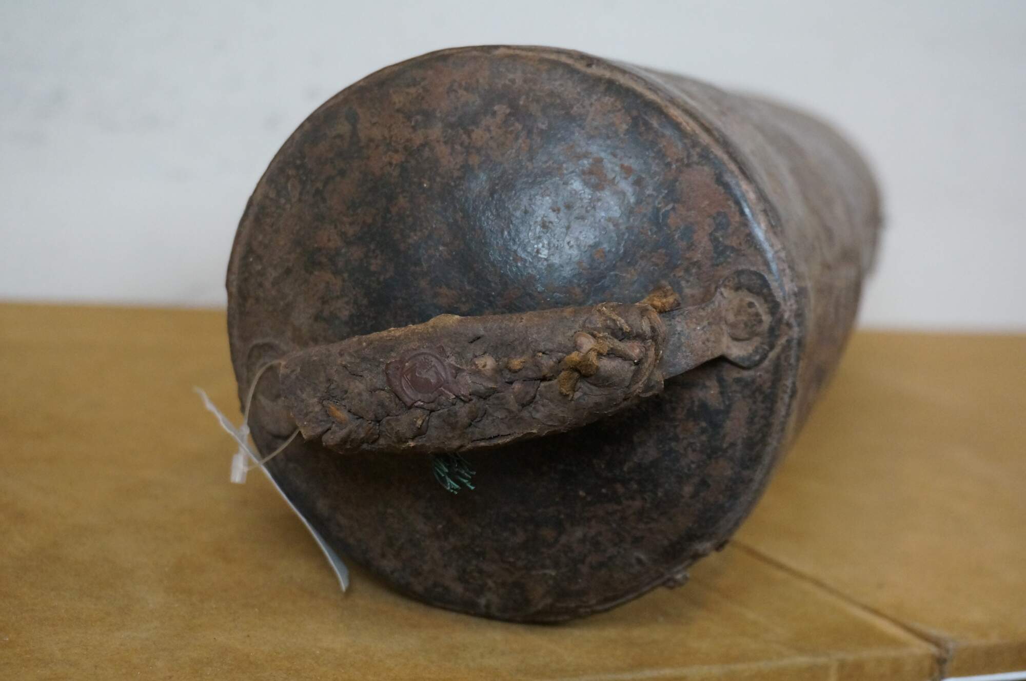 Antique iron camel / cow / horse / livestock bell (loutuo lingdang) - long, narrow, cylindrical form with a leather-wrapped handle on top and a brush-wrapped clapper.