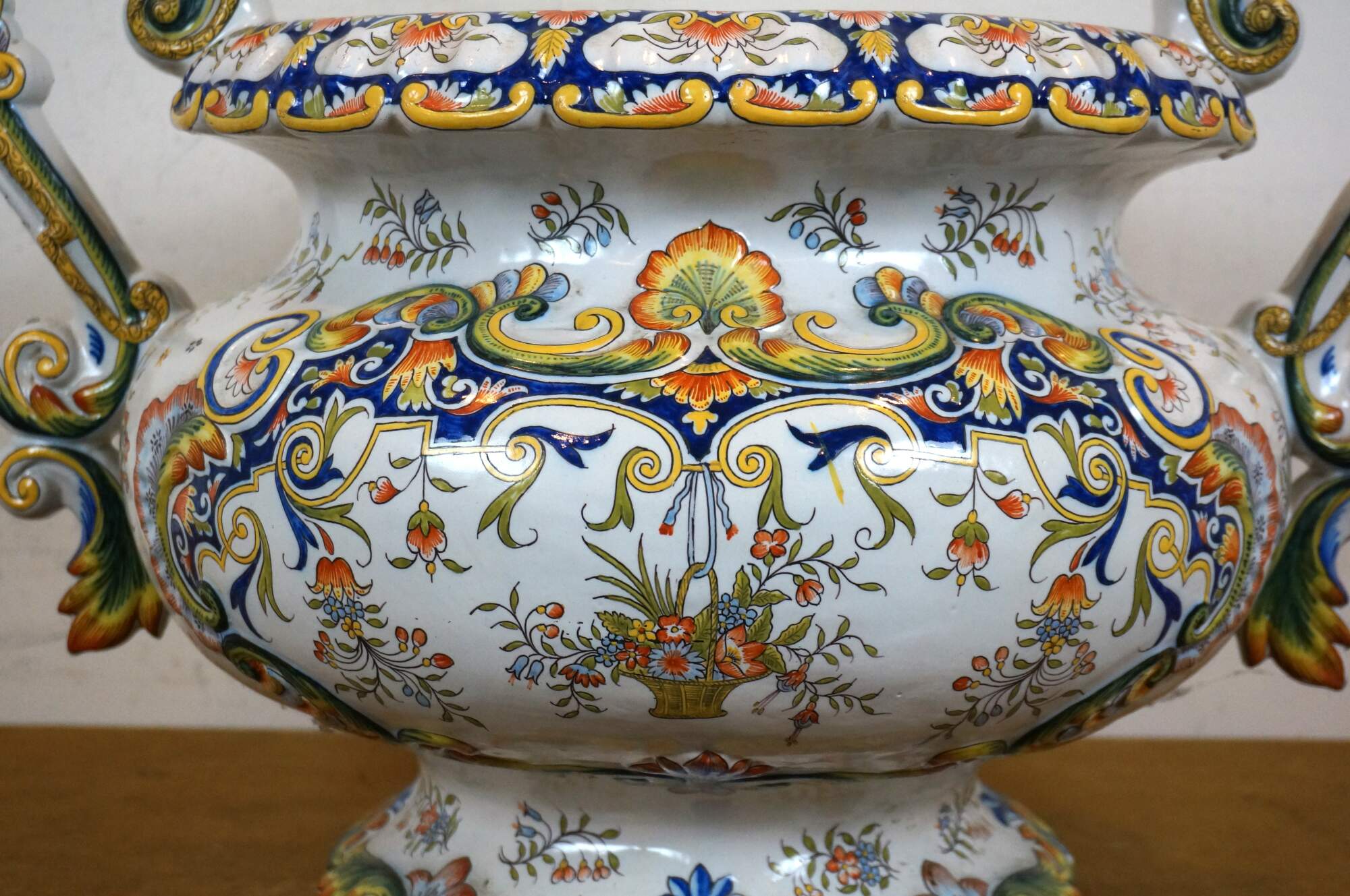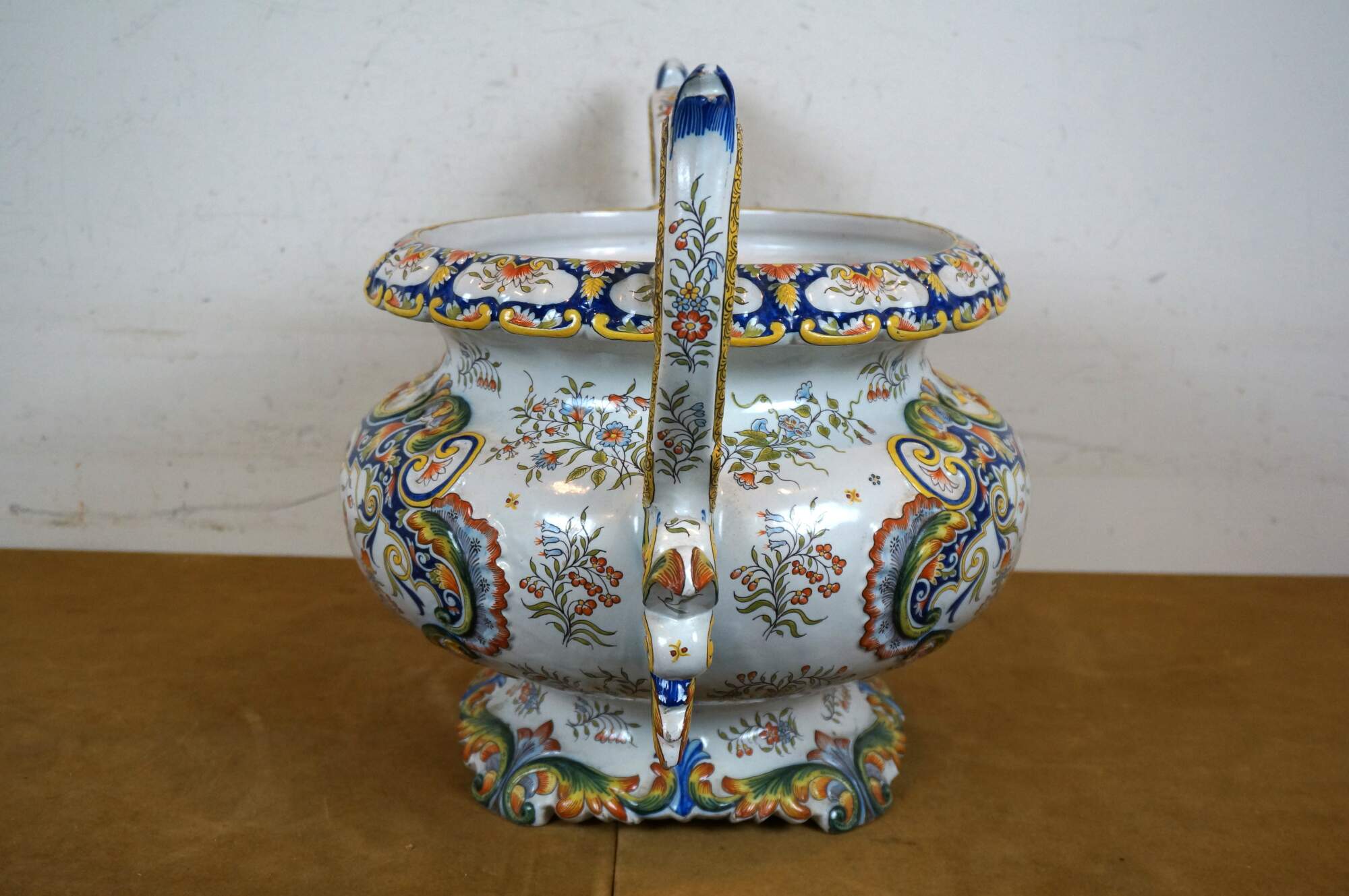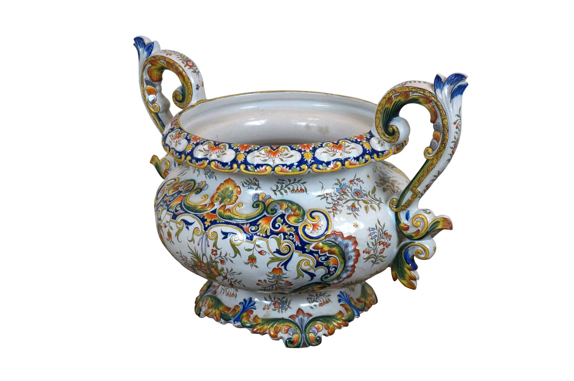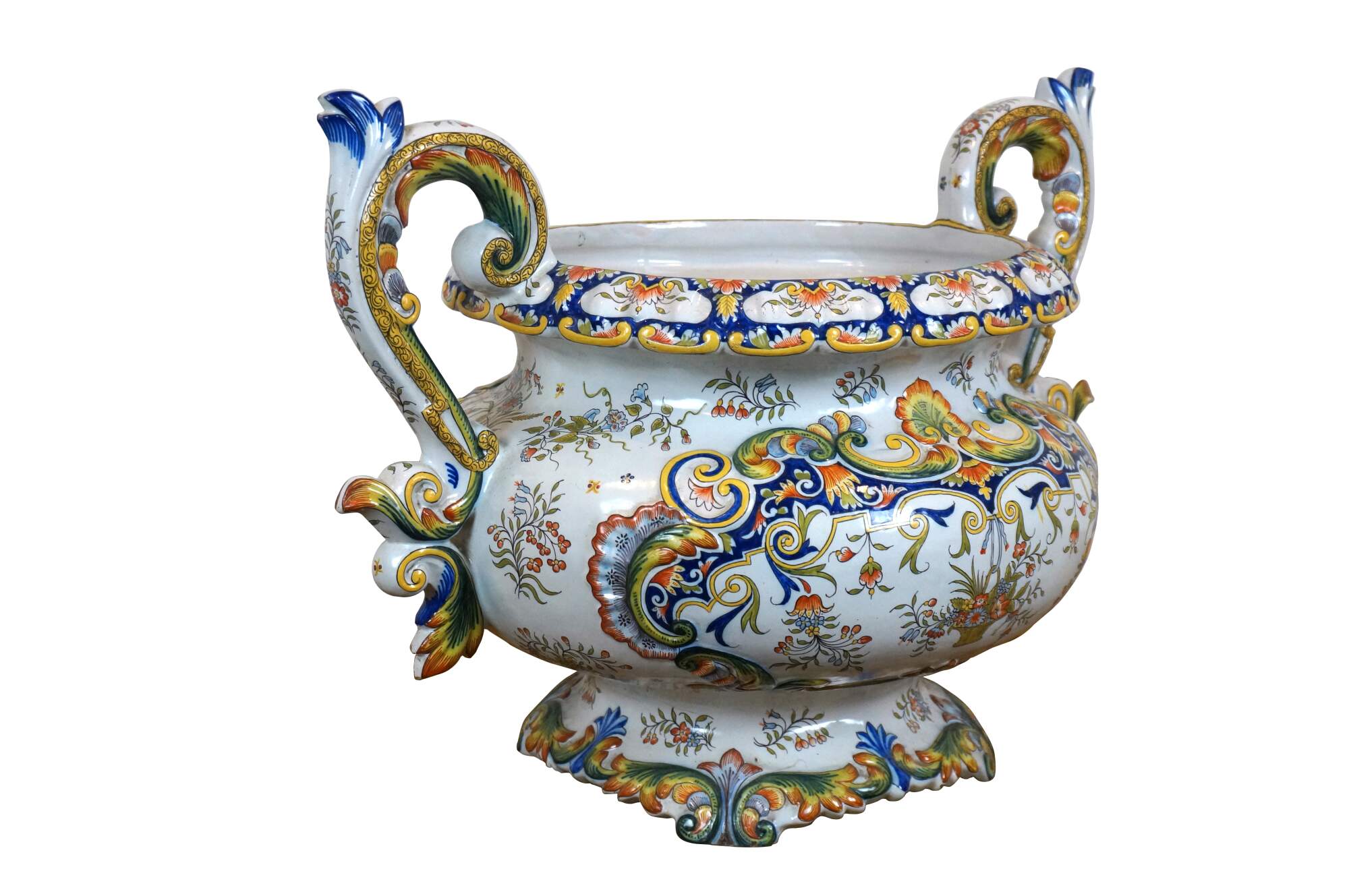 Antique French faience enameled porcelain urn / jardiniere / planter / cachepot featuring an ornate swirling foliate and floral design in blue, yellow, and orange on a white ground. Tapered oval shape with scalloped base and rim, and two scrolling foliate handles.