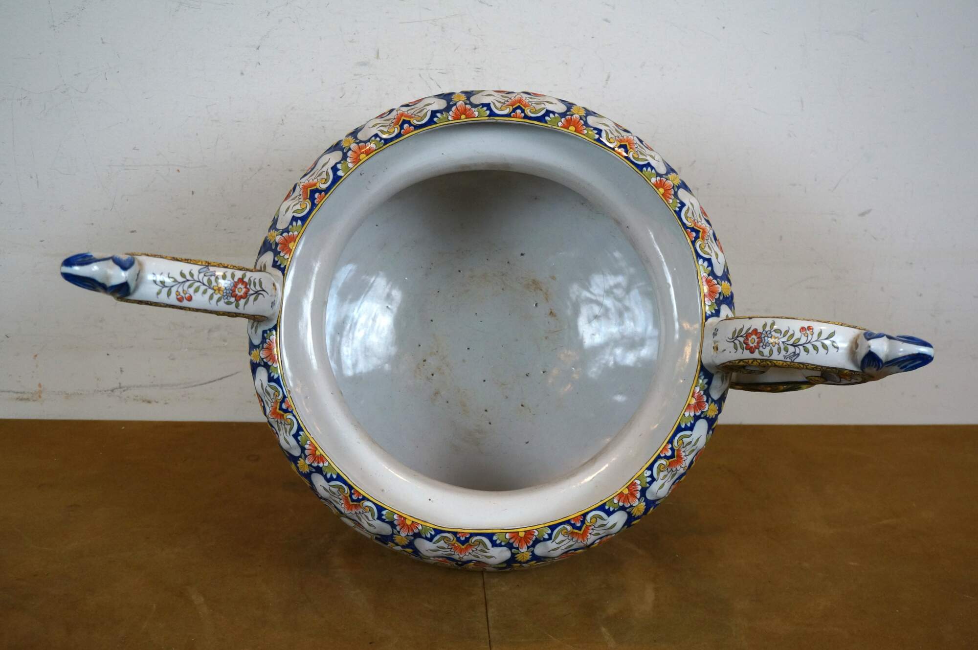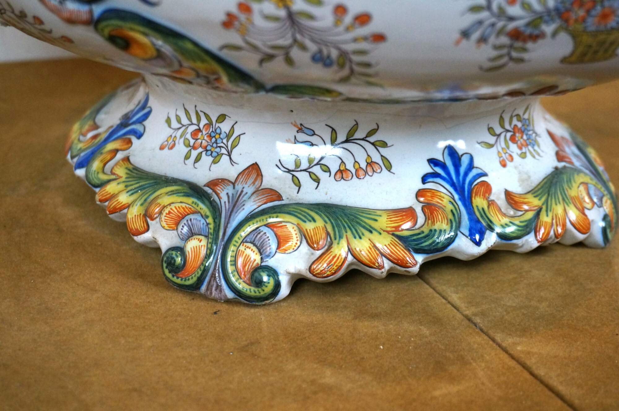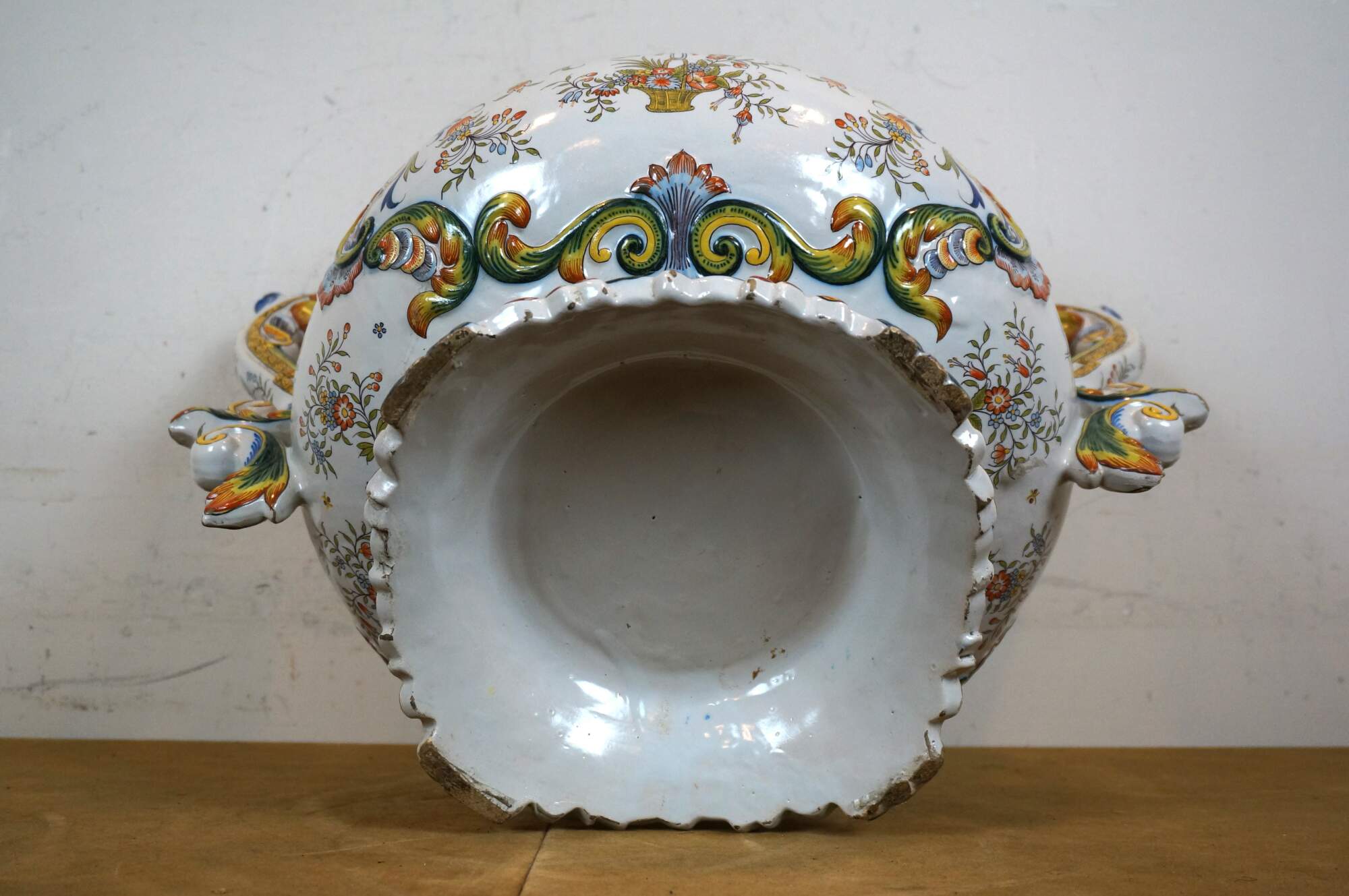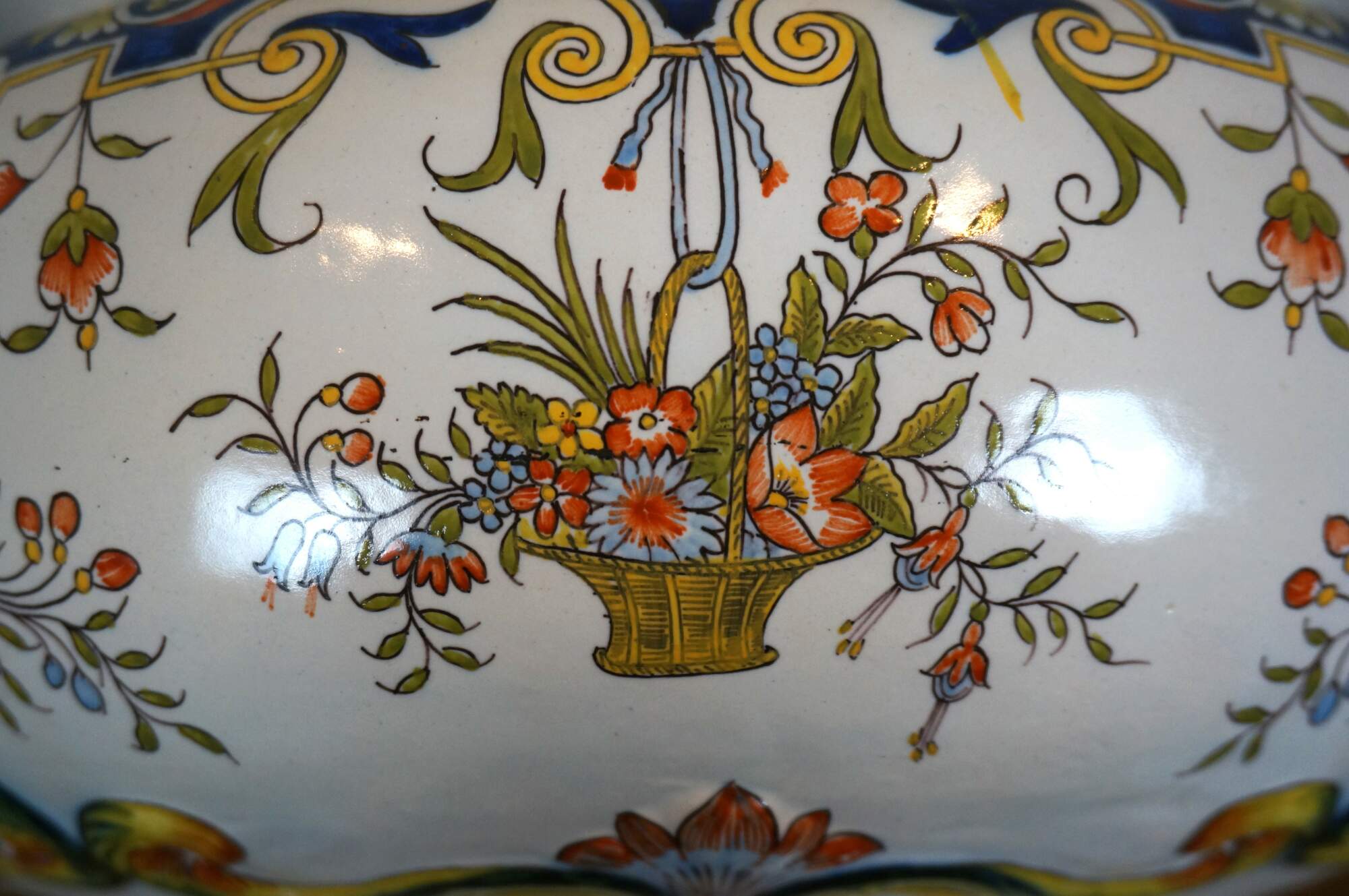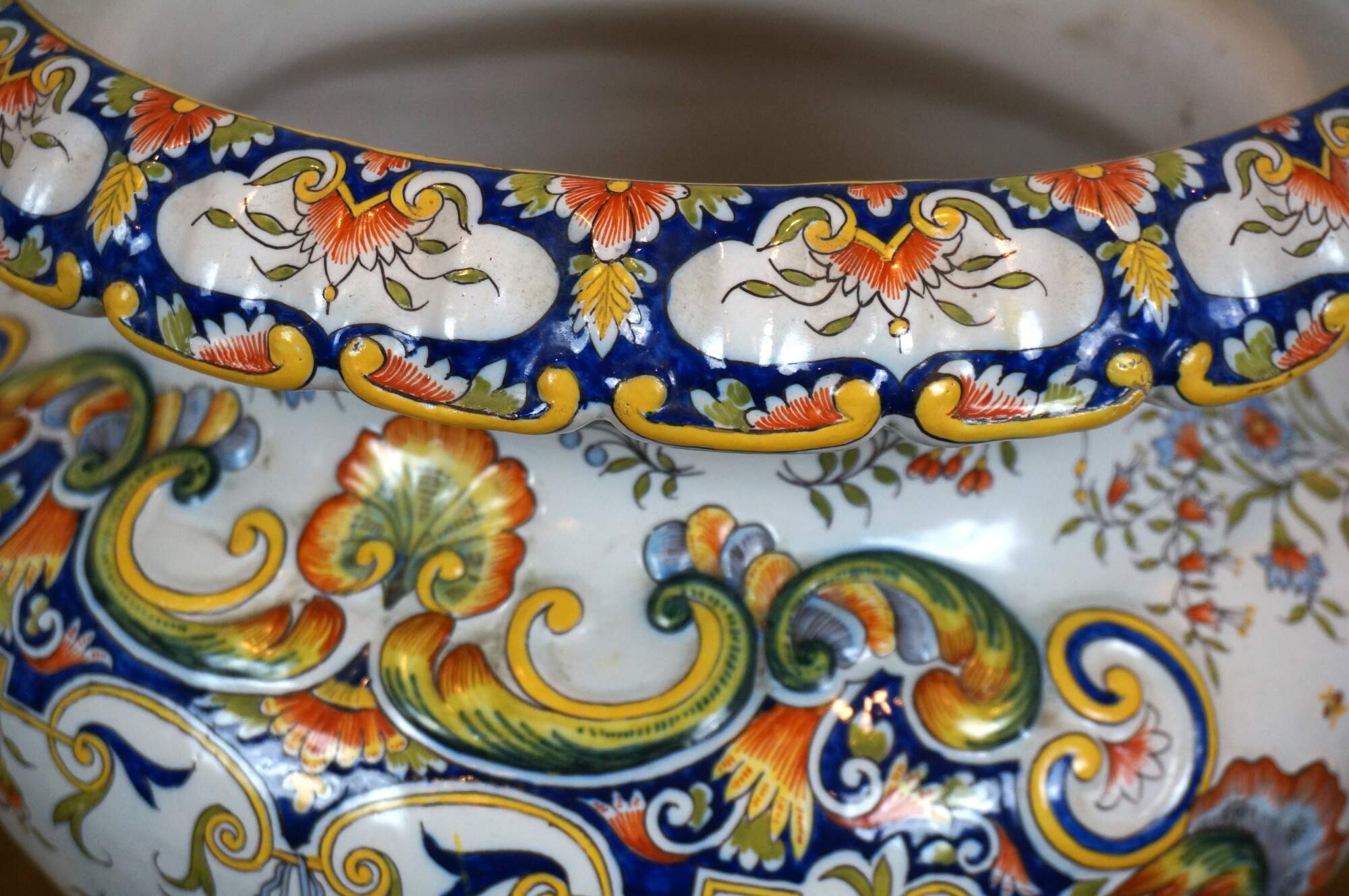 Antique French faience enameled porcelain urn / jardiniere / planter / cachepot featuring an ornate swirling foliate and floral design in blue, yellow, and orange on a white ground. Tapered oval shape with scalloped base and rim, and two scrolling foliate handles.