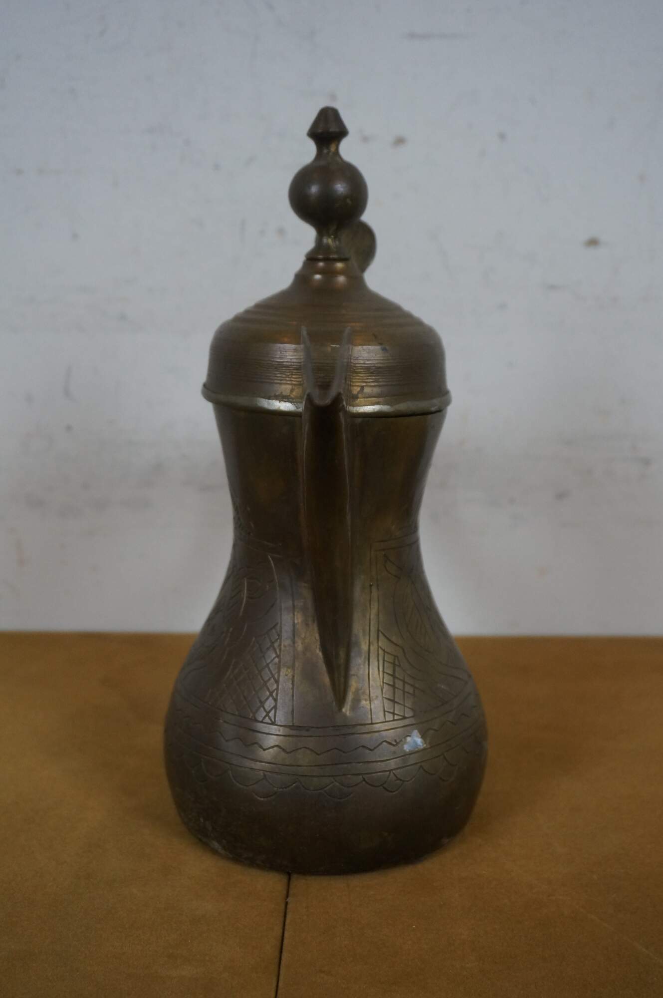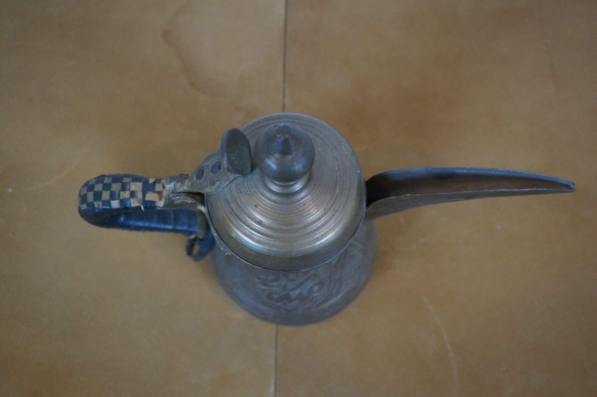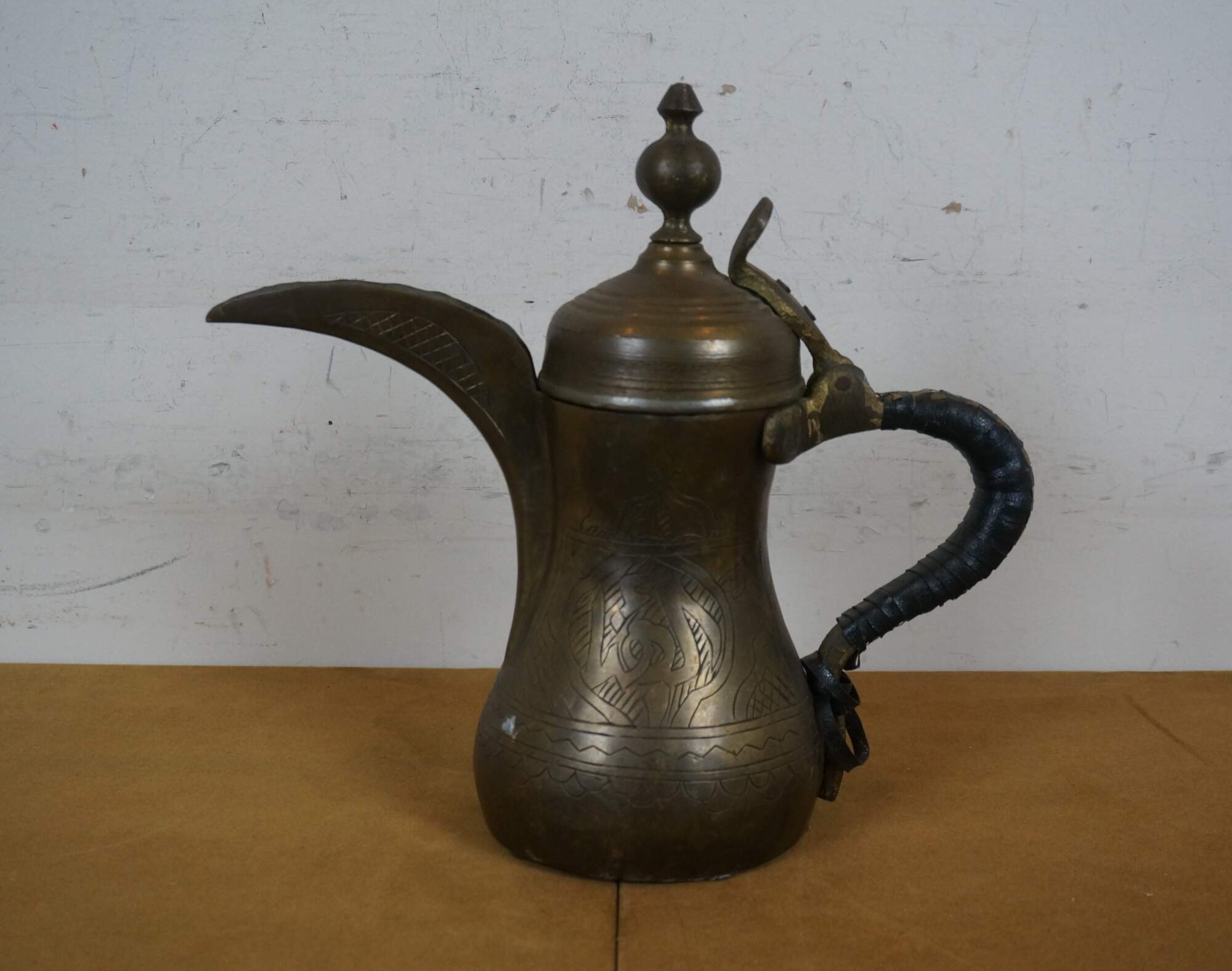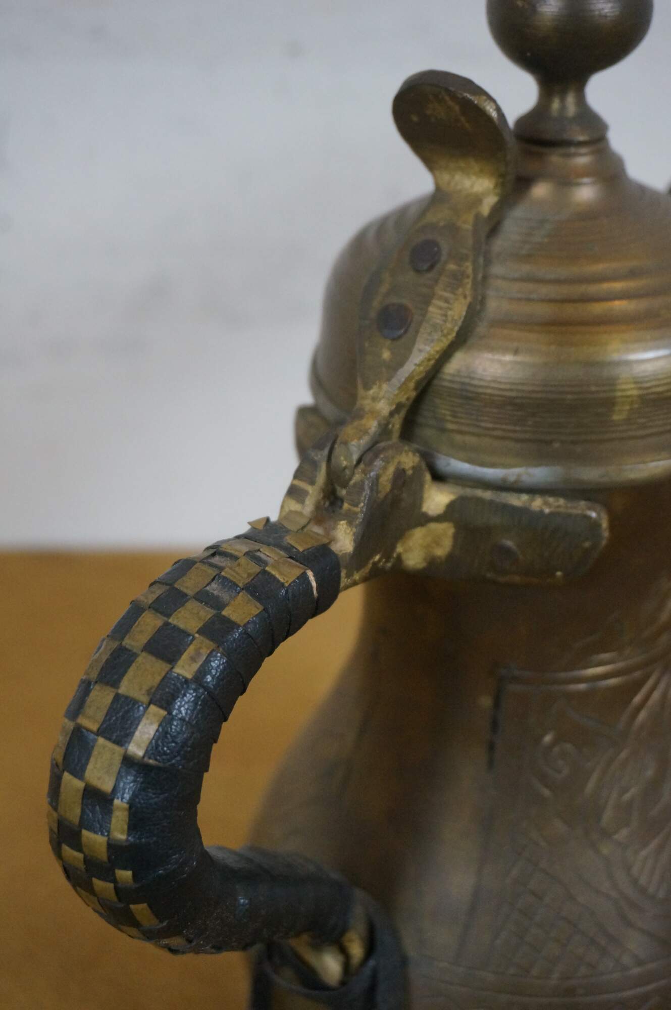 Antique Middle Eastern etched Arabic brass dallah / coffee pot with long spout, flip top lid, and two tone woven leather wrapped handle.