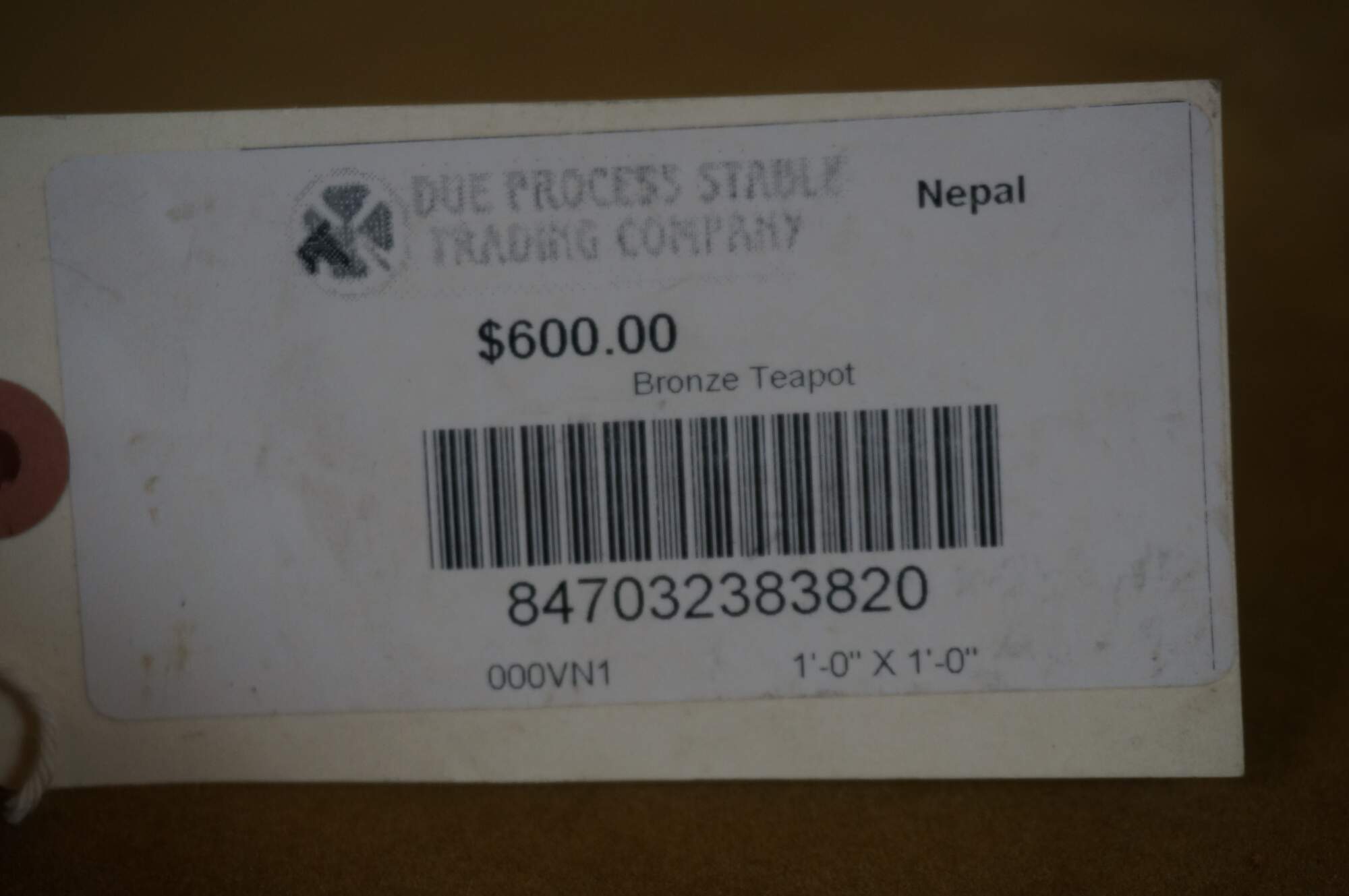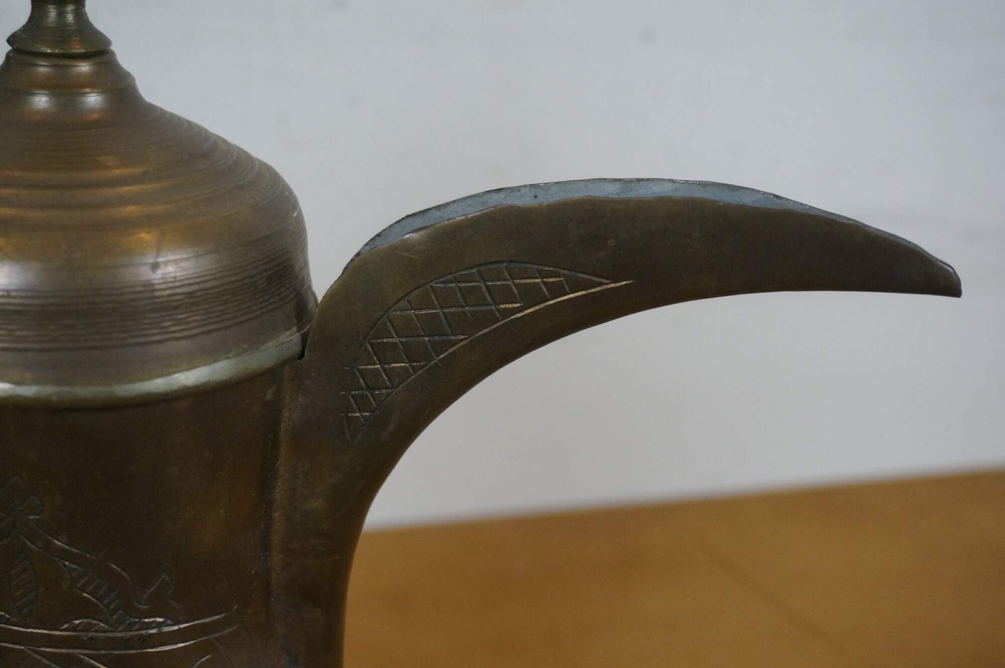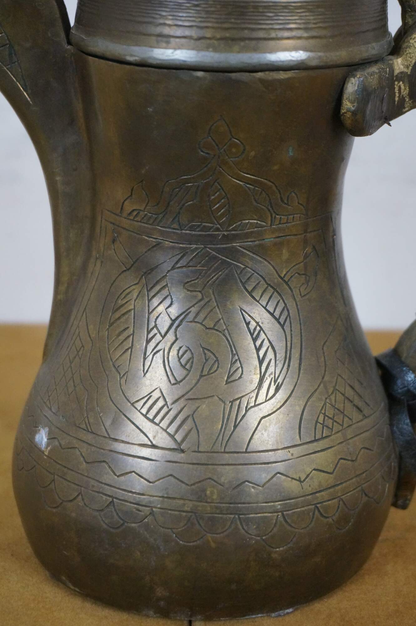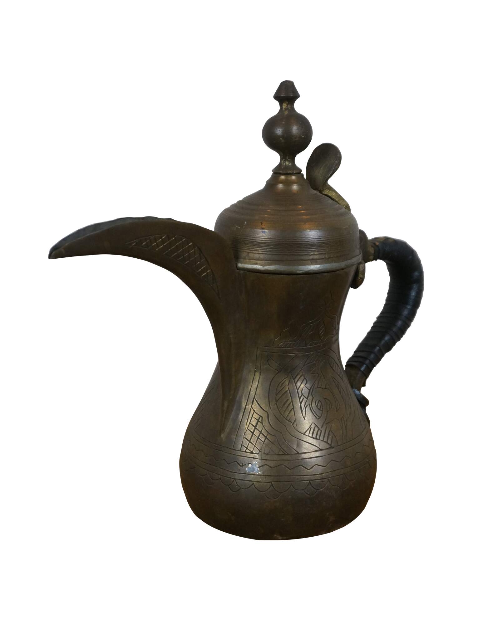 Antique Middle Eastern etched Arabic brass dallah / coffee pot with long spout, flip top lid, and two tone woven leather wrapped handle.