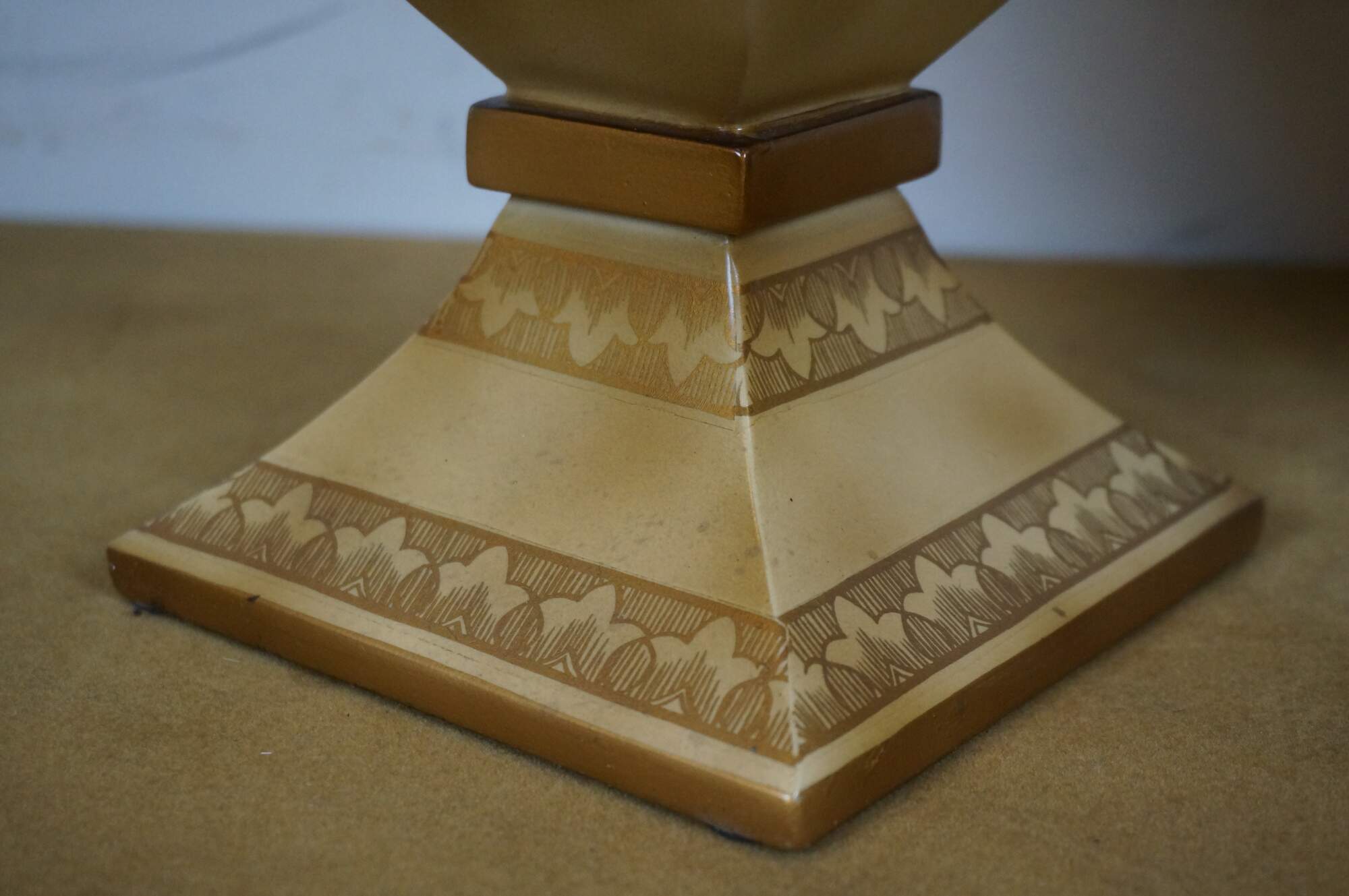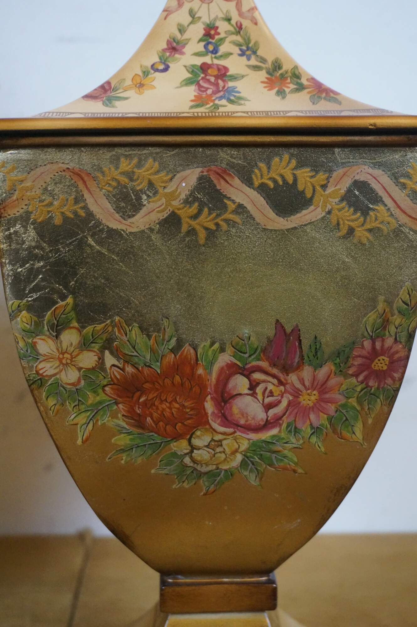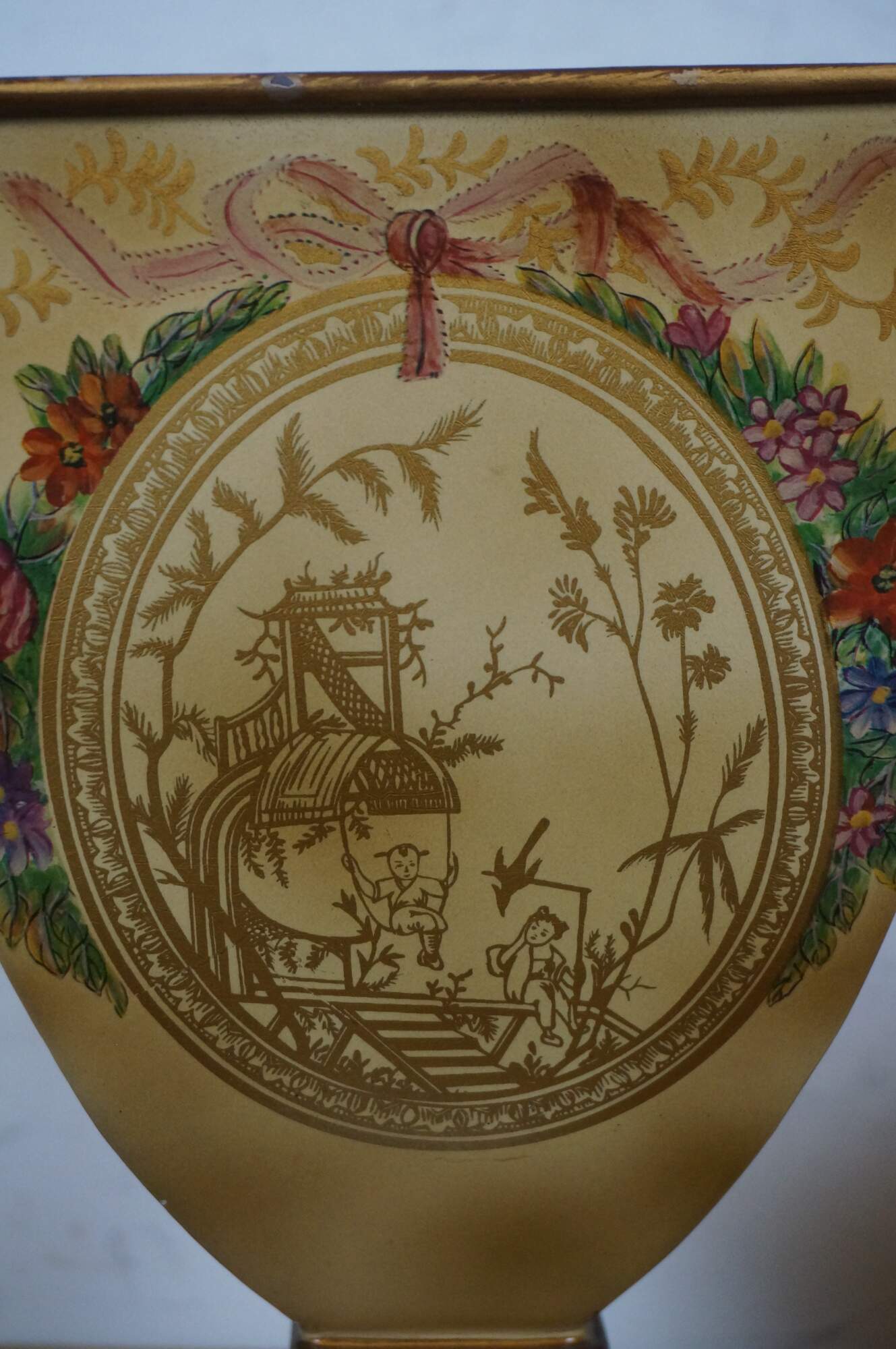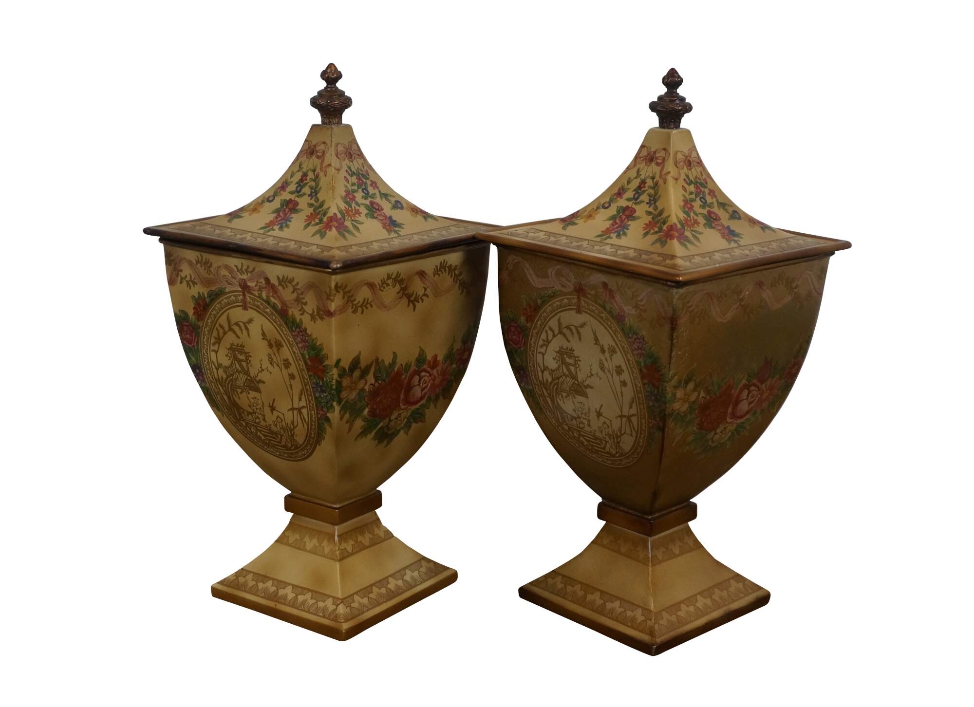 Pair of late 20th century painted tole ware metal lidded chestnut trophy mantel urns. Squared off trophy urn shape with lids sloping up to foliate finials. Painted with gilt Neoclassical Chinoiserie scenes of children at play in a garden, framed with floral bouquets and ribbons.