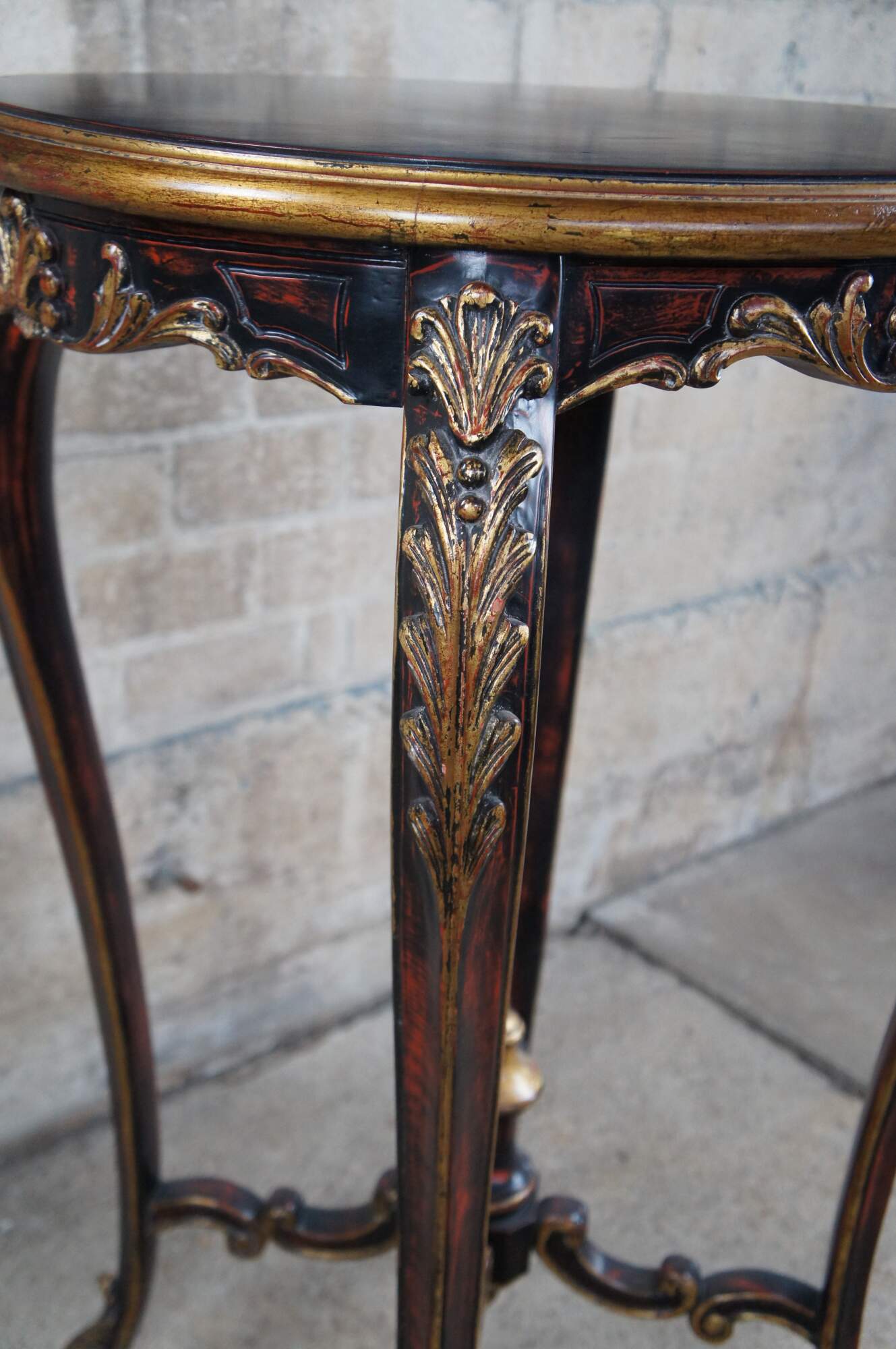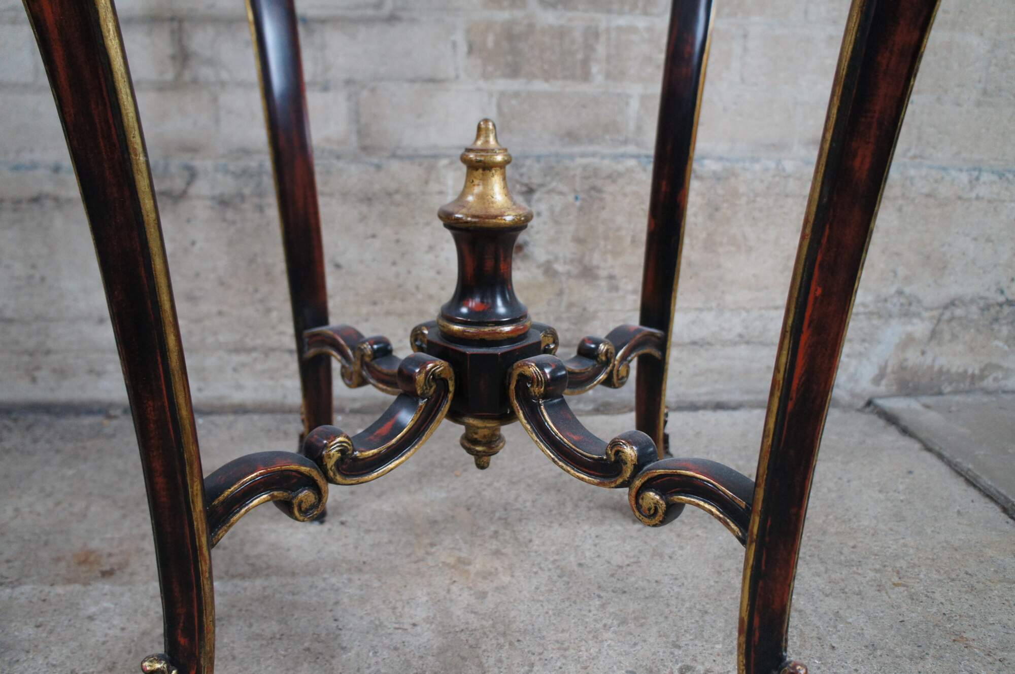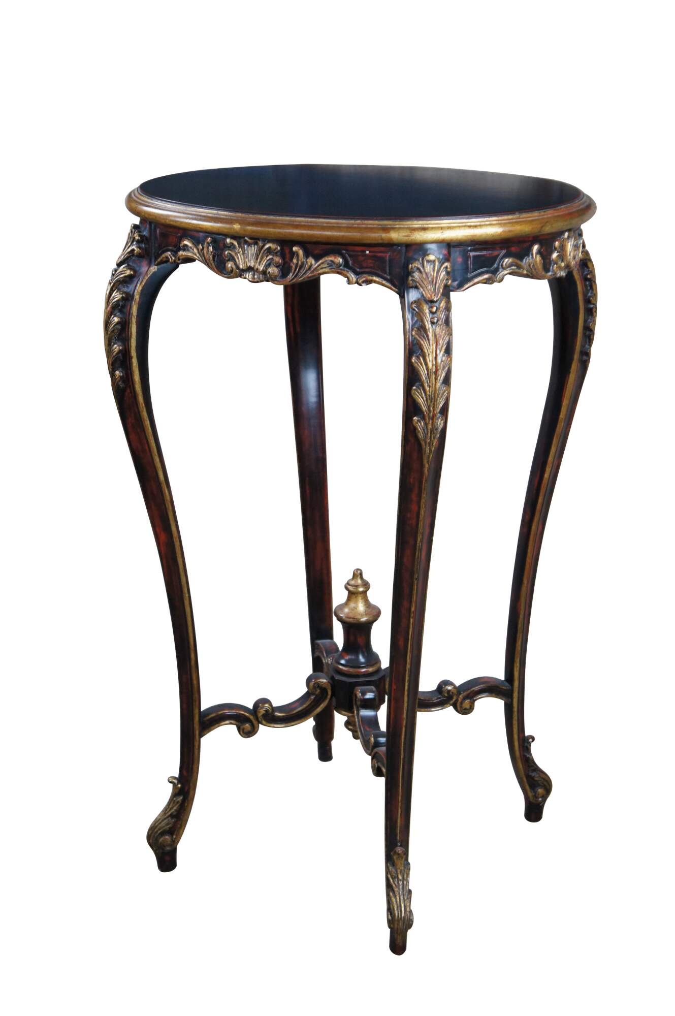 Vintage pedestal table / plant stand featuring French Rococo styling with elongated Gueridon form. The oval top is supported by cabriole legs accented with gold acanthus leaves, and connected by c scrolled supports leading to trophy finial. Brown and black with reddish undertones.