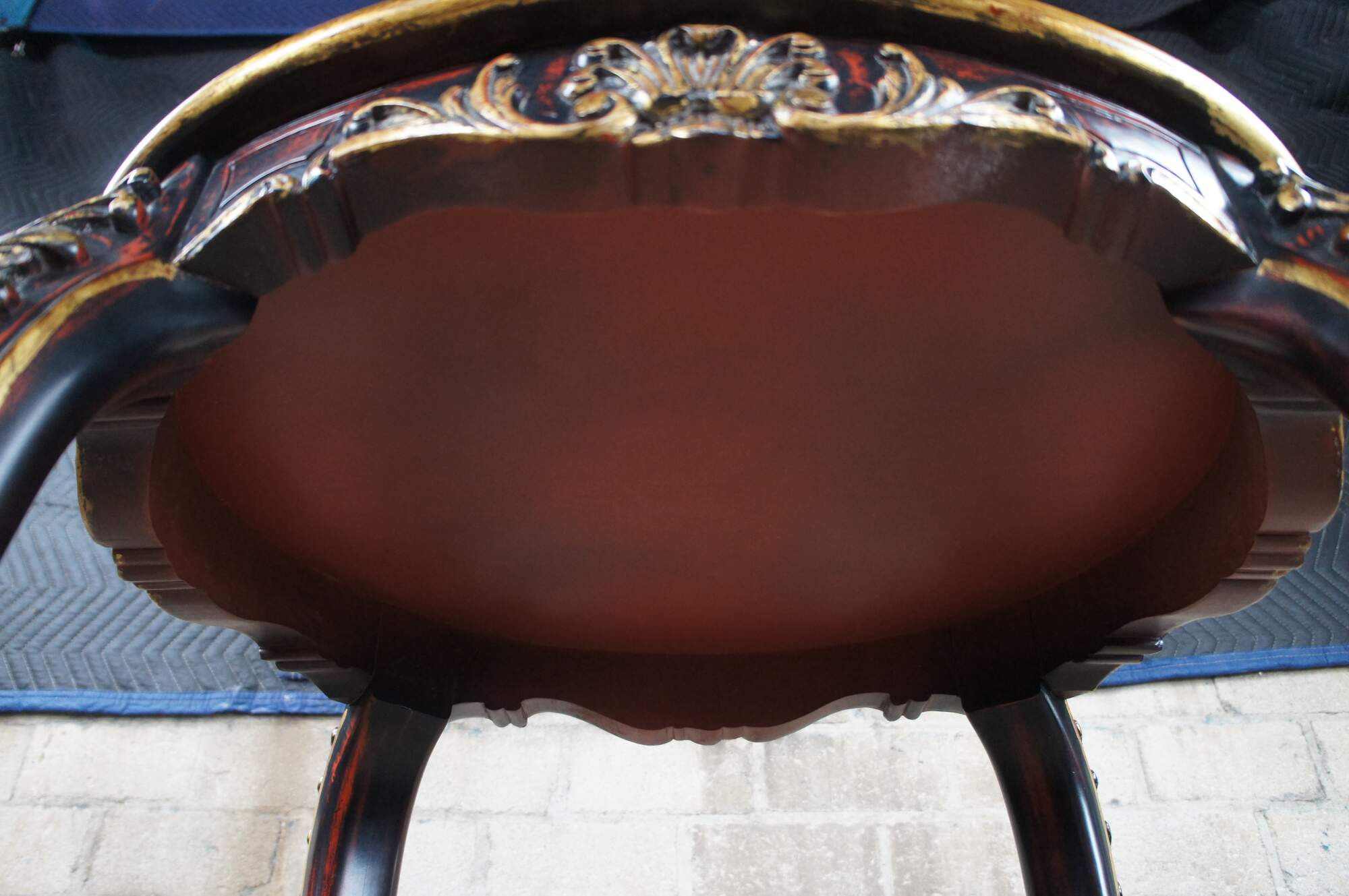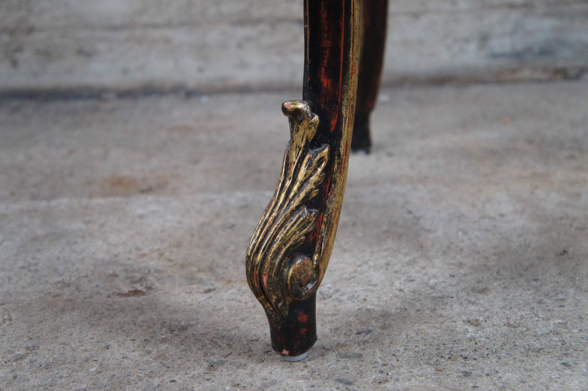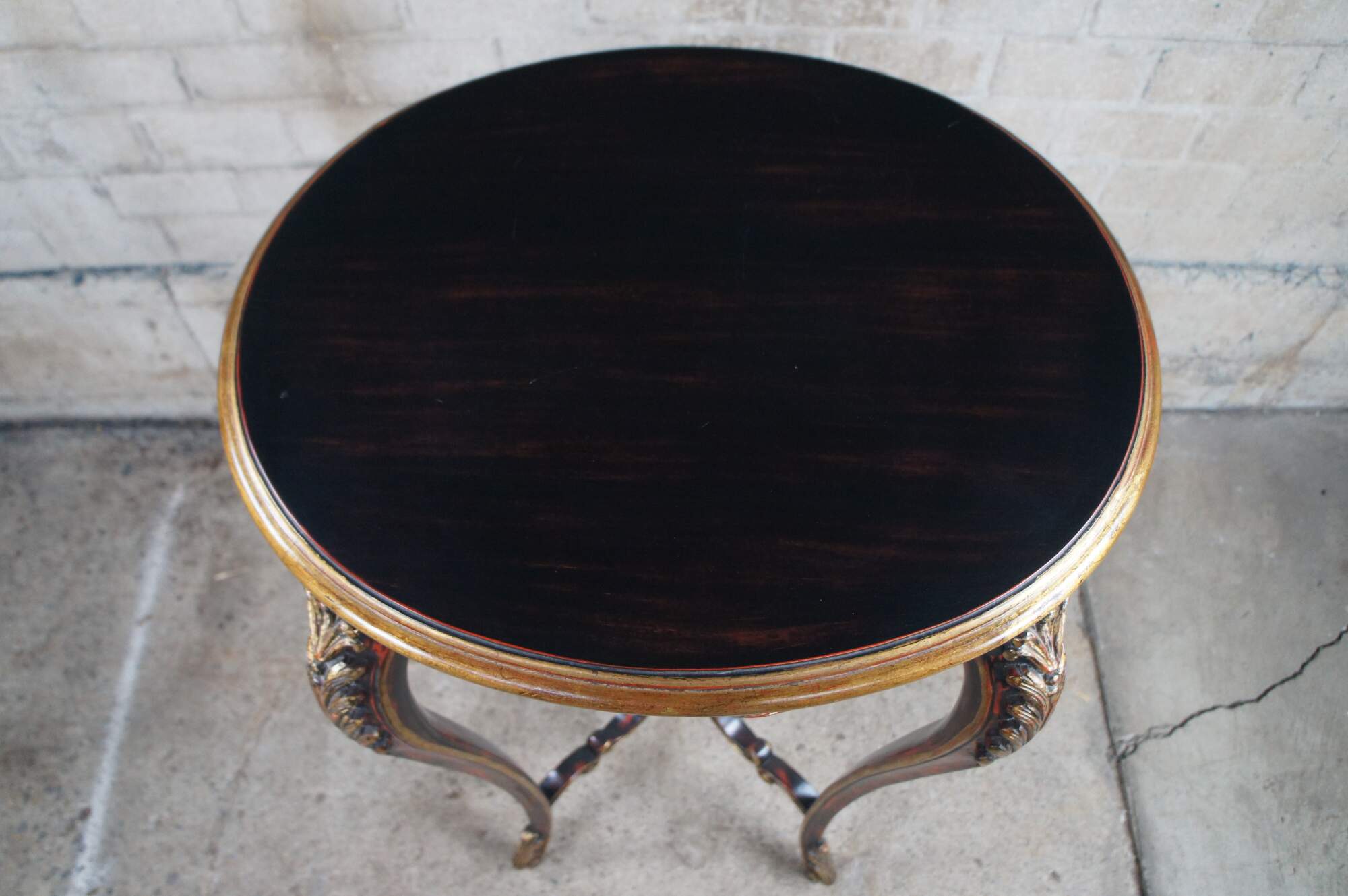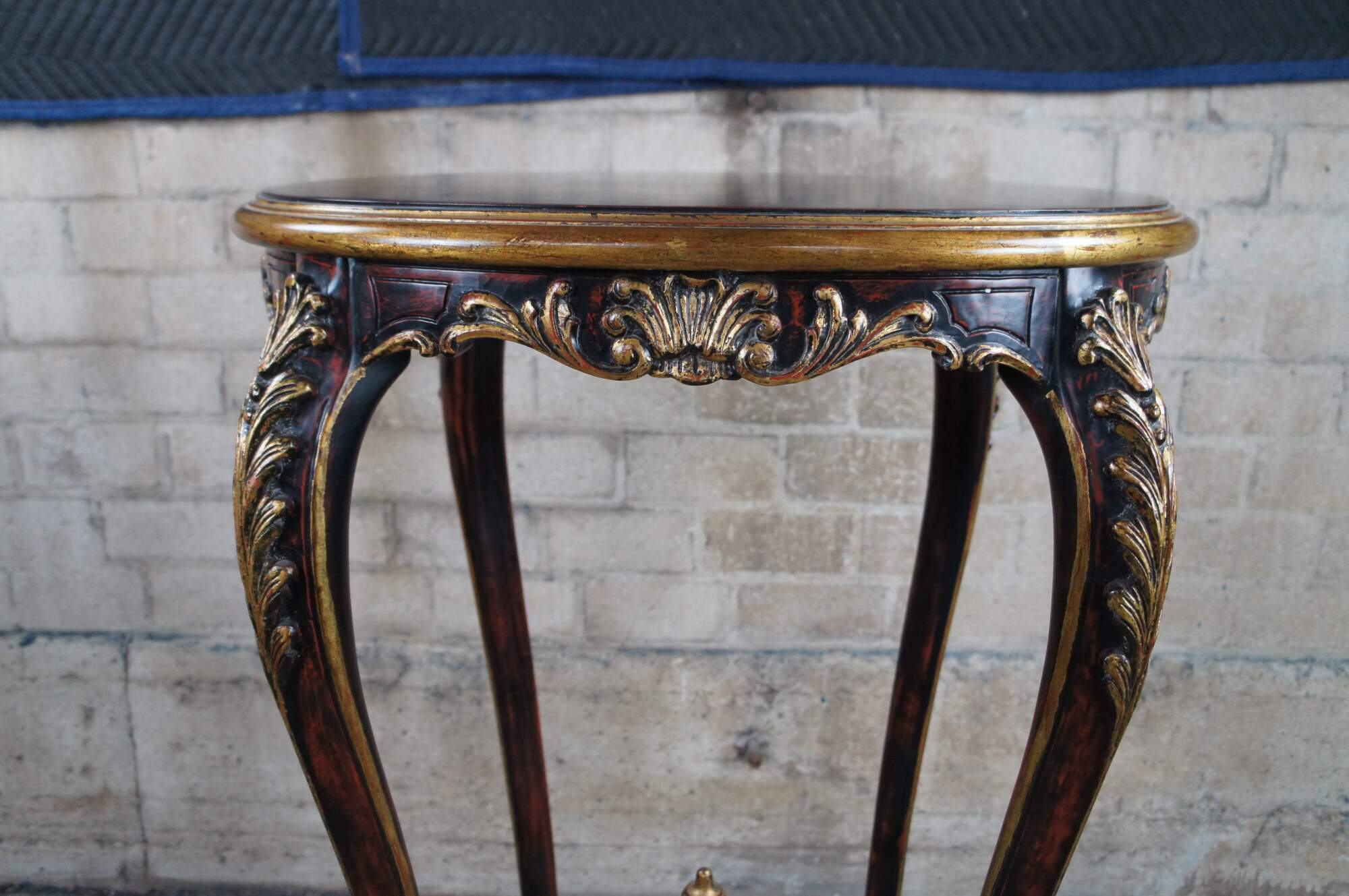 Vintage pedestal table / plant stand featuring French Rococo styling with elongated Gueridon form. The oval top is supported by cabriole legs accented with gold acanthus leaves, and connected by c scrolled supports leading to trophy finial. Brown and black with reddish undertones.
