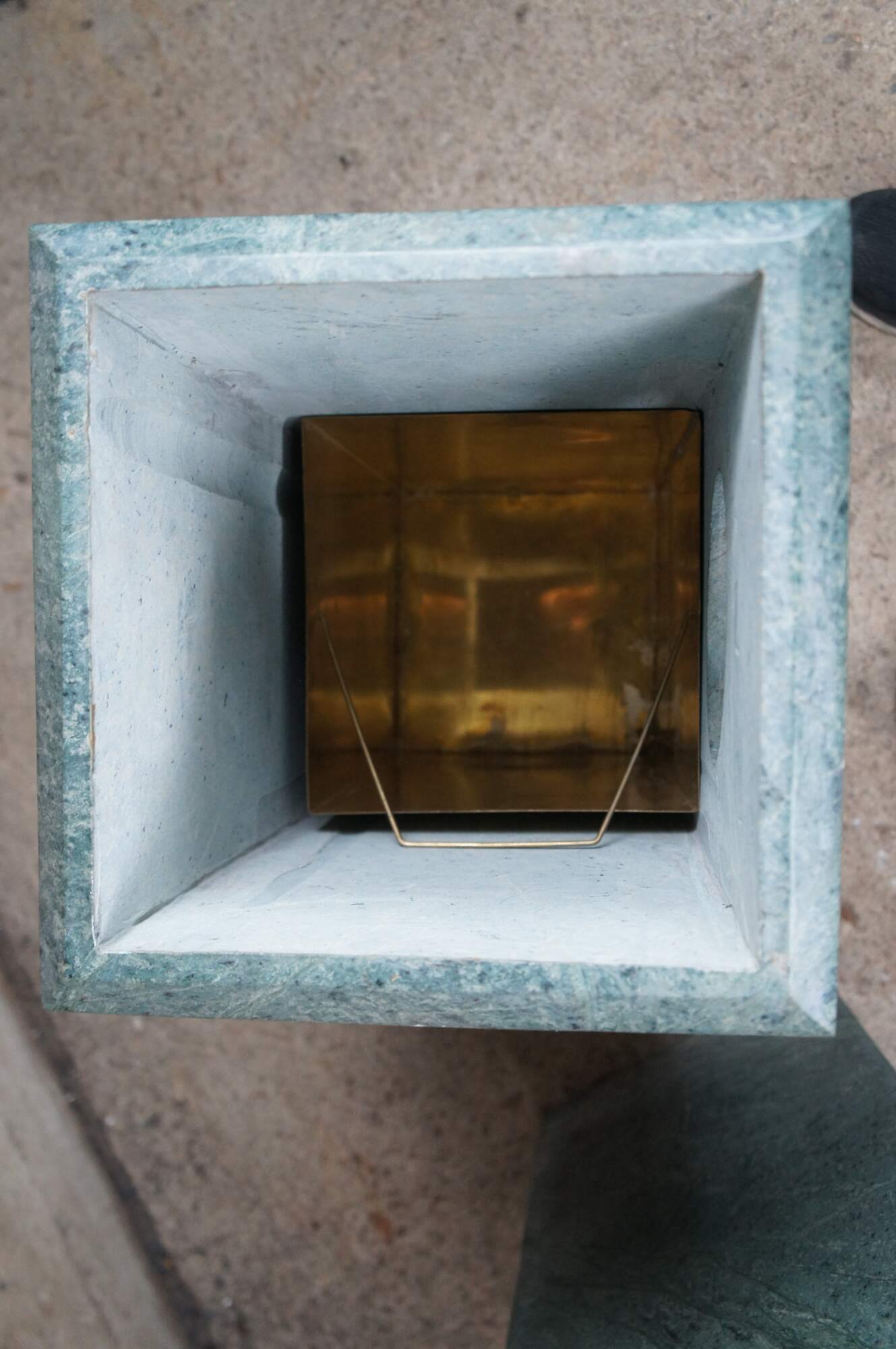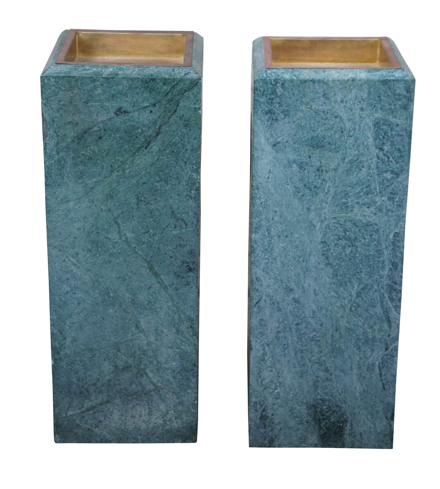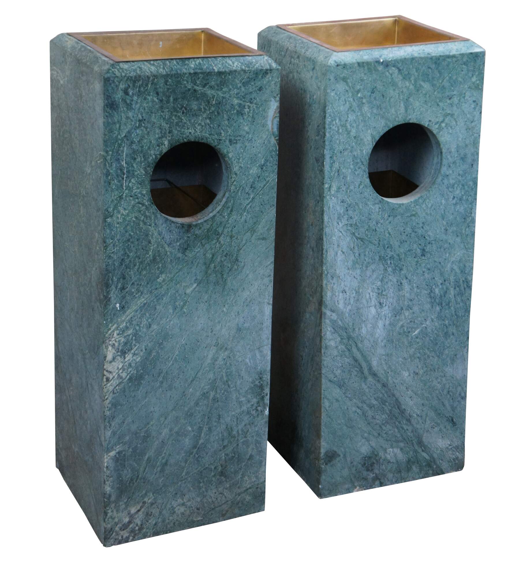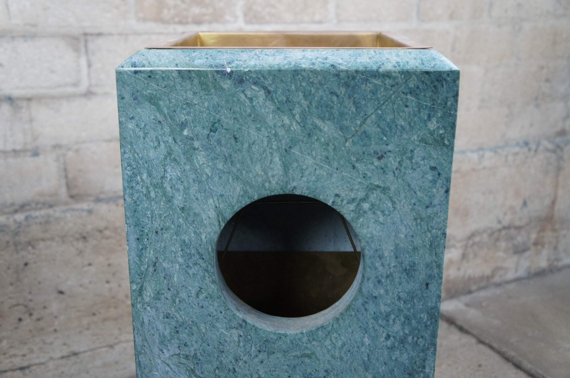 Pair of two rare vintage public commercial hotel / business / lobby trash can stands / bins / receptacles. Made of green marble with inset brass ashtrays and circular trash openings - fitted with a brass bucket with handle for easy maintenance.