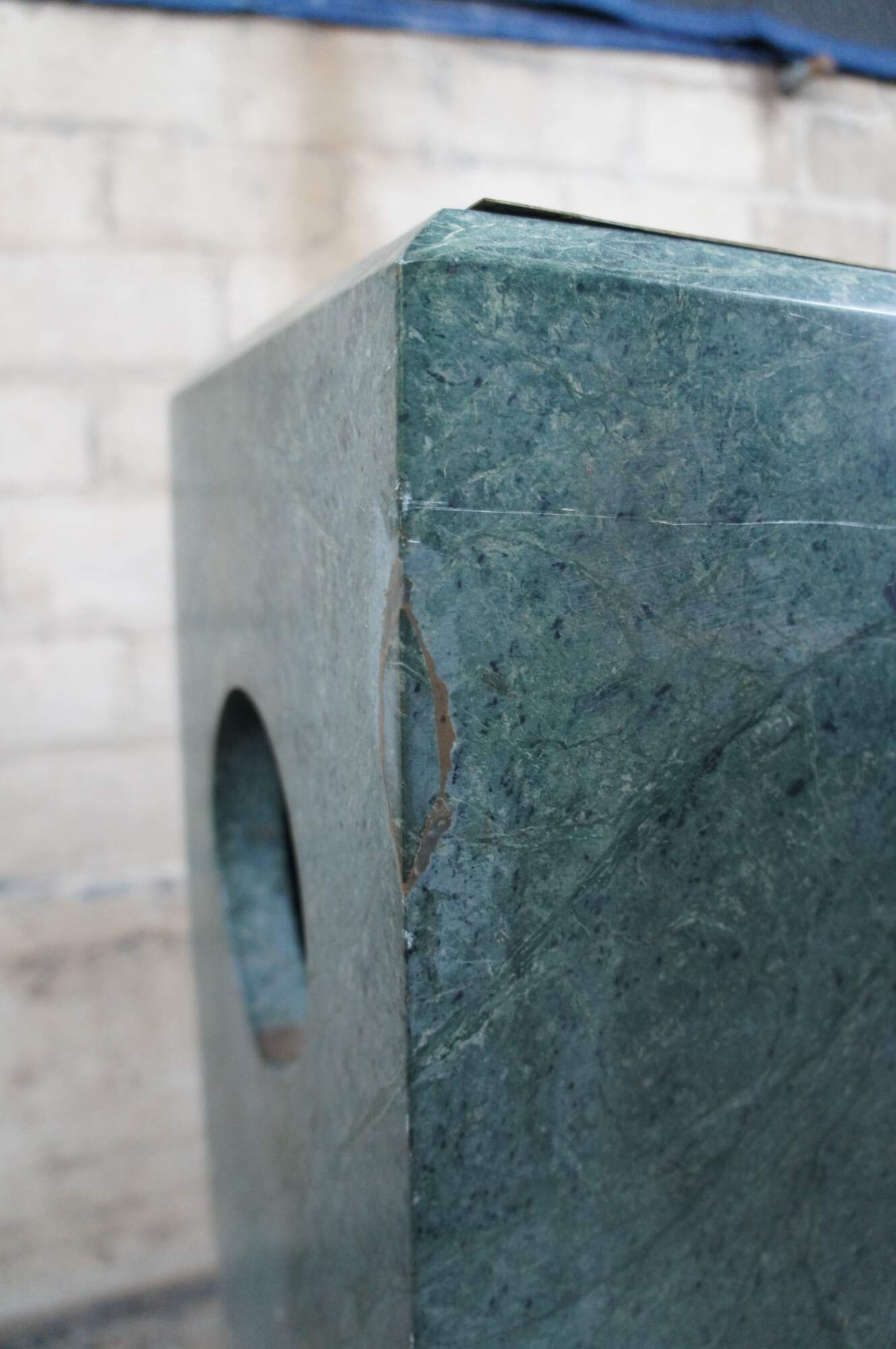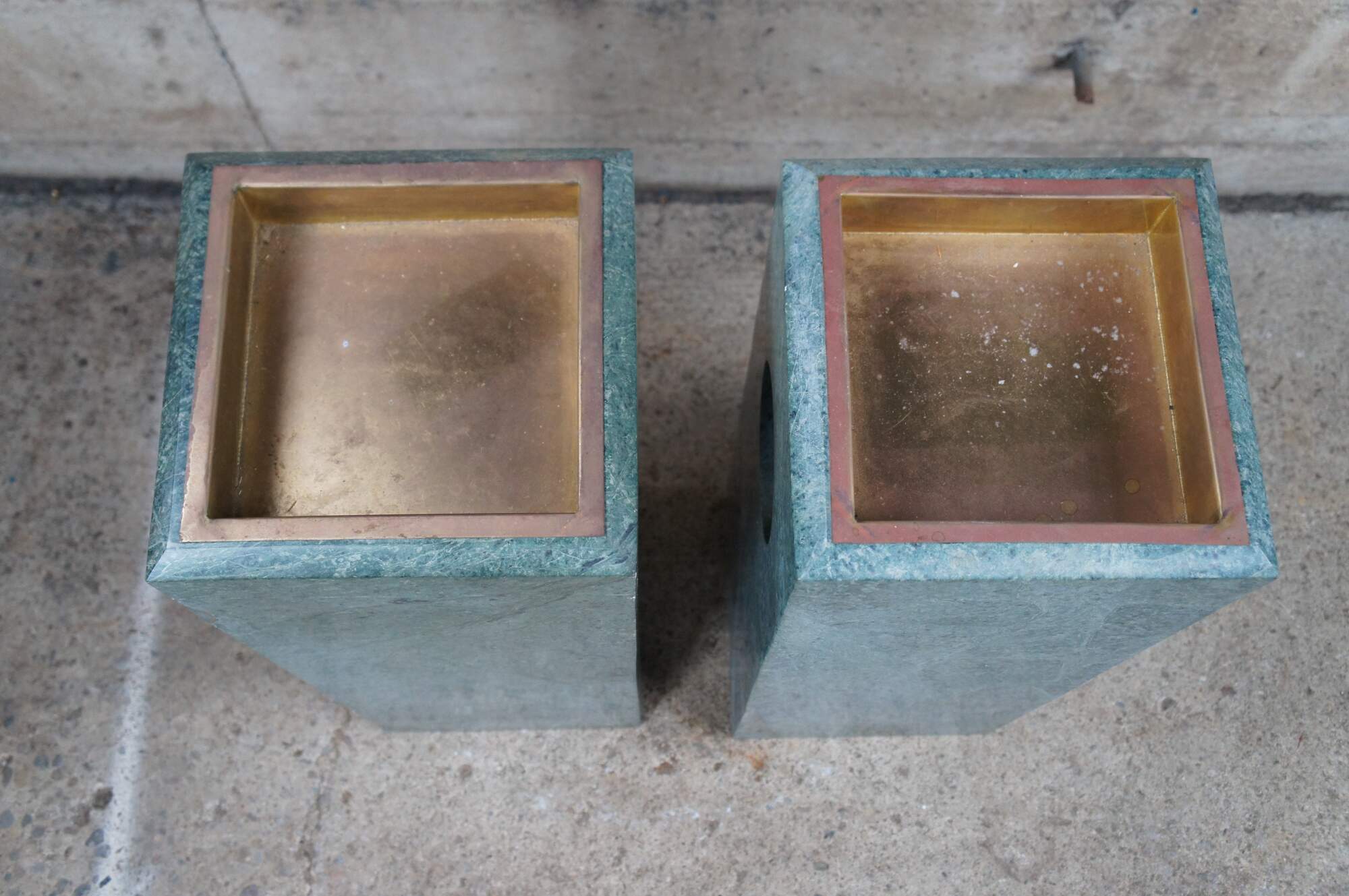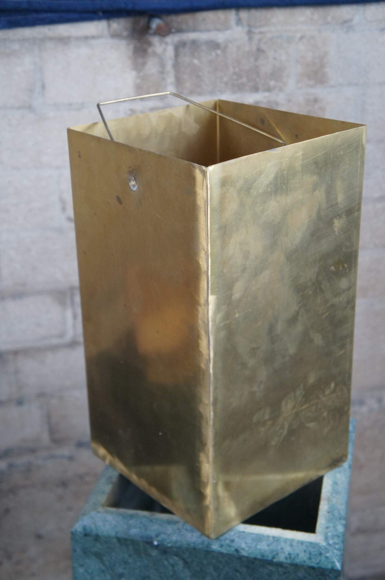 Pair of two rare vintage public commercial hotel / business / lobby trash can stands / bins / receptacles. Made of green marble with inset brass ashtrays and circular trash openings - fitted with a brass bucket with handle for easy maintenance.