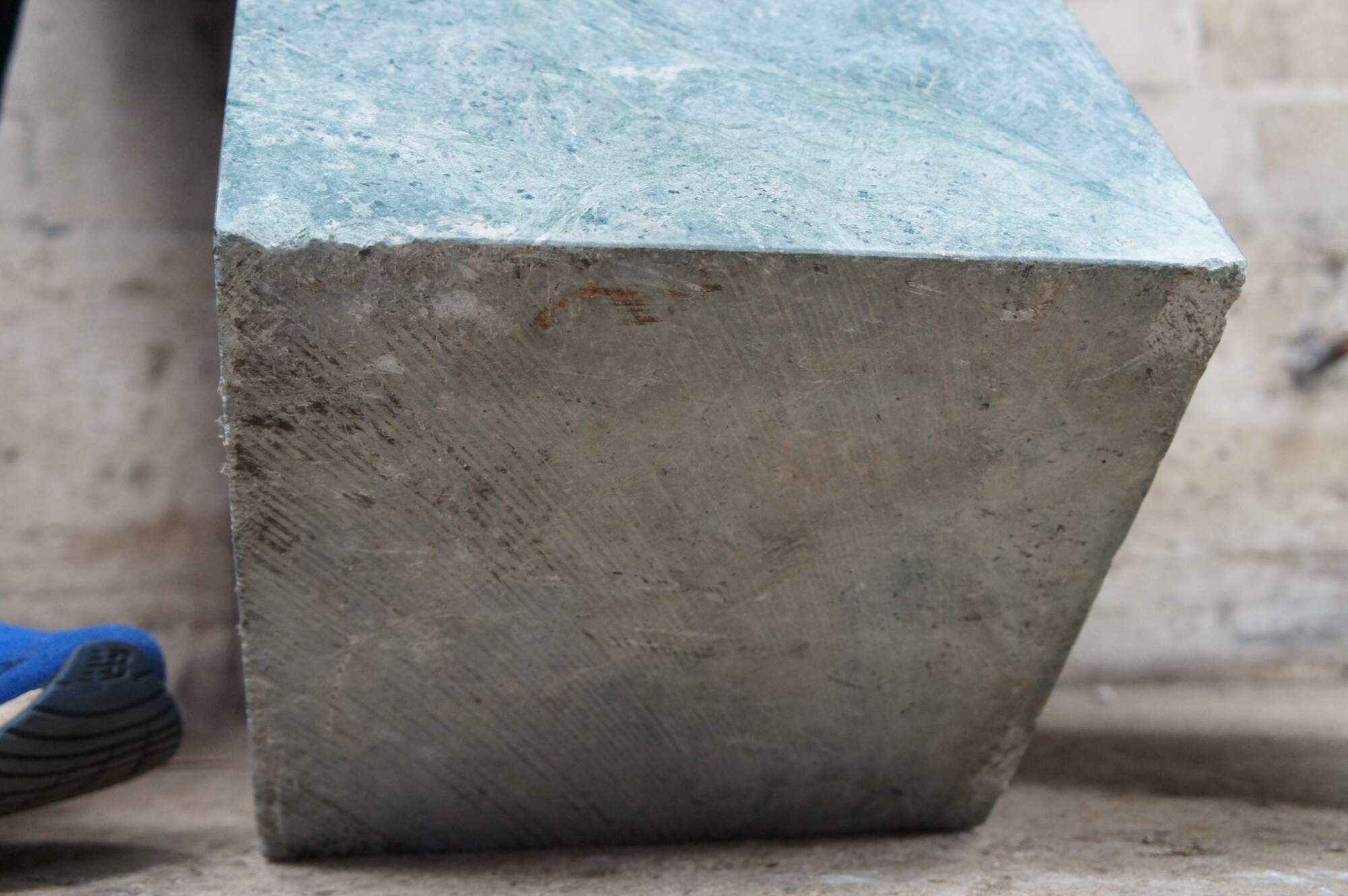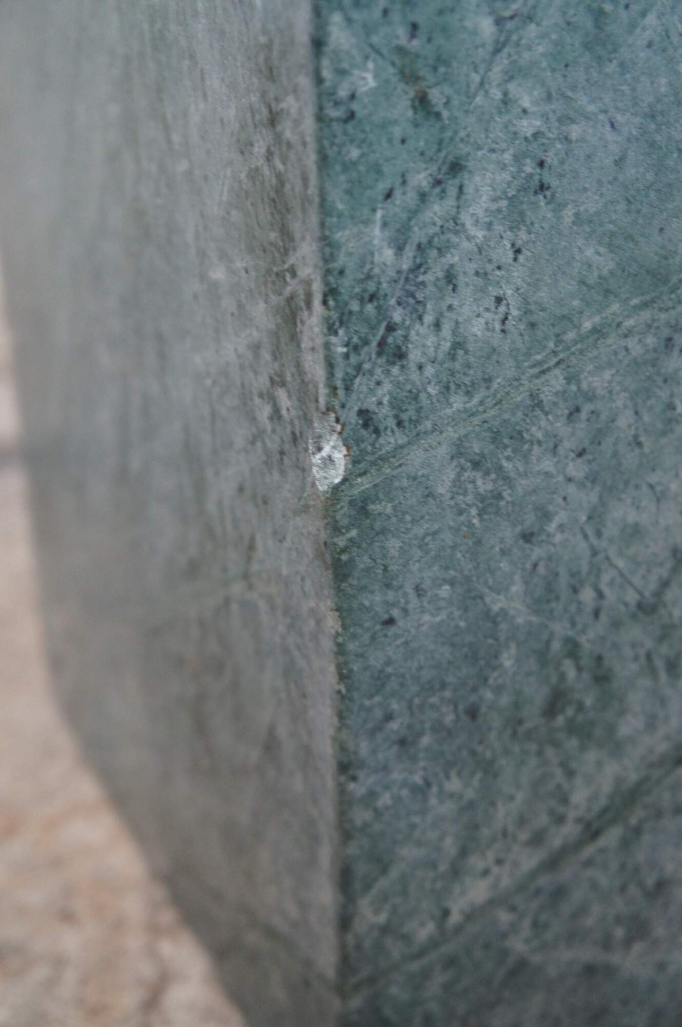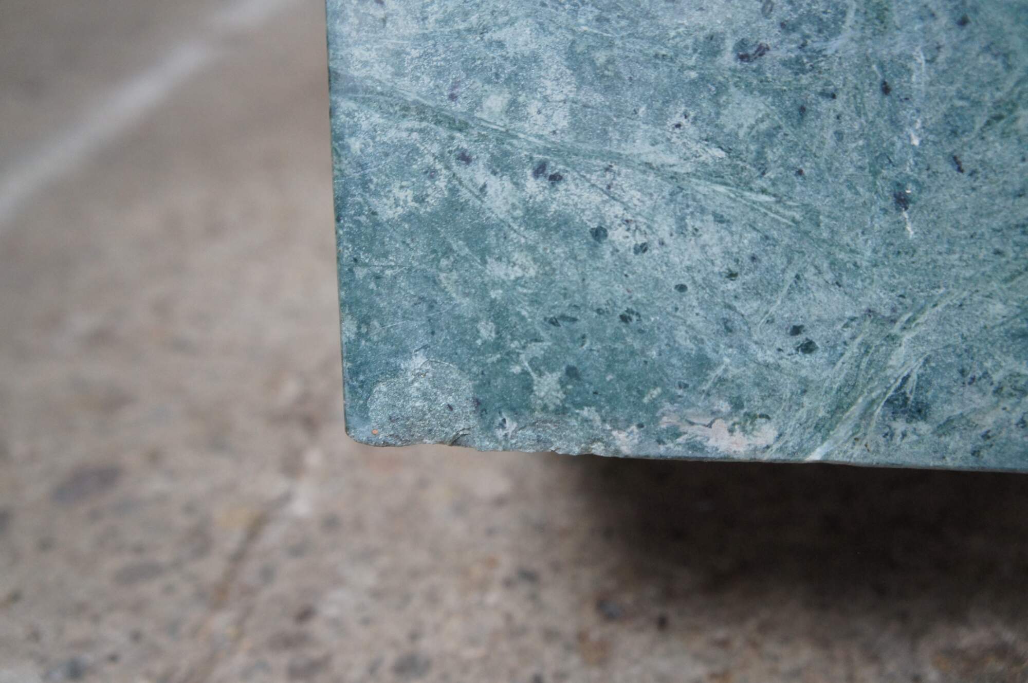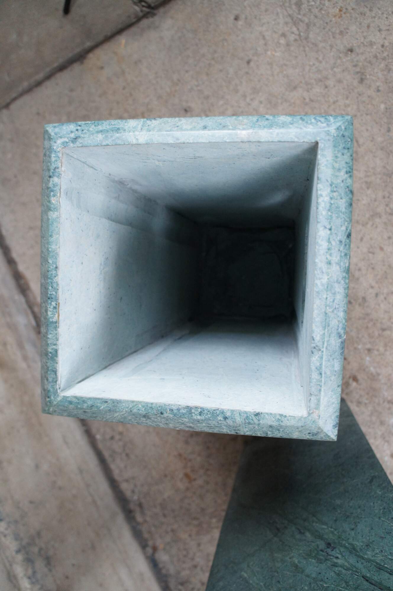 Pair of two rare vintage public commercial hotel / business / lobby trash can stands / bins / receptacles. Made of green marble with inset brass ashtrays and circular trash openings - fitted with a brass bucket with handle for easy maintenance.