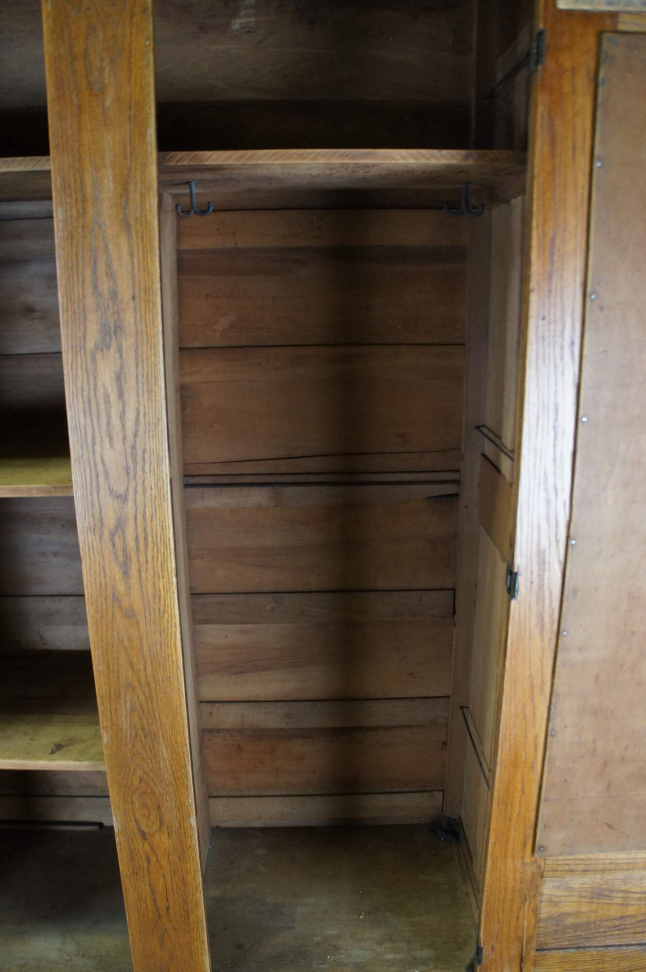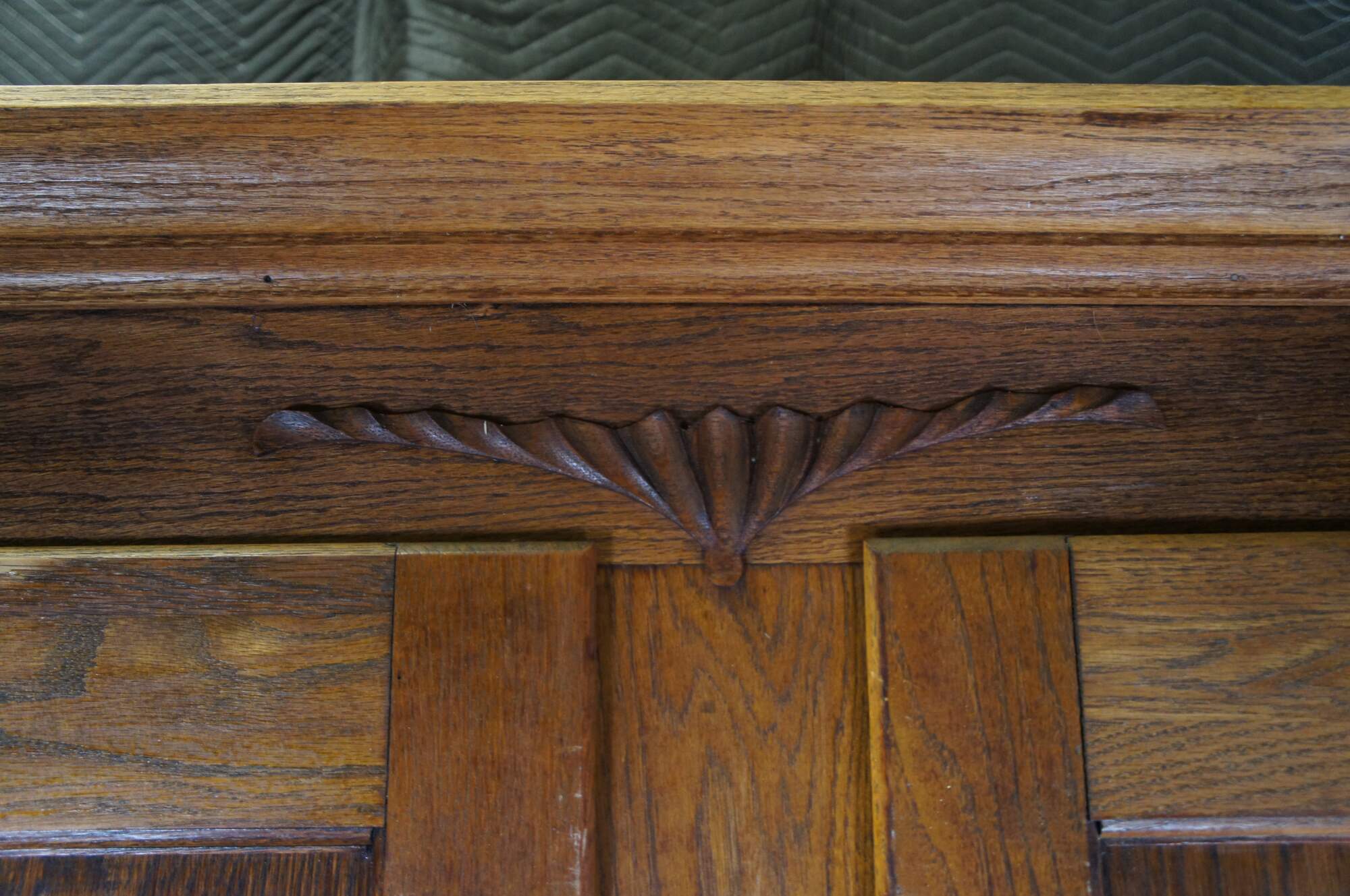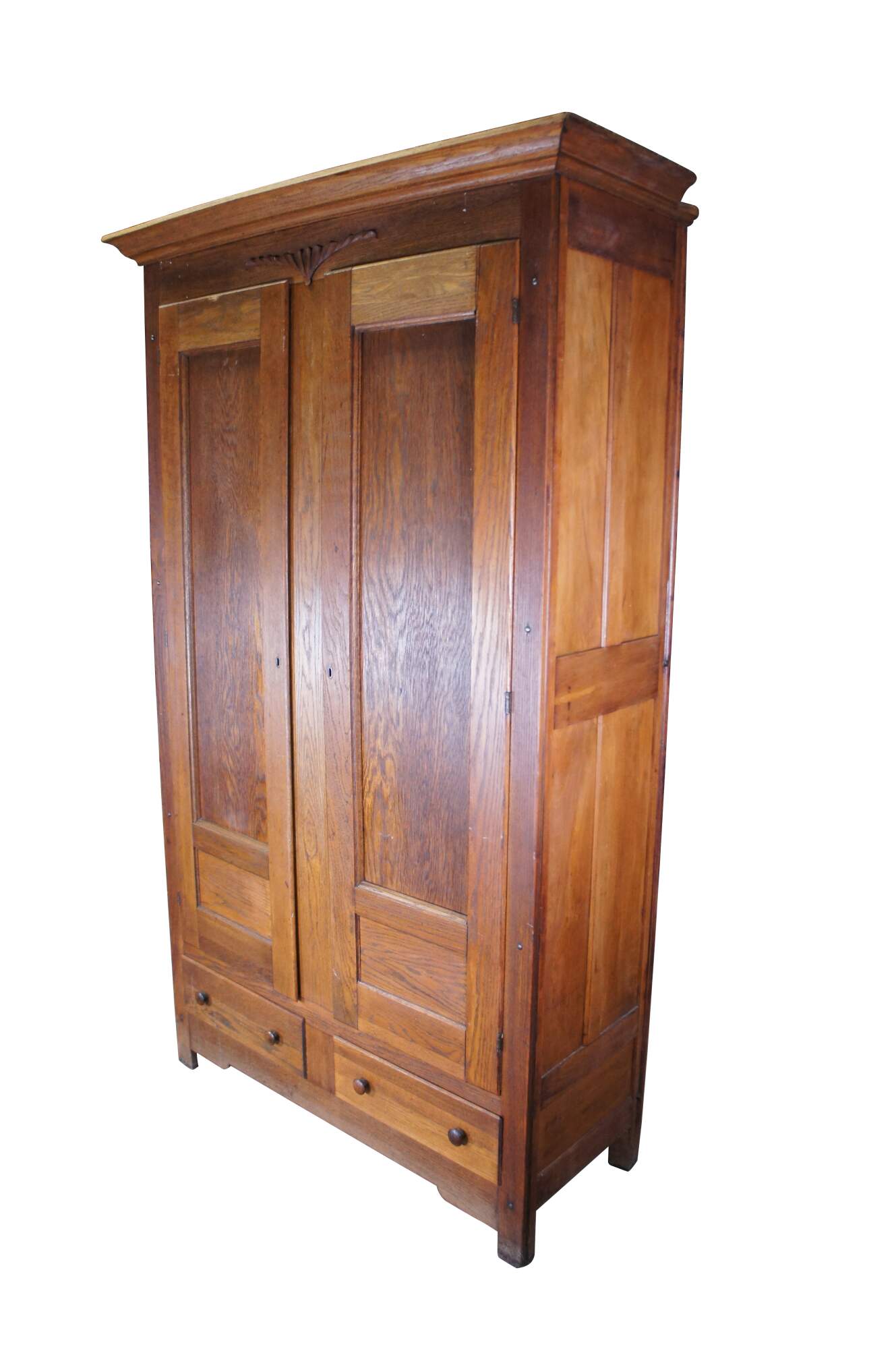 A Late Victorian American Oak Armoire or Linen Press. Features a rectangular paneled frame with two blind doors that open to shelves and a full length hanging area with two hooks. The base has two drawers with wooden pulls. Upper apron has a carved embellishment. No key.