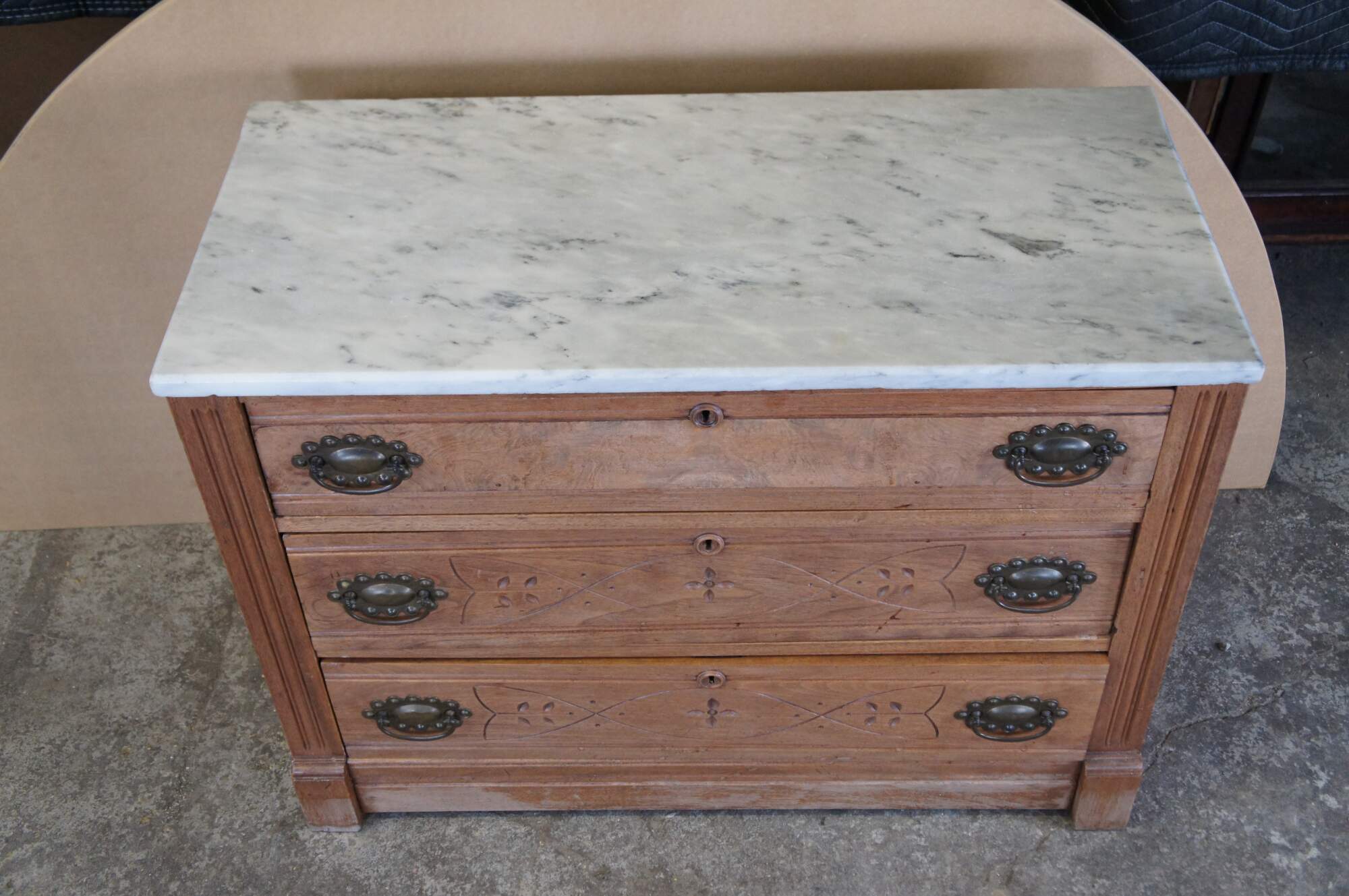 Late Victorian Eastlake Chest of Drawers. Features a walnut frame with three dovetailed drawers with round escutcheon plates and brass hardware. The uppermost drawer has walnut burl veneered front, and the lower two are engraved with a foliate pattern. The stiles of the chest are fluted and stepped at the base, and the side panels are burled. The marble top, which was replaced at some point, is a little shorter than the frame.