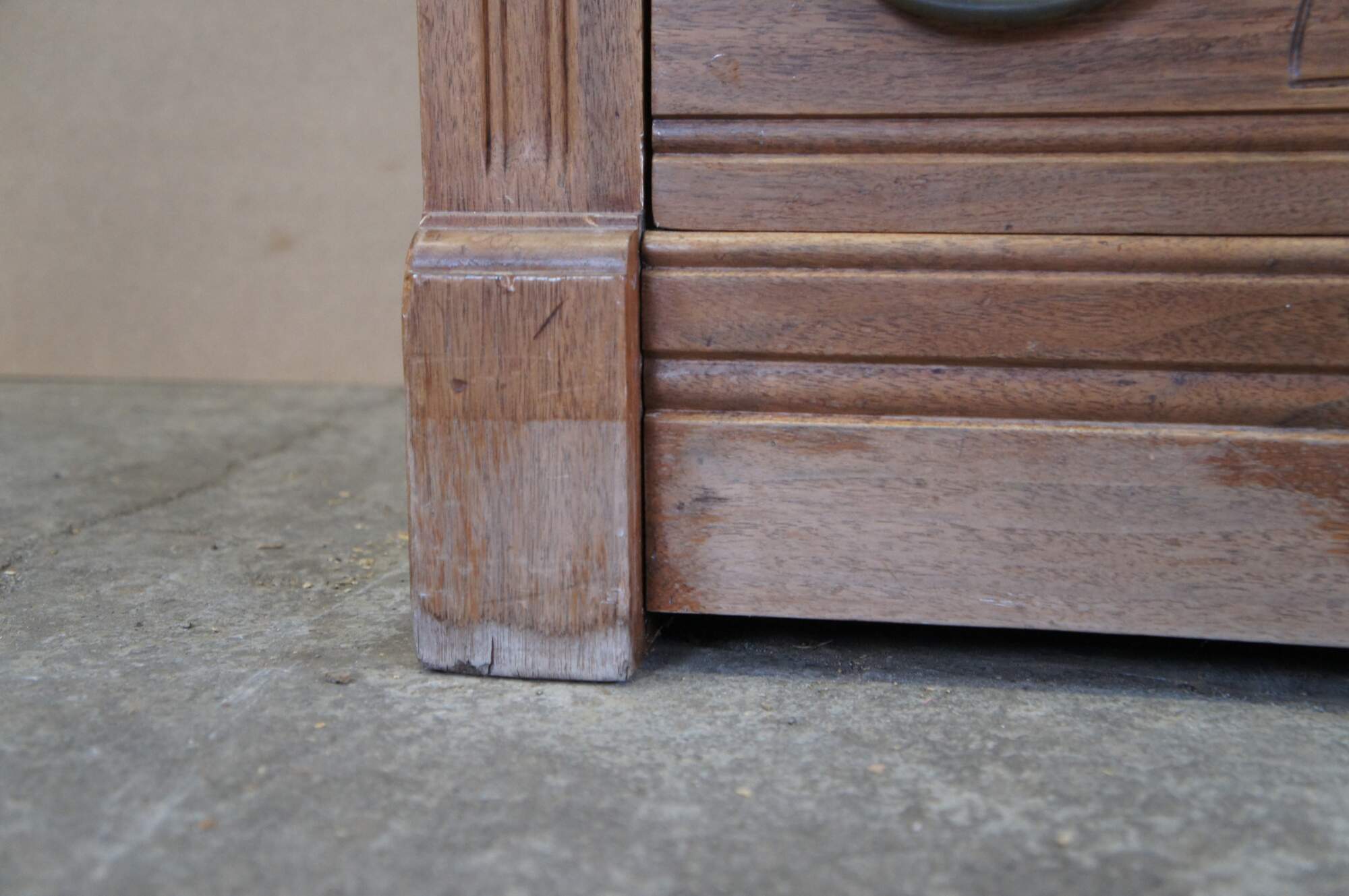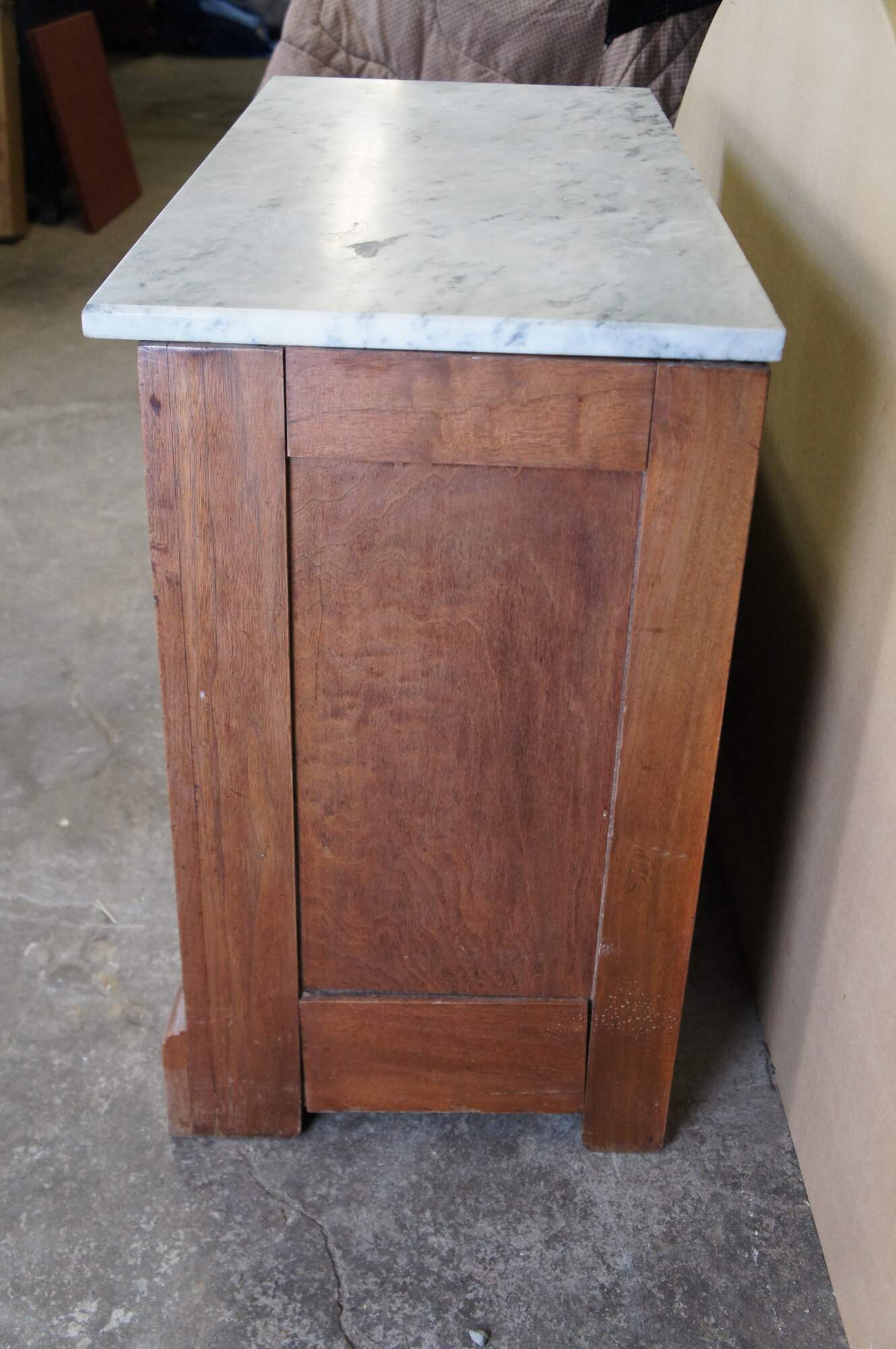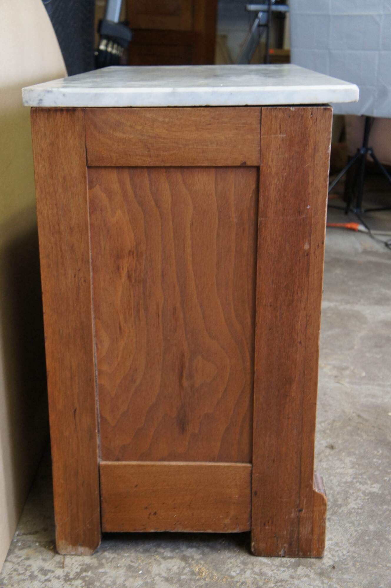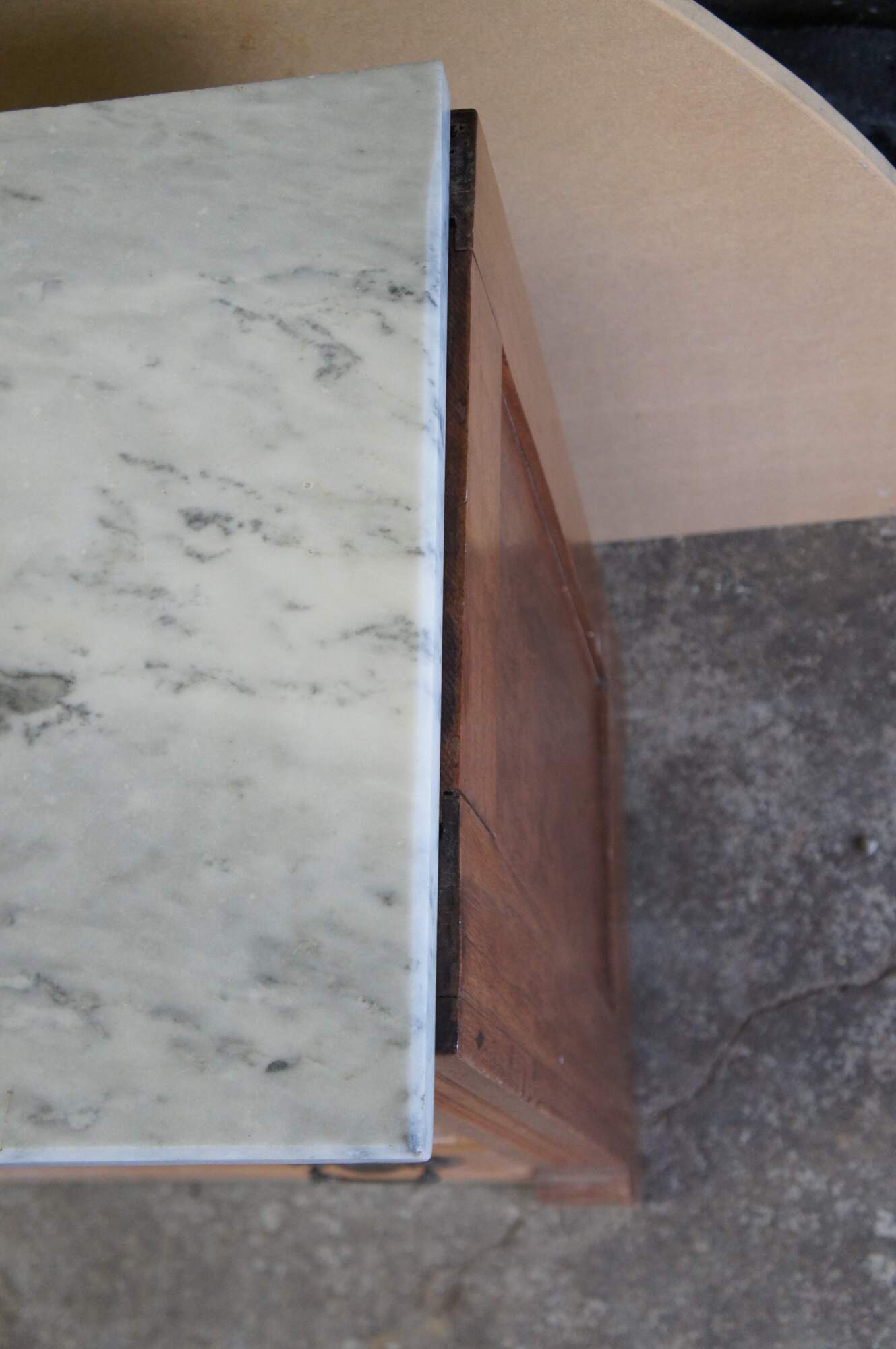 Fair; structurally solid. Sun fading / discoloration. Finish wear to baseboard as well as marking and edgewear. Marble is a replacement which is slightly smaller than the width of the frame. Some lifting to the veneer as well as a small piece missing underneath the left drawer pull.
