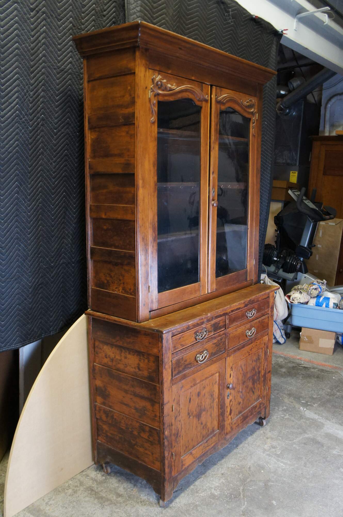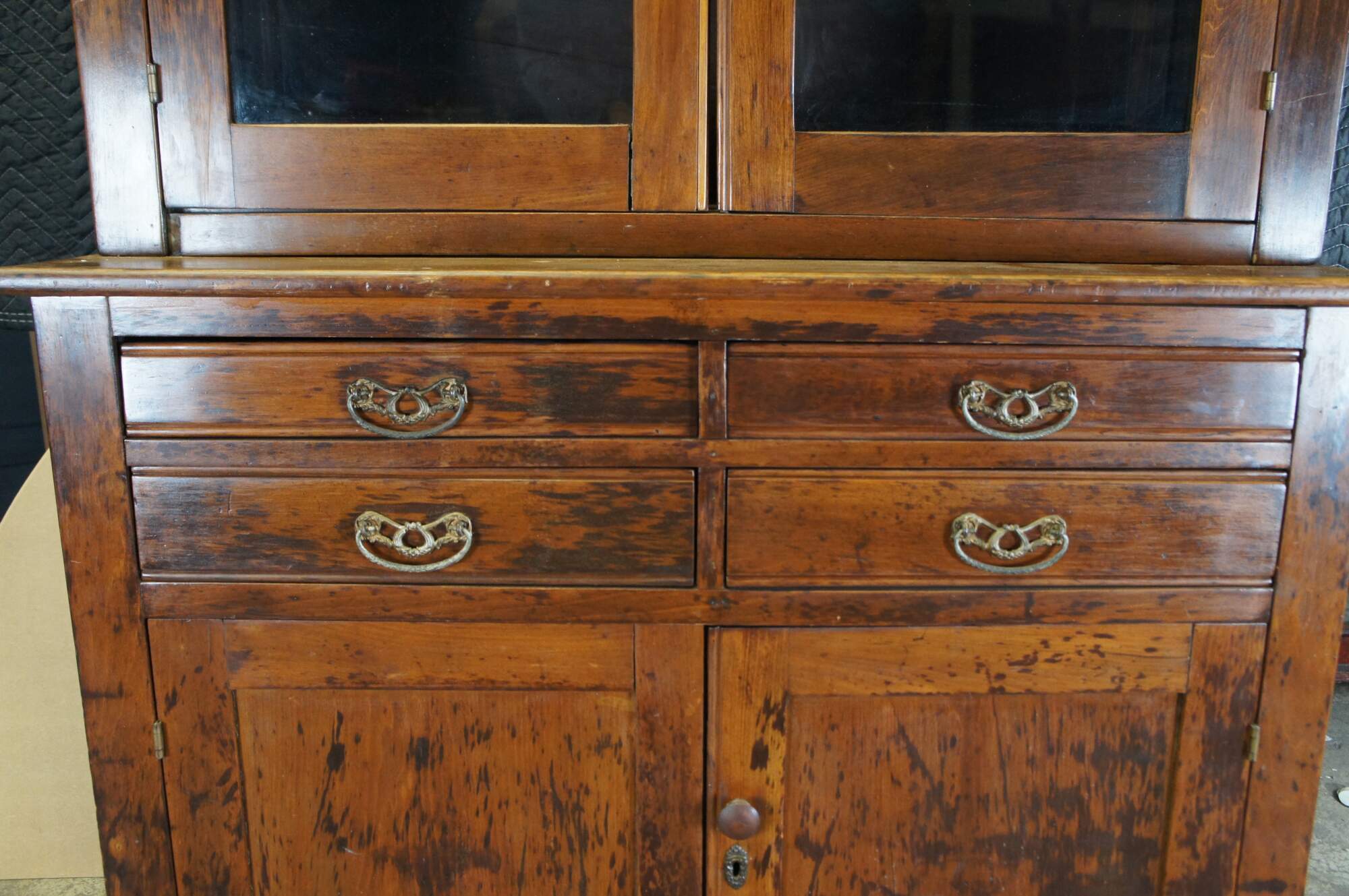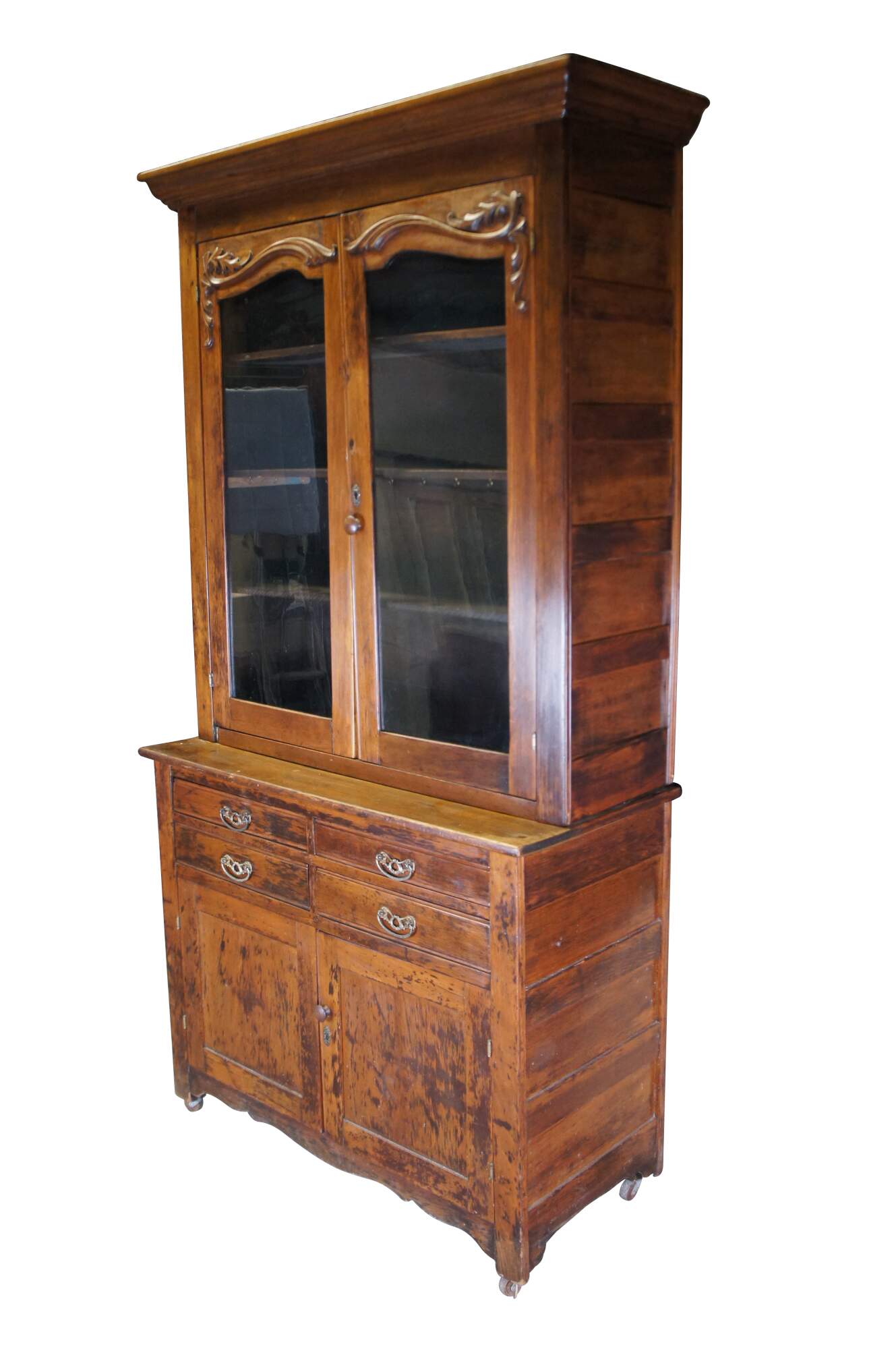 A beautiful Victorian stepback hutch. Features a naturally weathered, distressed and paneled oak frame. The upper hutch has semi-arched doors with applied carved foliate and opens to three adjustable shelves. Two of the shelves have hooks along the underside for hanging collectibles or utensils. The base showcases four drawers with brass hardware over two blind doors and an interior shelf. Upper two drawers are baize lined. Base is set over four larger casters allowing for ease of movement.