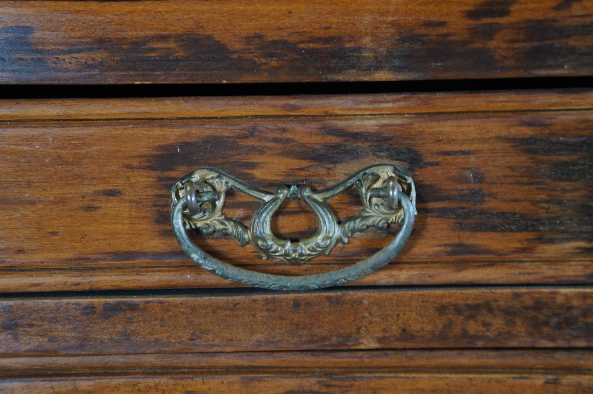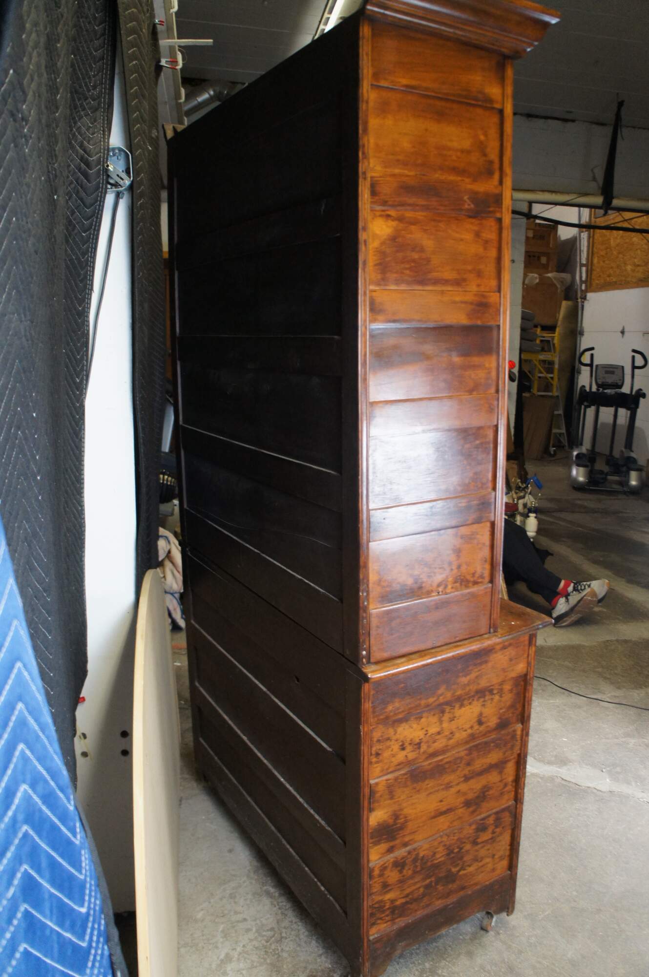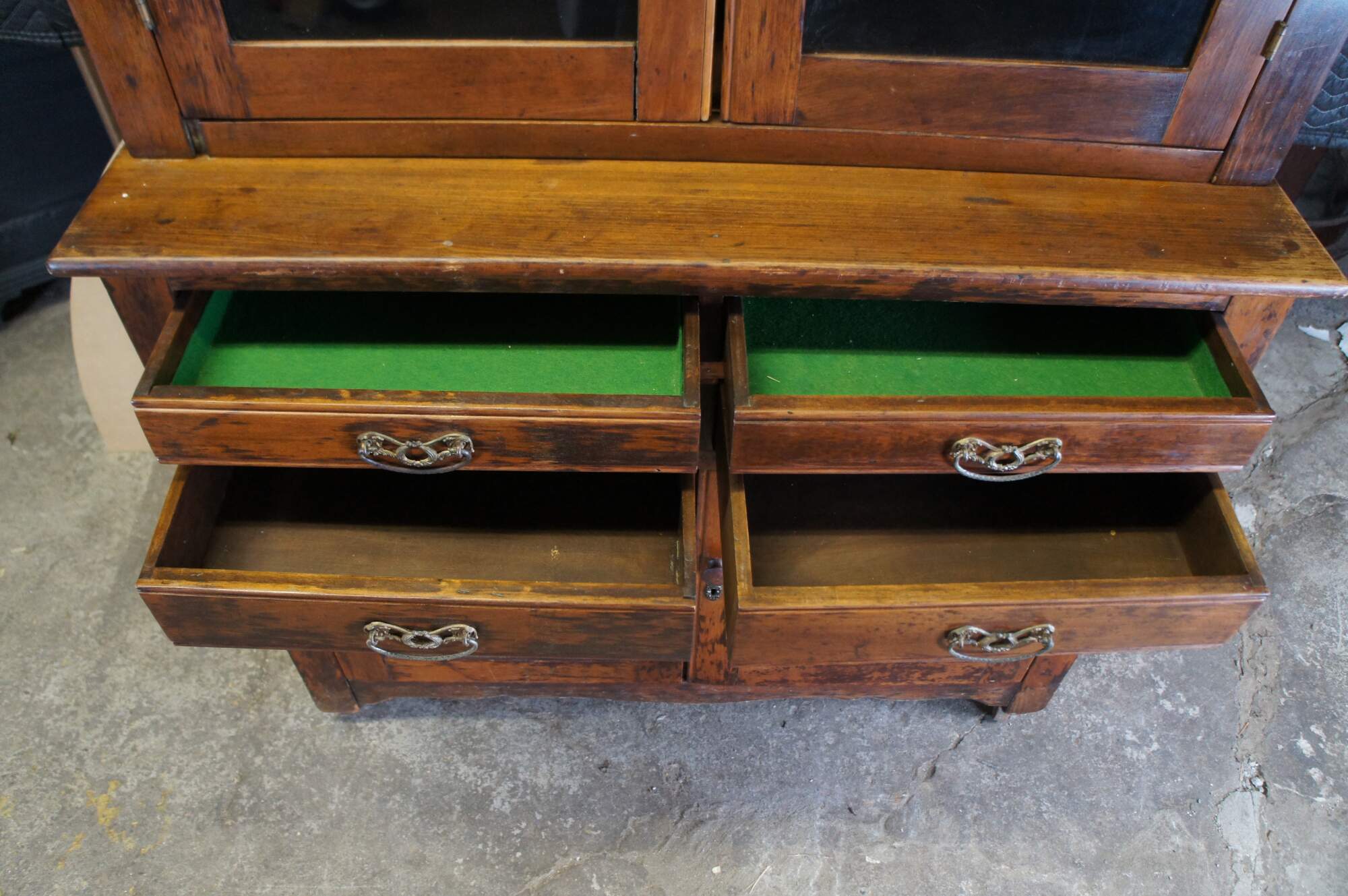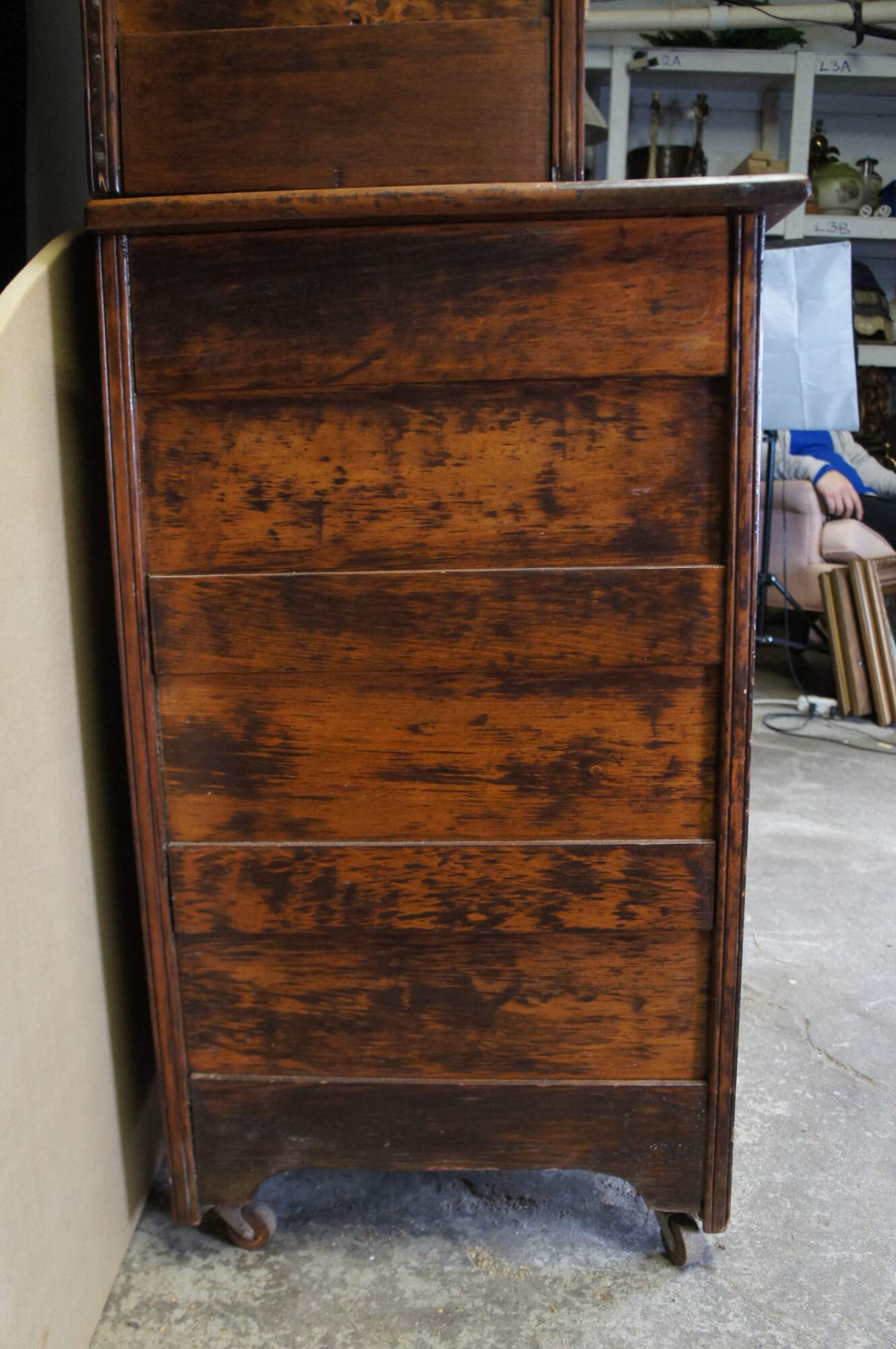 A beautiful Victorian stepback hutch. Features a naturally weathered, distressed and paneled oak frame. The upper hutch has semi-arched doors with applied carved foliate and opens to three adjustable shelves. Two of the shelves have hooks along the underside for hanging collectibles or utensils. The base showcases four drawers with brass hardware over two blind doors and an interior shelf. Upper two drawers are baize lined. Base is set over four larger casters allowing for ease of movement.