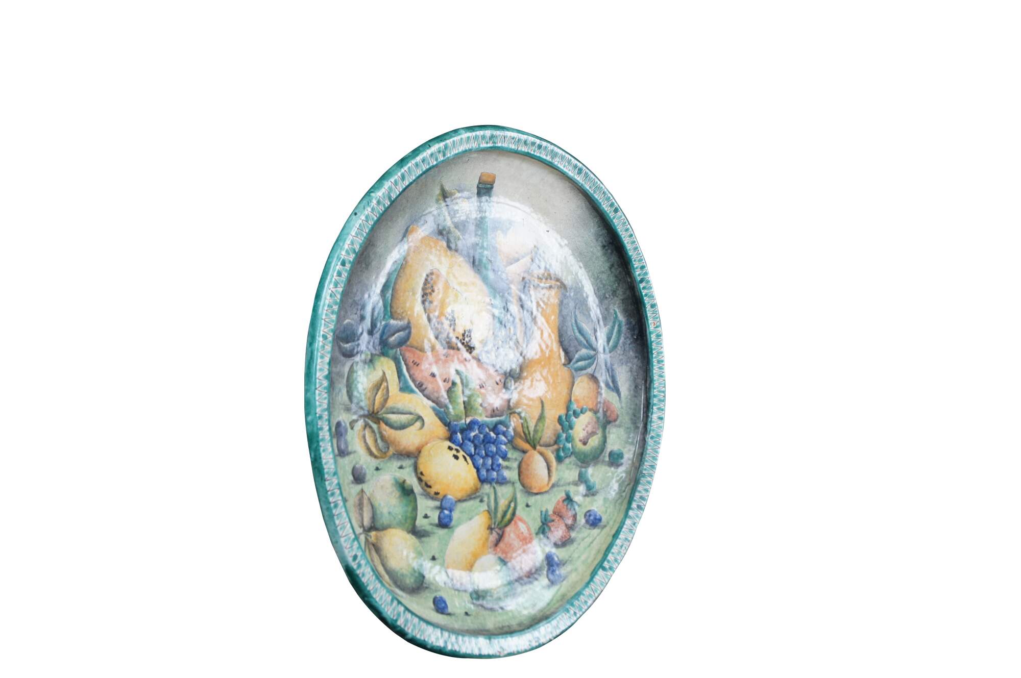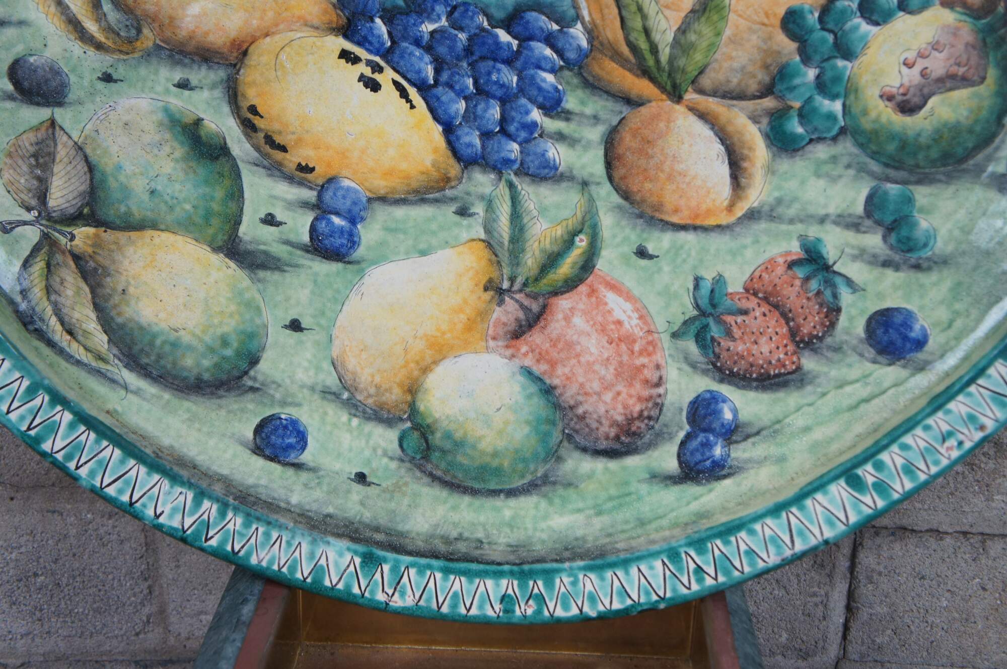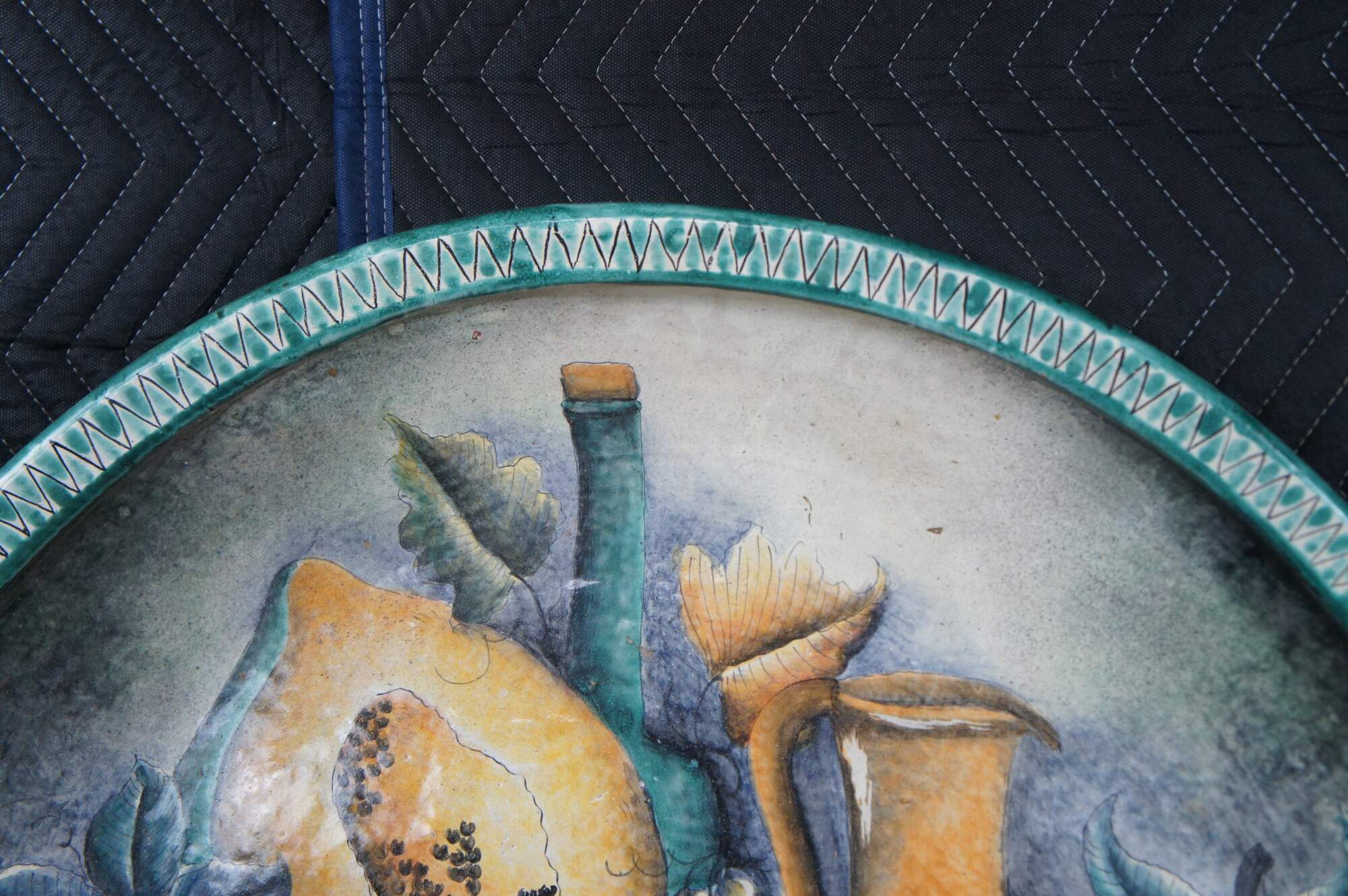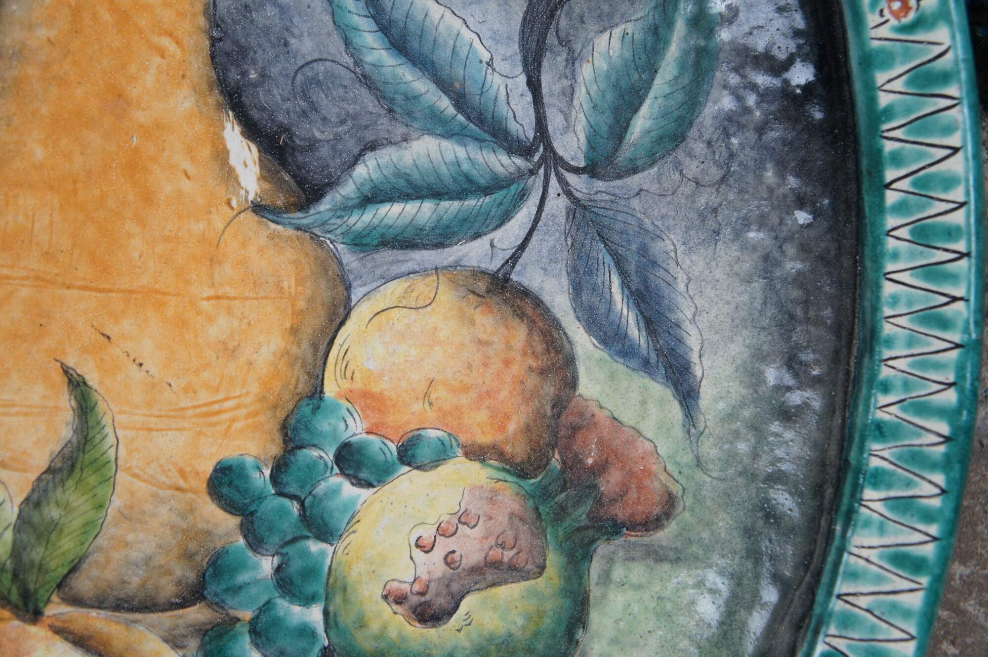 A very large and impressive 20th-century Mayolica Santa Rosa charger plate / platter / wall plaque featuring a design of a fruit - grapes, pears, apples, oranges, pomegranates, watermelon, peaches, cantaloupe, and vessels / pitcher and bottle. Made in Guanajuato City, Mexico.