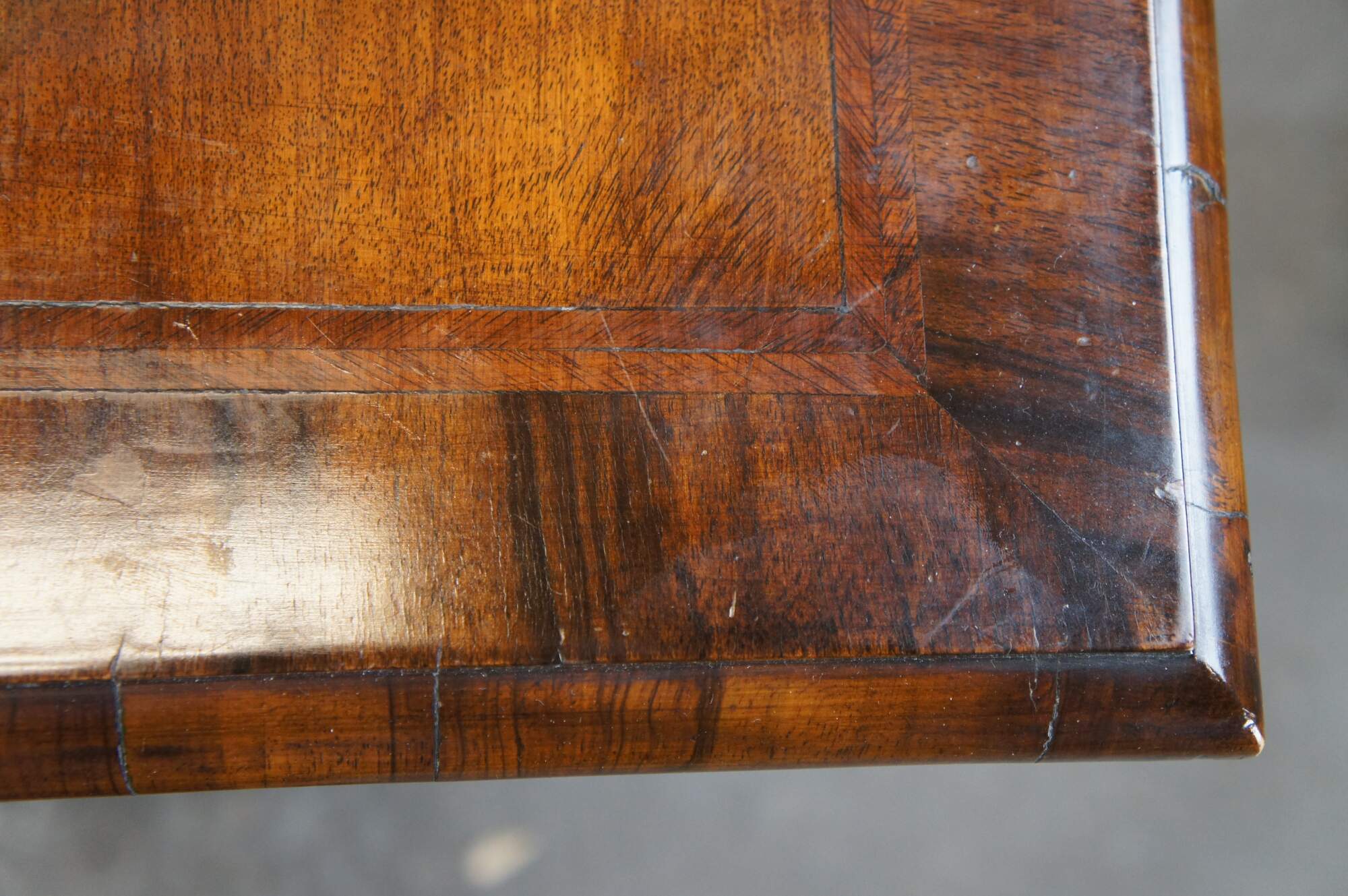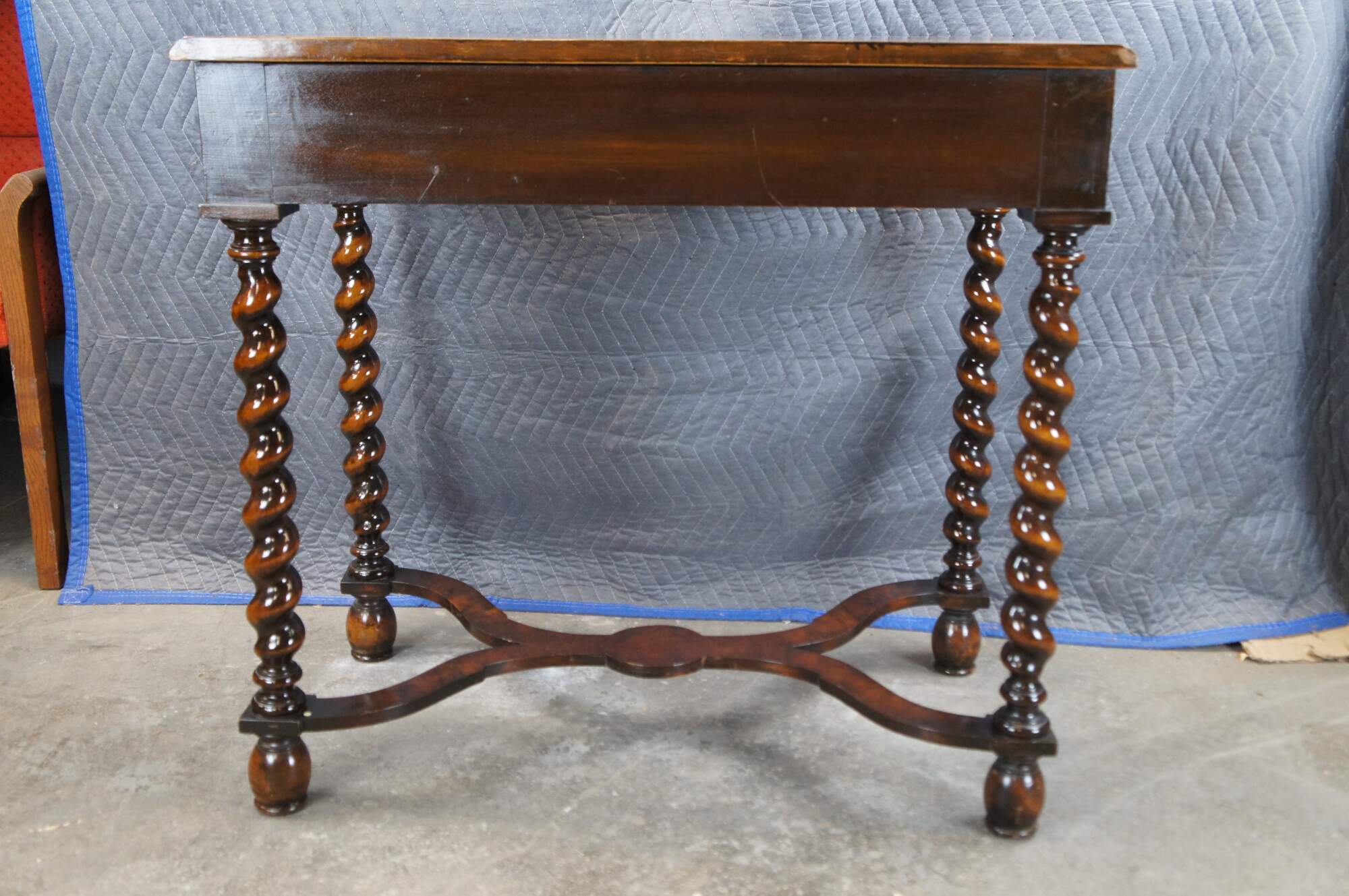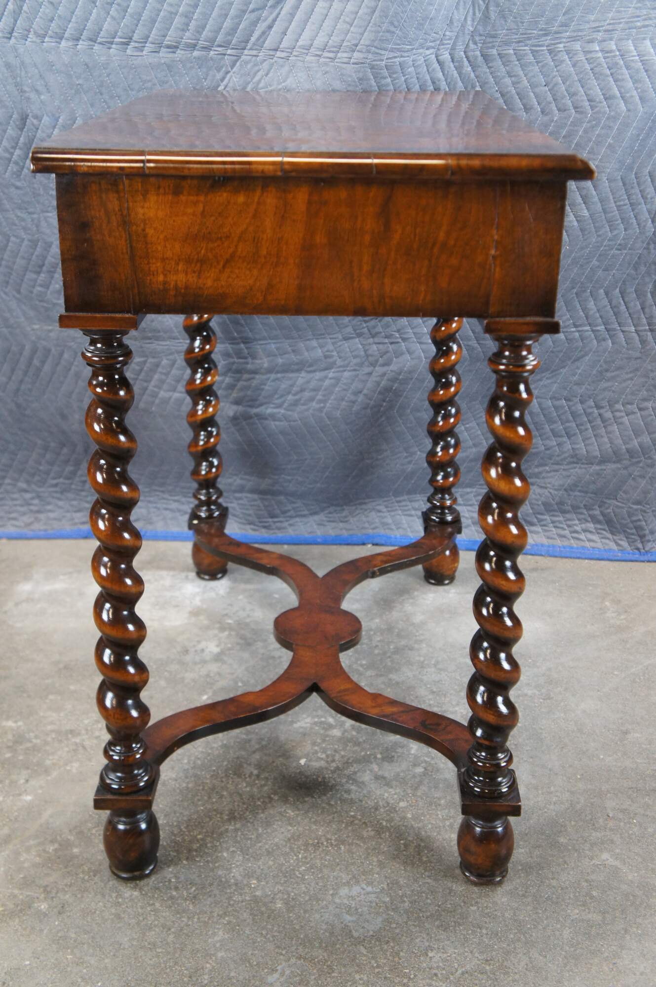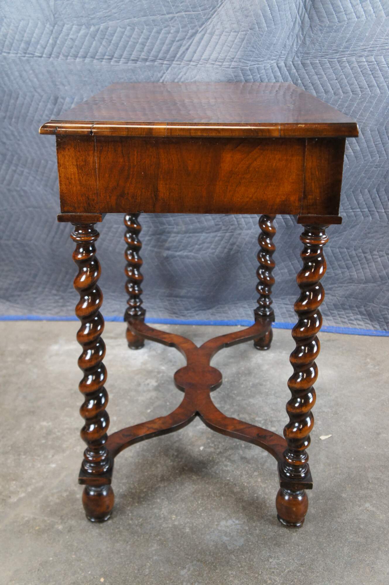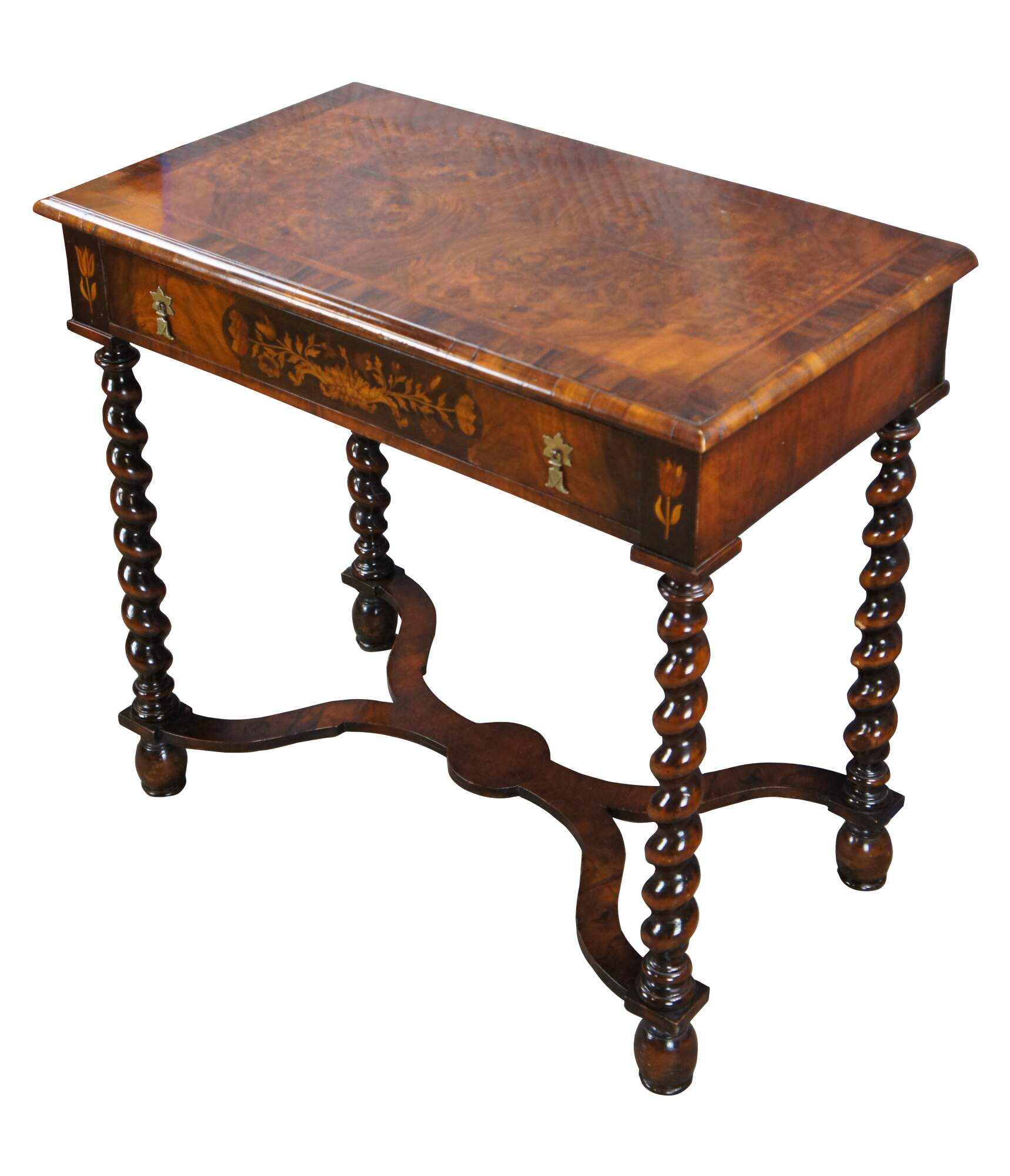 Antique mahogany William & Mary style dressing table / writing desk / console featuring rectangular form with matchbook / burl top over large marquetry inlaid drawer with fruitwood floral rose theme, supported by barley twisted legs connected by serpentine stretcher.