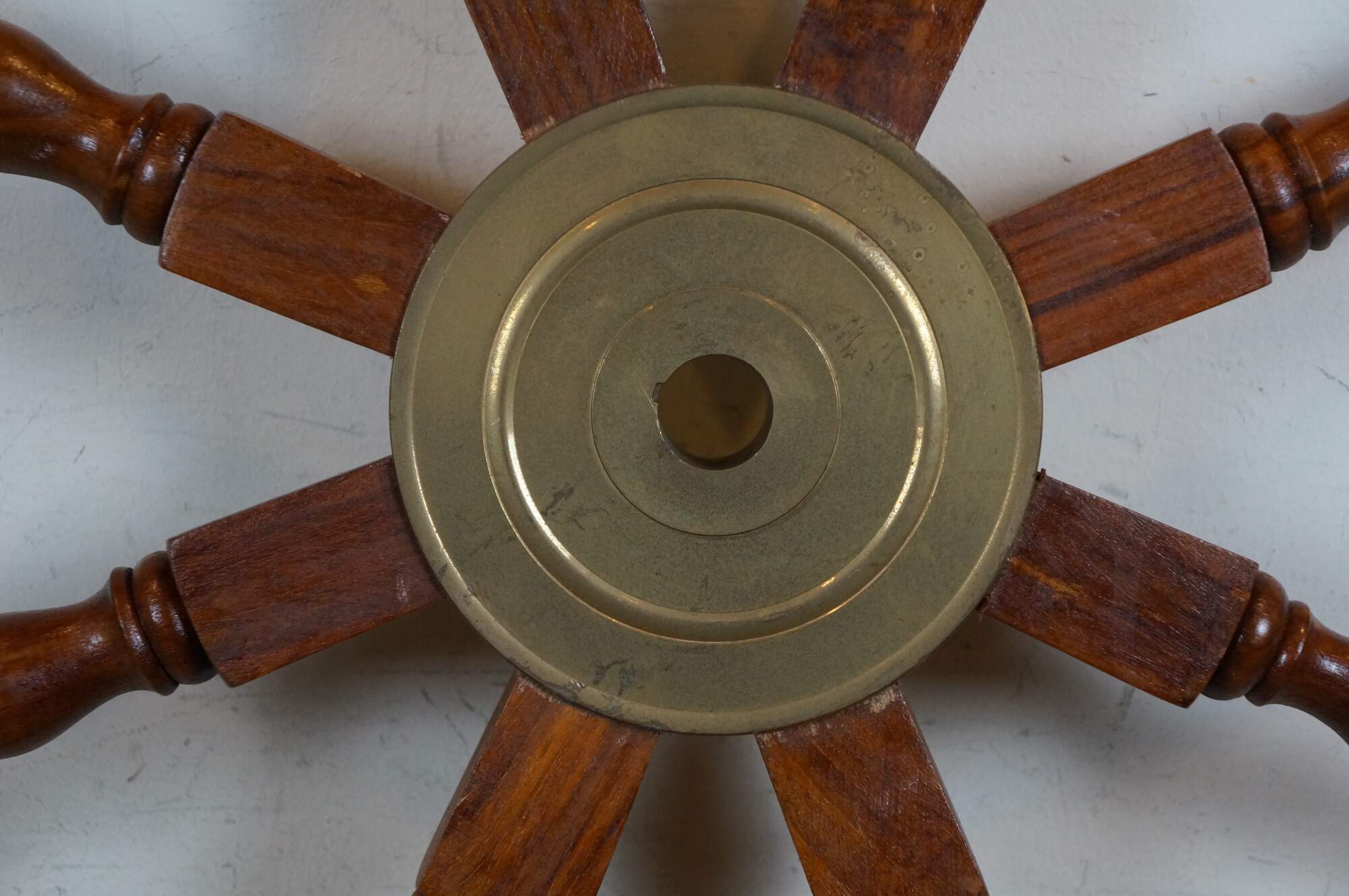 Antique oak ship's wheel with eight turned spokes and brass center.