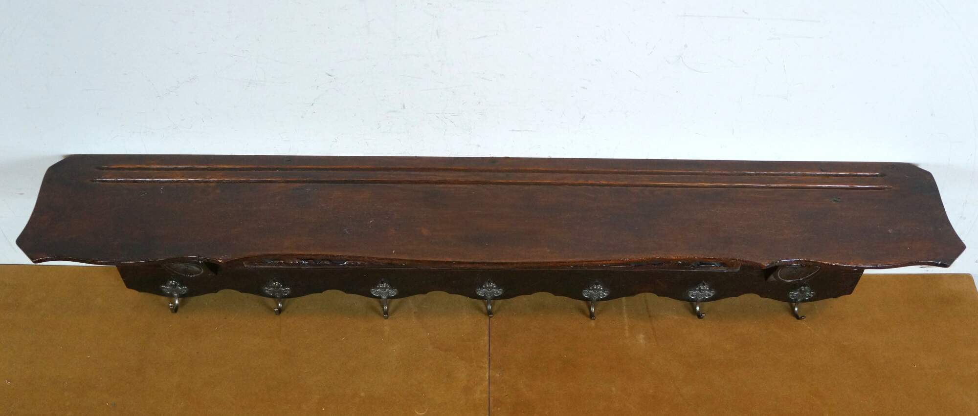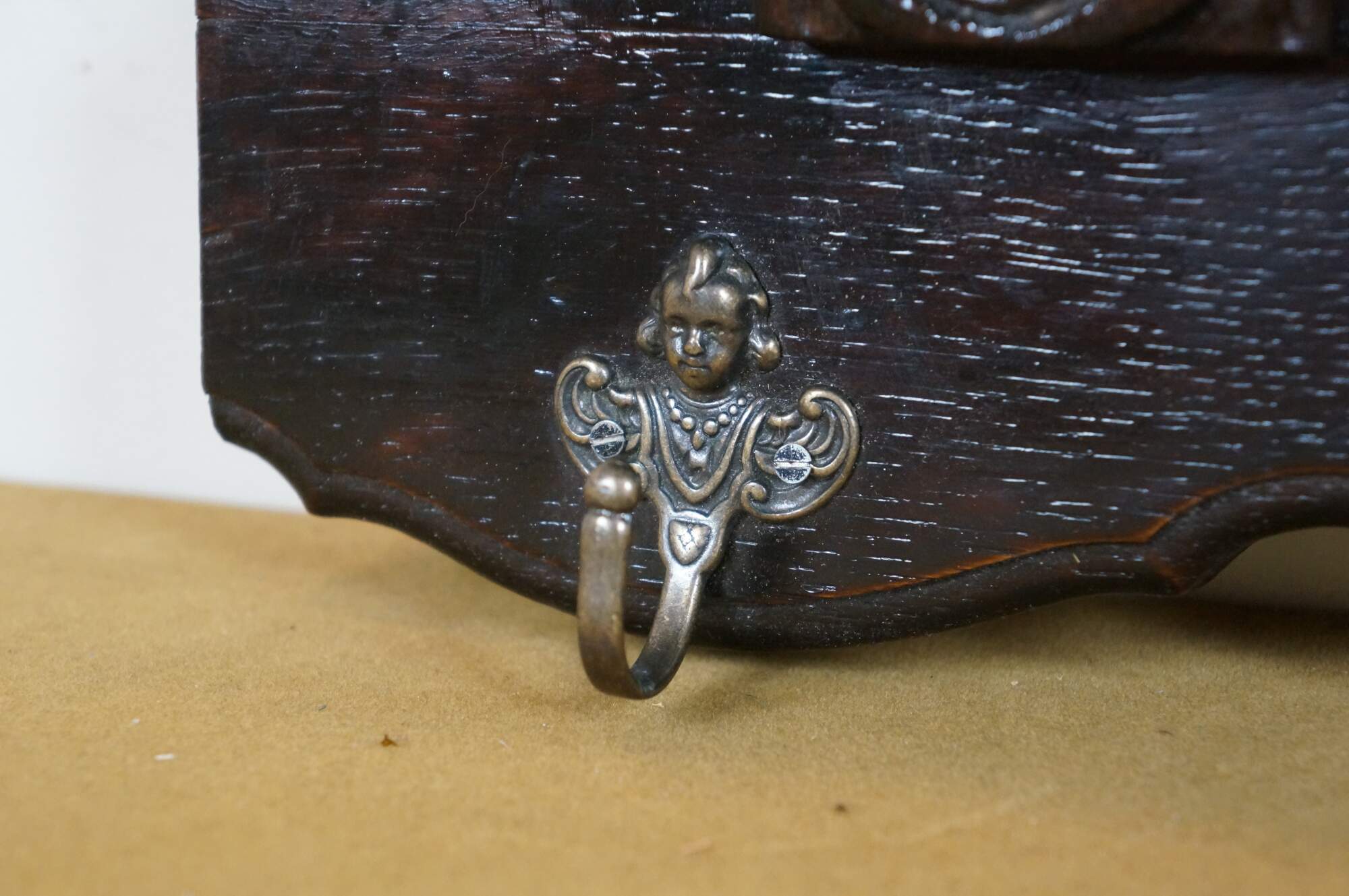 Antique carved wood wall hanging hall tree featuring seven cherub / angel / putti shaped hooks for coats / hats. Carved scene depicts a pair of hunters seated for a rest with a horn and tankard. An upper shelf with groove for displaying plates is supported with a male and female pair of carved busts.