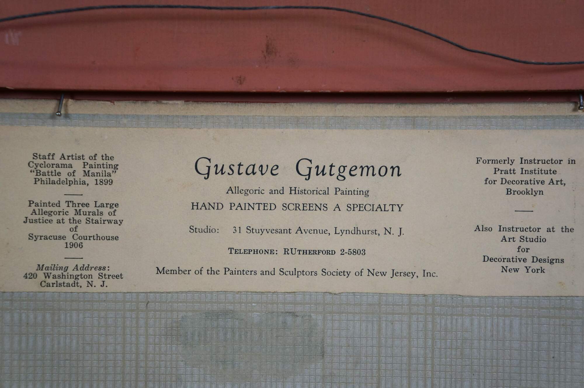 "Gustave Gutgemon (1867 - 1959) was active/lived in New York / Germany. Gustave Gutgemon is known for Portrait painting, murals, cyclorama. He was one of six Staff Artists who in 1899 in Philadelphia produced a cyclorama depicting the Battle of Manila. Their work toured the nation. In 1906 he painted three large allegoric murals of Justice that still adorn the stairway of the Syracuse Courthouse. He was a member of the Painters and Sculptors Society of New Jersey, Inc, and a former instructor at the Pratt Institute for Decorative Art, Booklyn and the Art Studio for Decorative Designs, New York. Gutgemon's studio was a converted stable at the rear of 31 Stuyvesant Avenue, Lyndenhurst, NJ." (Source: askART / Studio Label)