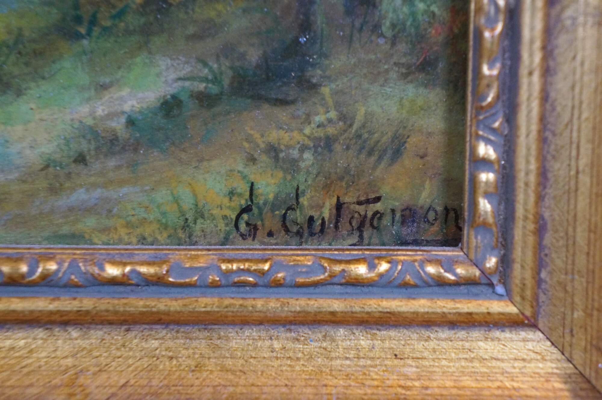 Beautiful antique mid to early 20th century oil painting on board by Gustave Gutgemon, depicting an idyllic landscape featuring a cottage by a lake at the foot of a range of mountains. Signed in lower right. Artists studio label on reverse. Beveled and foliate carved giltwood frame.