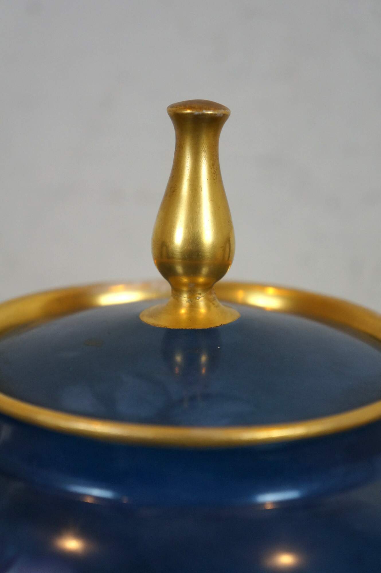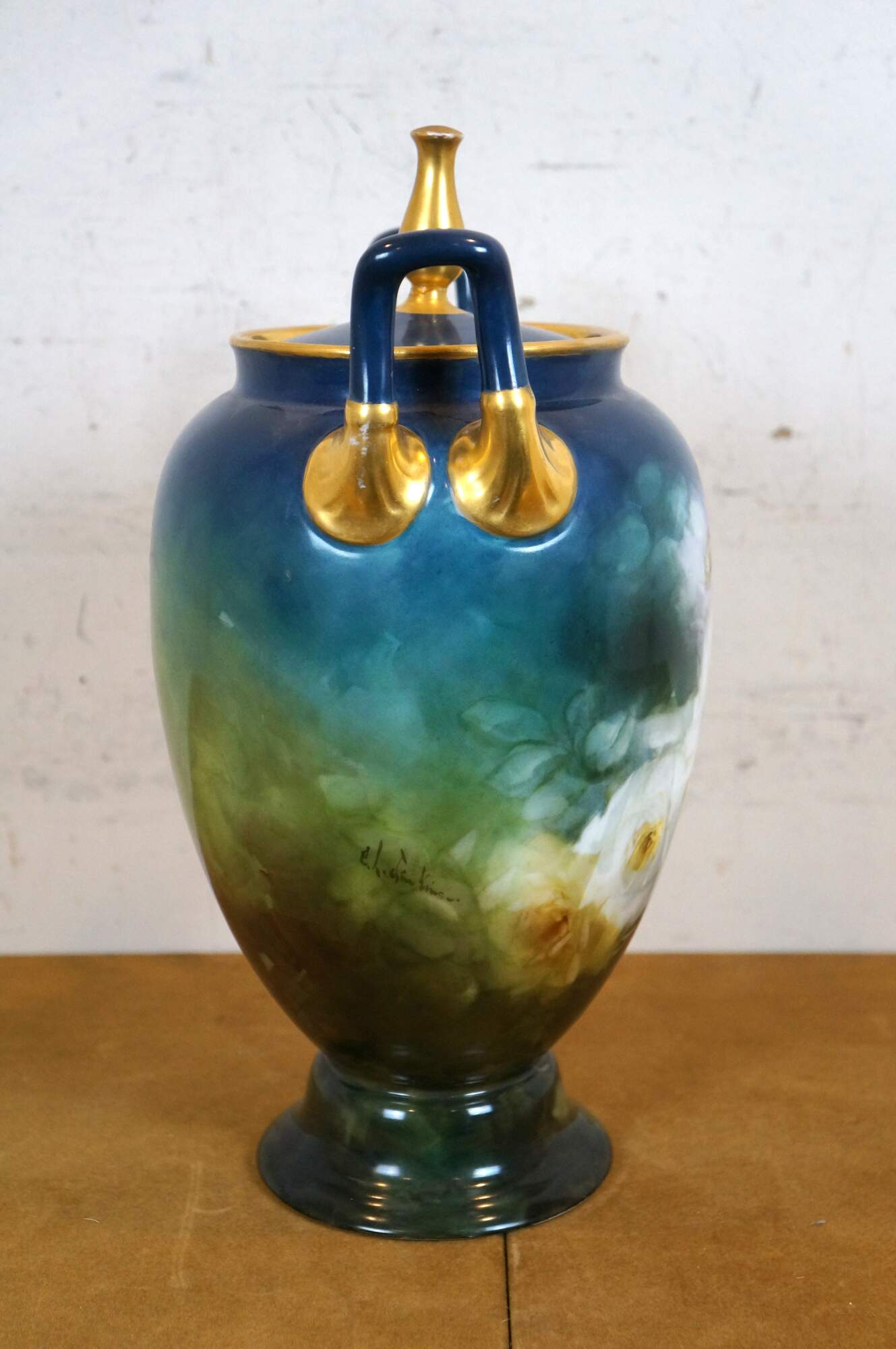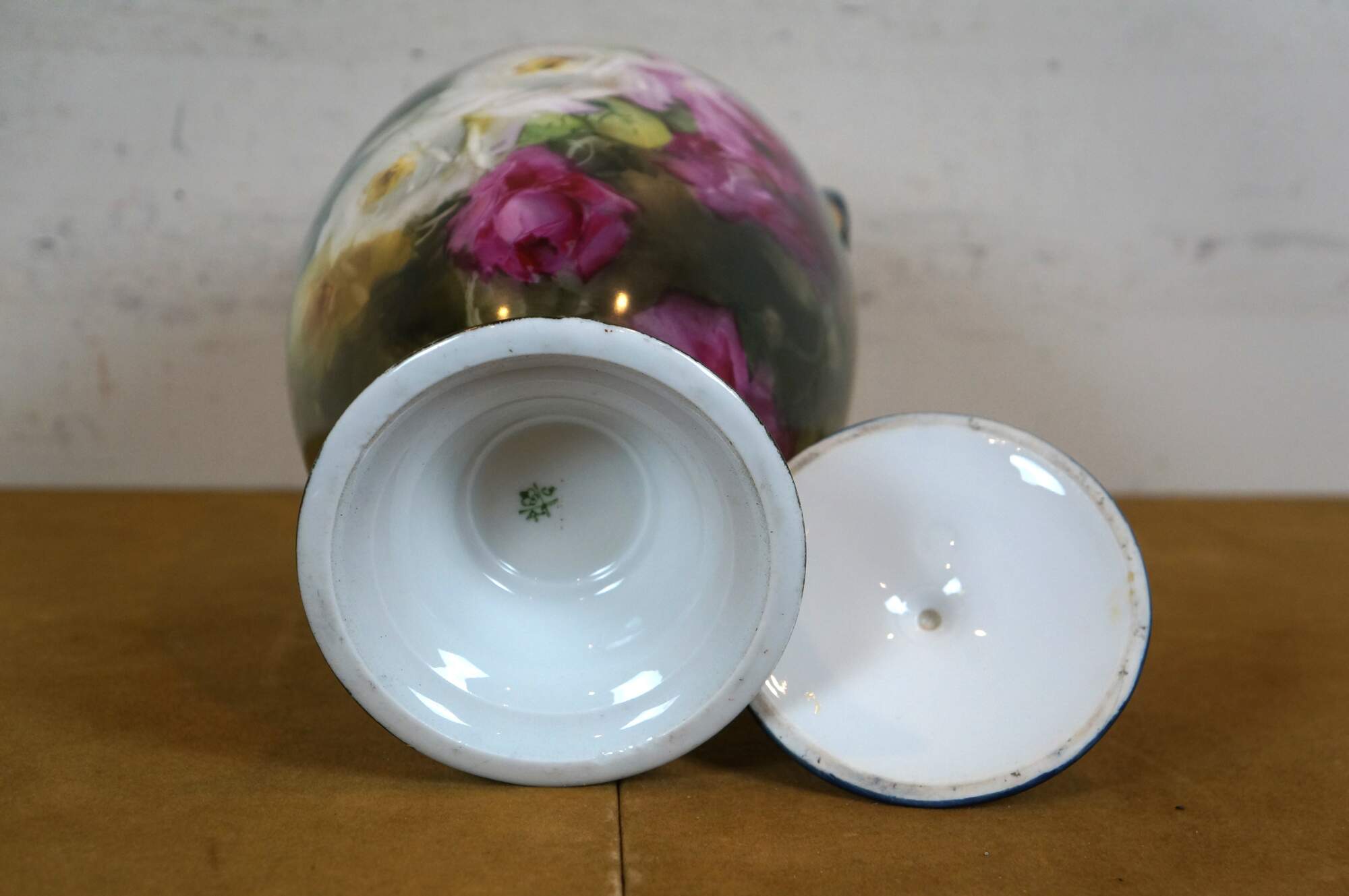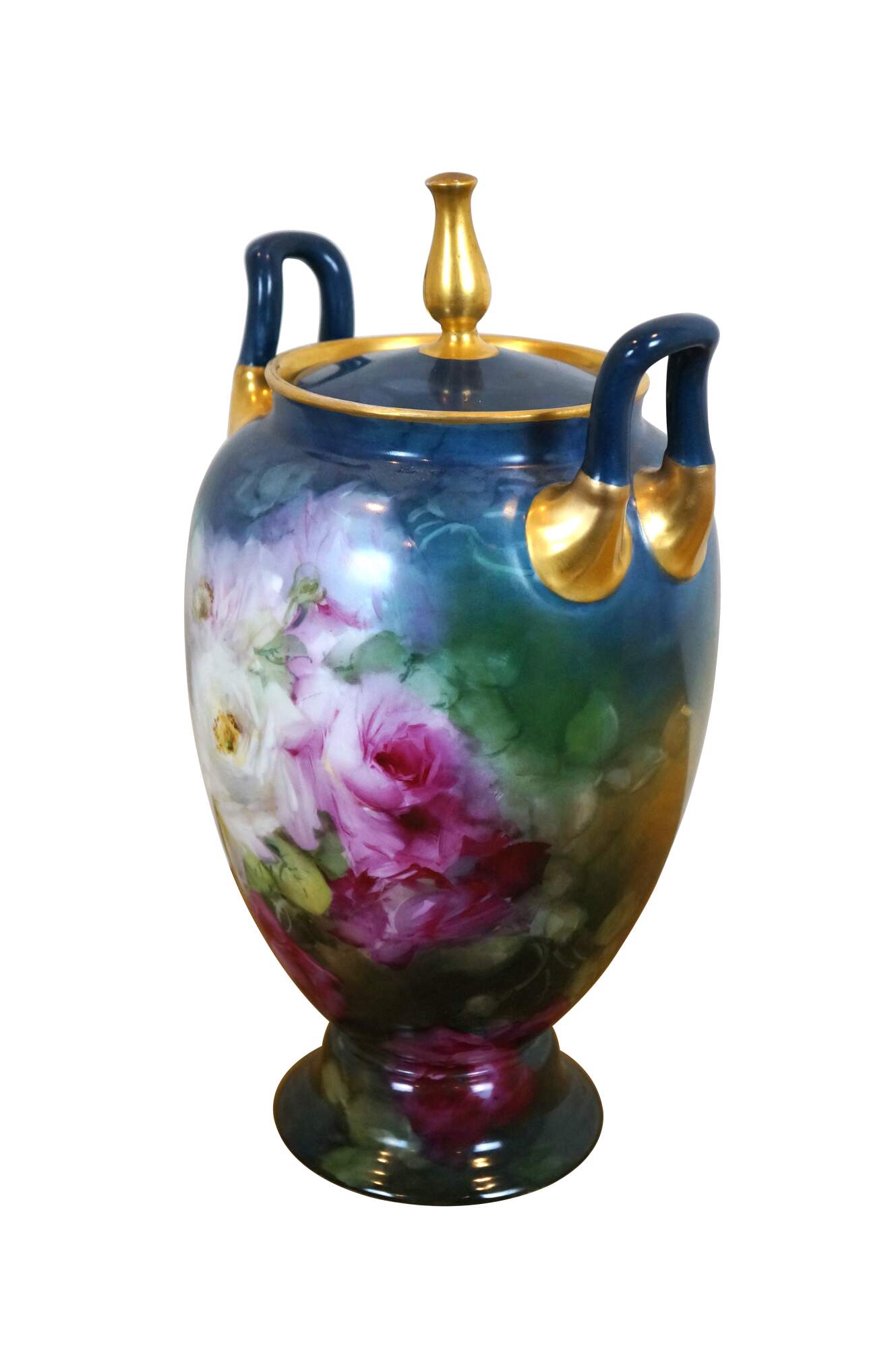 Late 19th to early 20th century Rosenthal porcelain urn. Hand painted with pink and white roses on a blue and green background, features lid with tall finial and two raised handles trimmed with gold. Marked used circa 1891-1906. Painted in Wein Bavaria German.