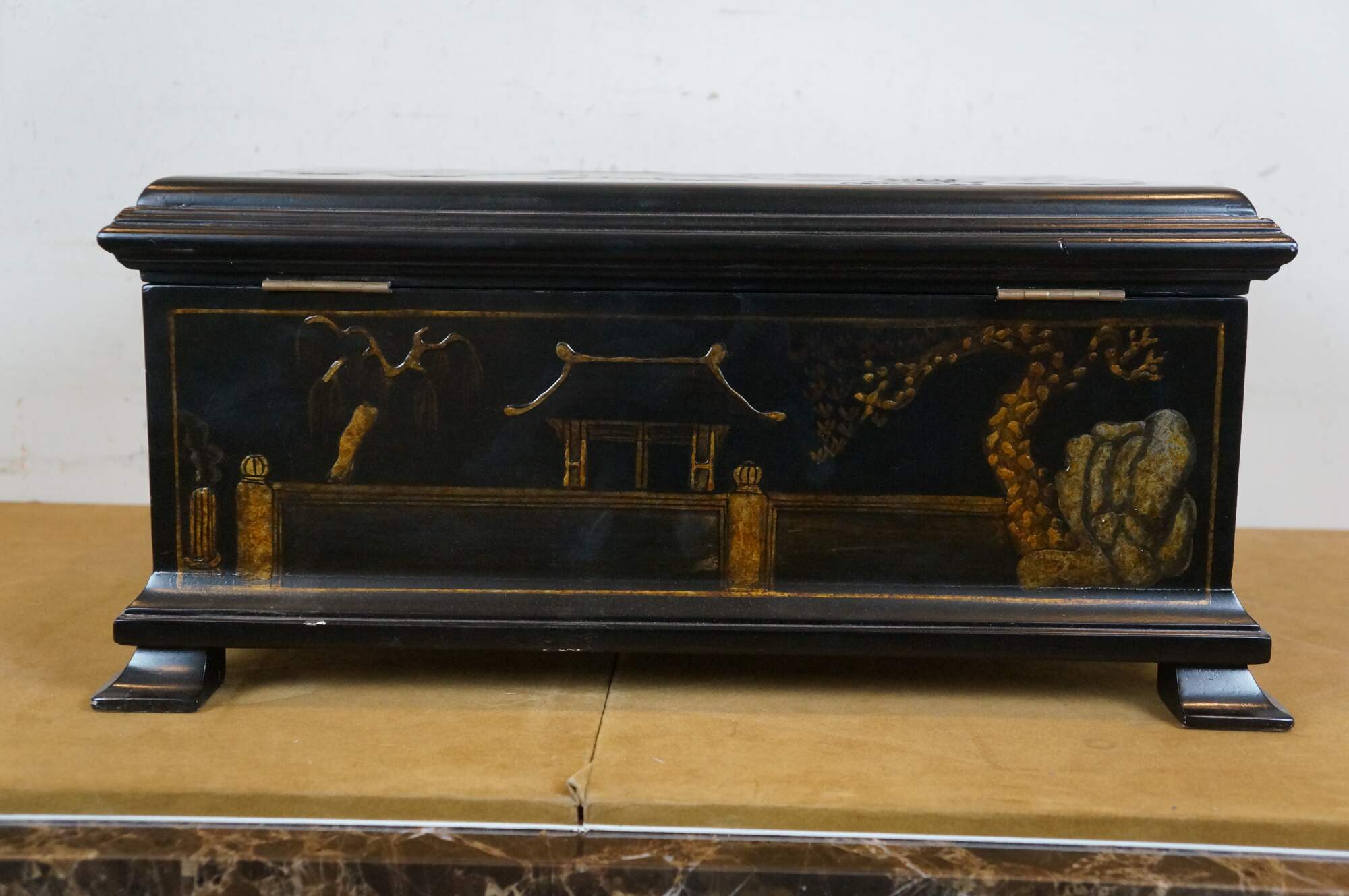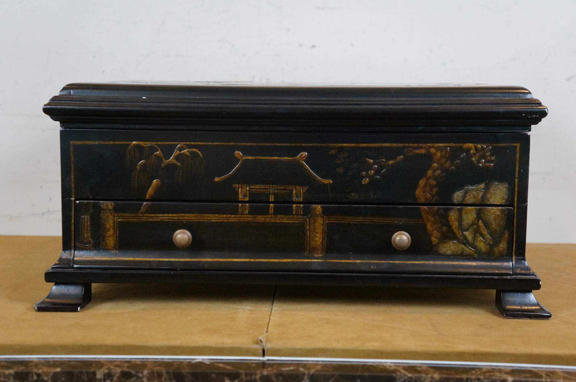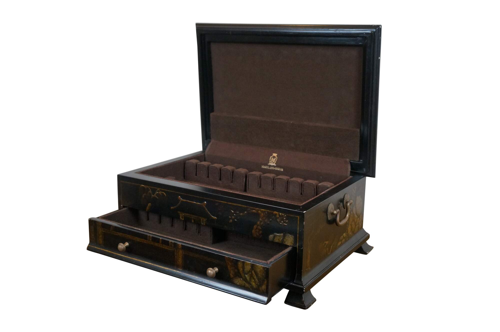 Late 20th century black lacquered chinoiseries silverware chest by Maitland Smith. Features a scene of familial figures in a garden on the lid and Chinese landscapes along the sides. Flip top and single drawer with brown felt lining. Brass pulls and bail handles. Hand Made in Philippines.