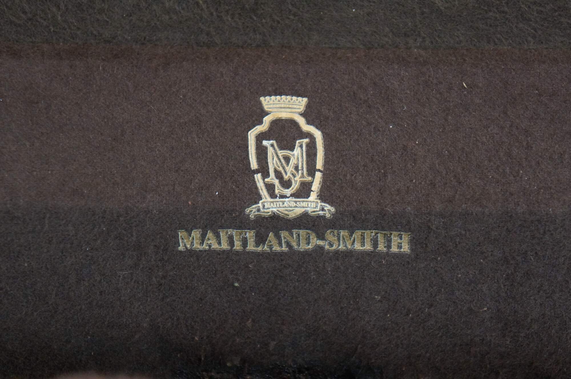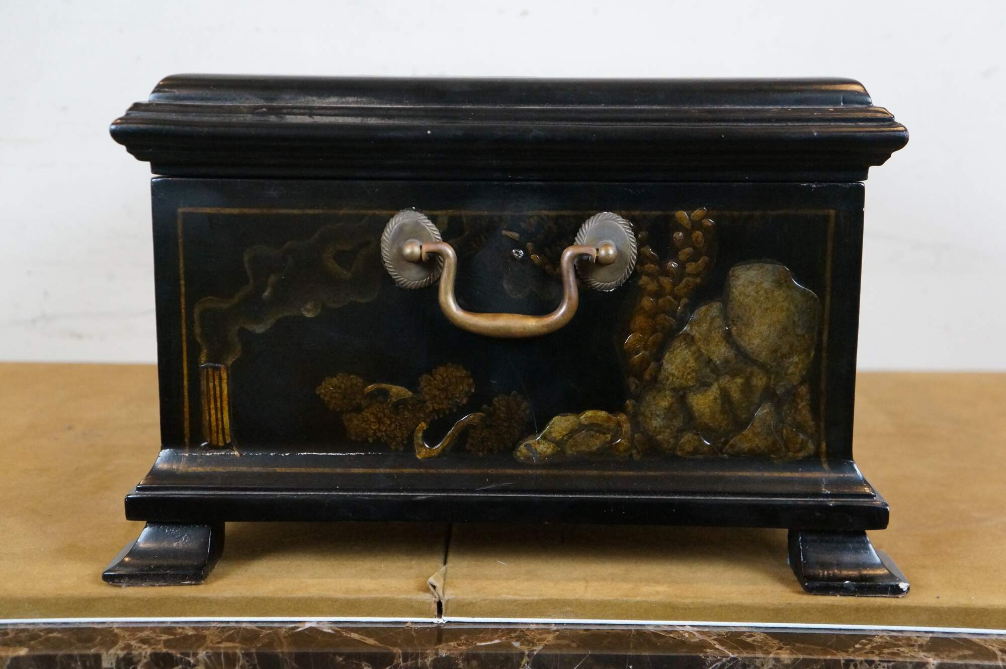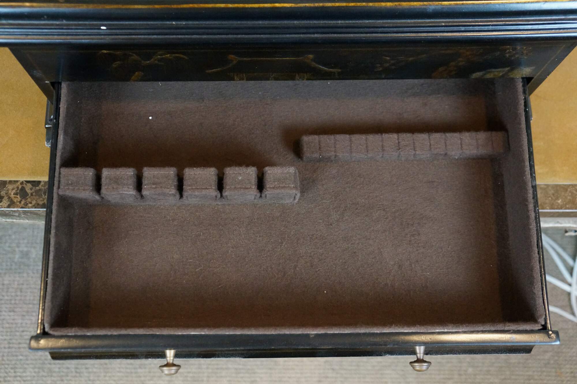 Late 20th century black lacquered chinoiseries silverware chest by Maitland Smith. Features a scene of familial figures in a garden on the lid and Chinese landscapes along the sides. Flip top and single drawer with brown felt lining. Brass pulls and bail handles. Hand Made in Philippines.