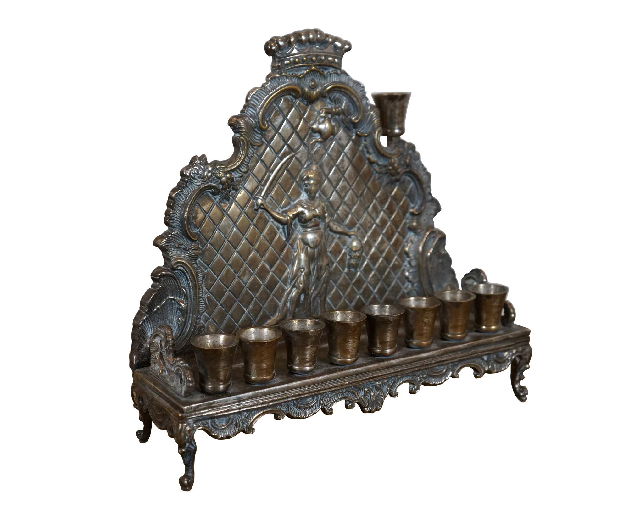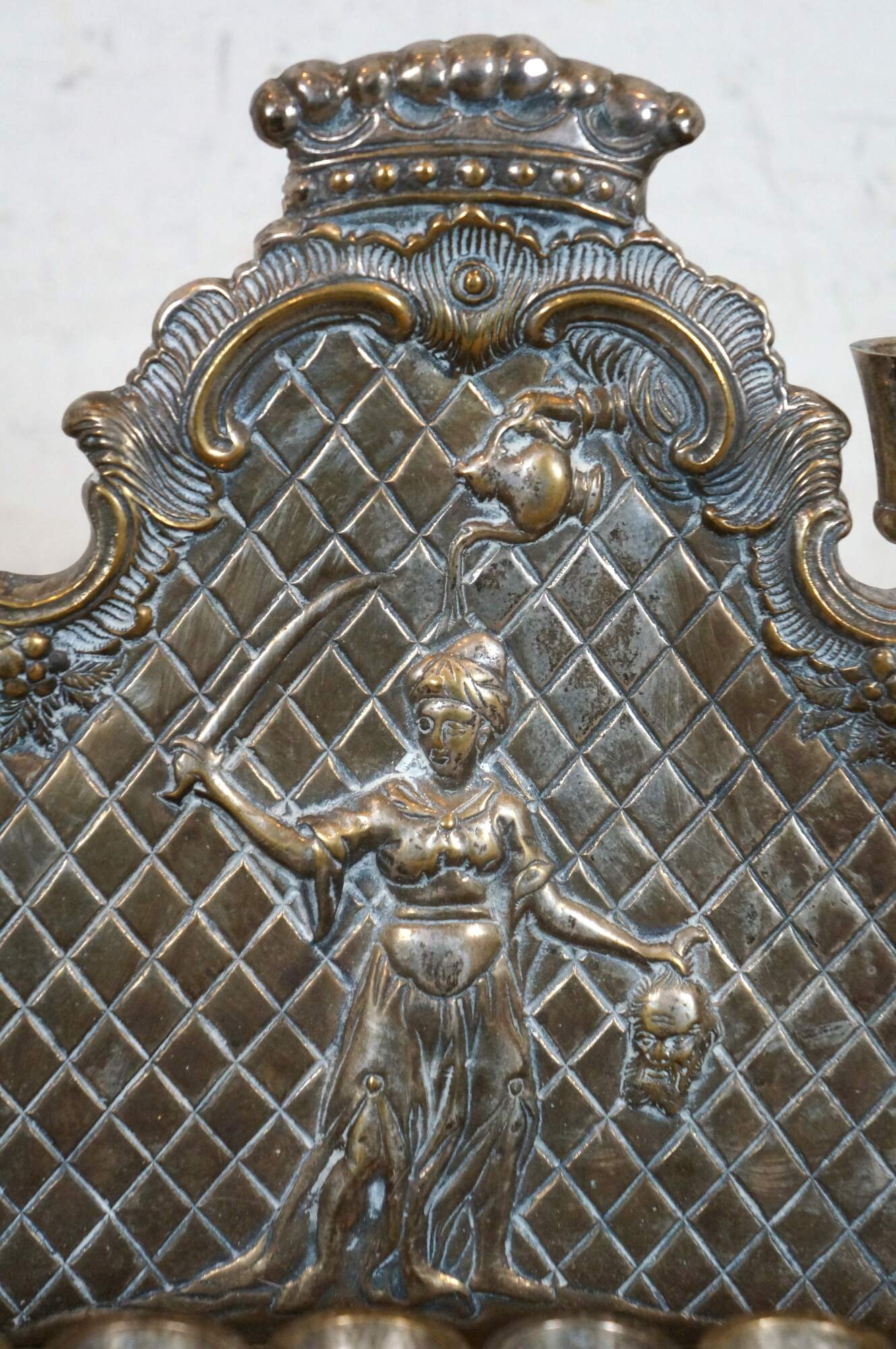 This menorah oil lamp tells the story of Judith's beheading of Holofernes, Nebuchadnezzar’s general, who was sent to suppress the Jewish people. The Jewish people, besieged by the enemy, are about to lose all hope and surrender. Judith, in a final attempt to increase morale and retrieve courage in the Jewish camp, decides to seduce Holofernes with her beauty, and finally, cuts his head off when he's drunk. She holds up Holofernes' severed head as a trophy and manages to regain the Jewish camp's courage to fight off the enemy.