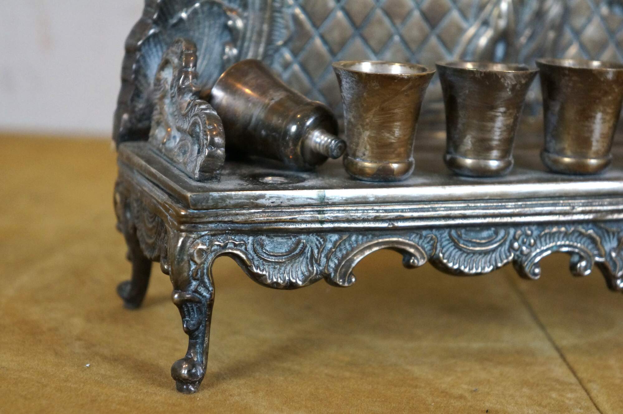 Large, heavy, vintage, late 20th-century silver-plated menorah, produced by The Jewish Museum. Design features eight screw-in candle cups on a rectangular base with scalloped / foliate legs and edging, behind which is a backsplash depicting Jewish / Old Testament heroine Judith, carrying her sword and the head of Holofernes, while a heavenly hand anoints her with water from above. Judith is framed in more foliate swags with a crown at the top and an additional shamash candle cup on the right-hand side.