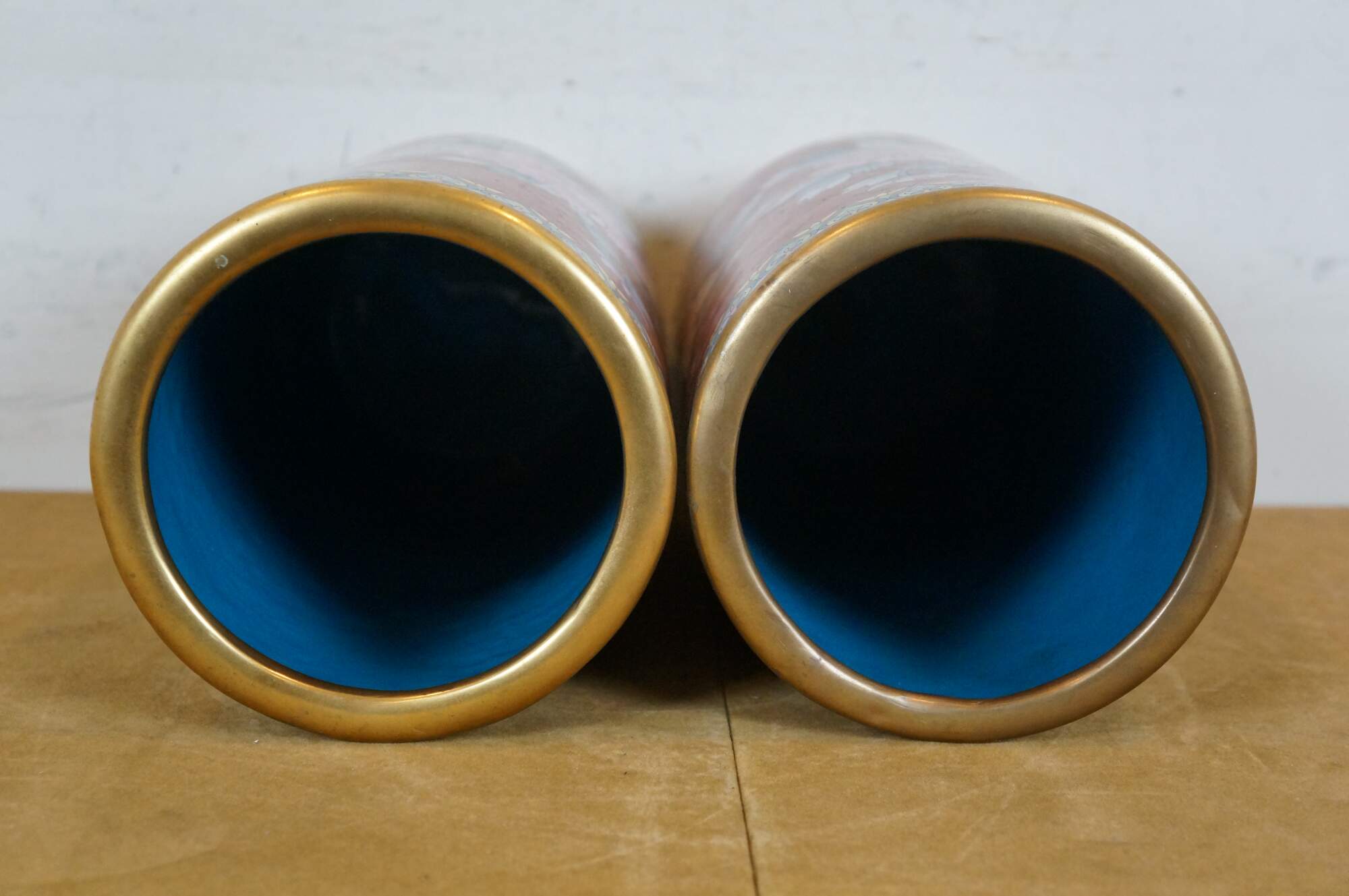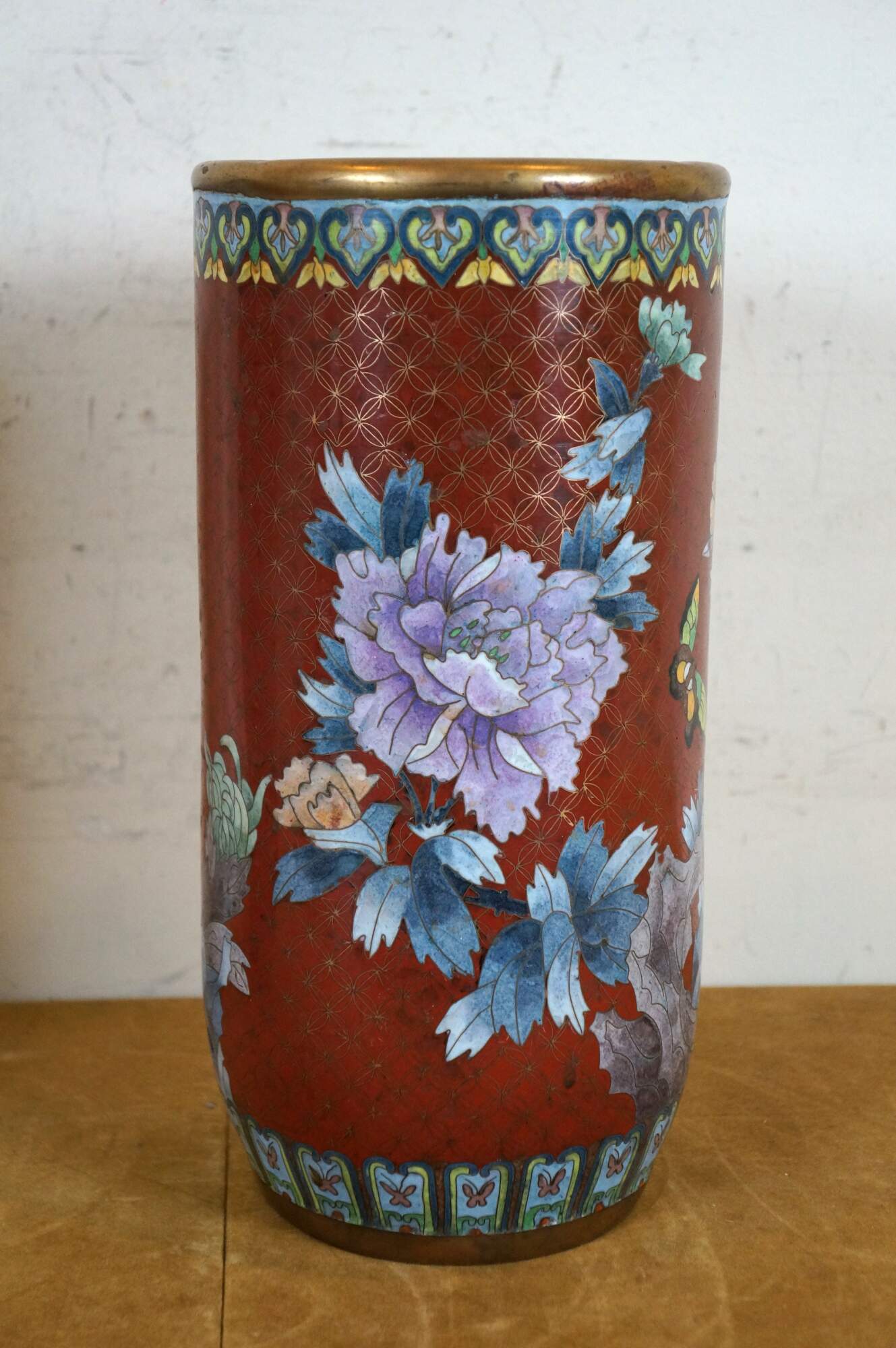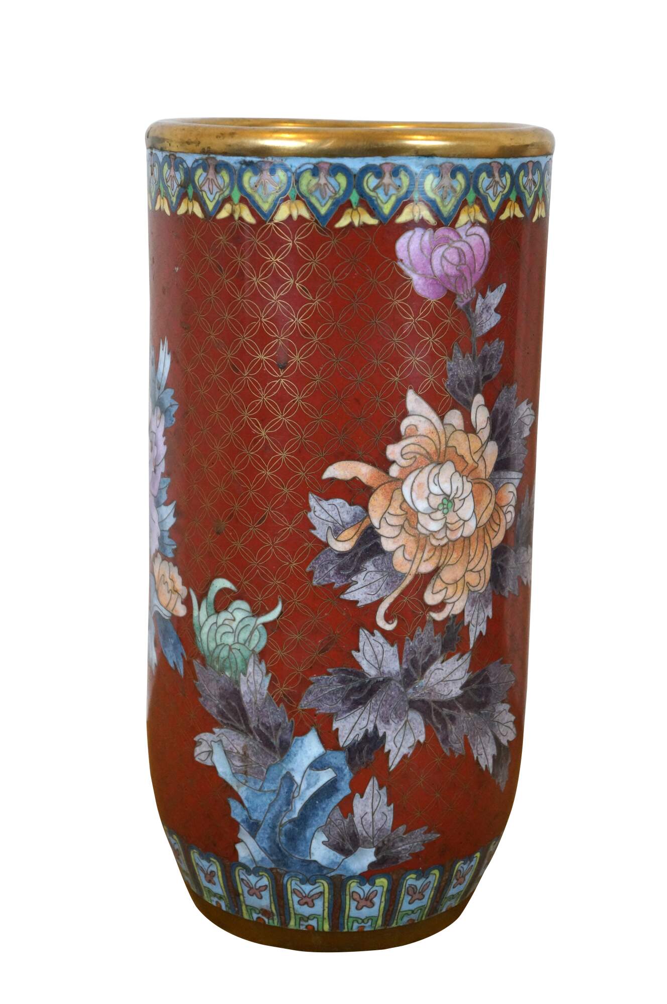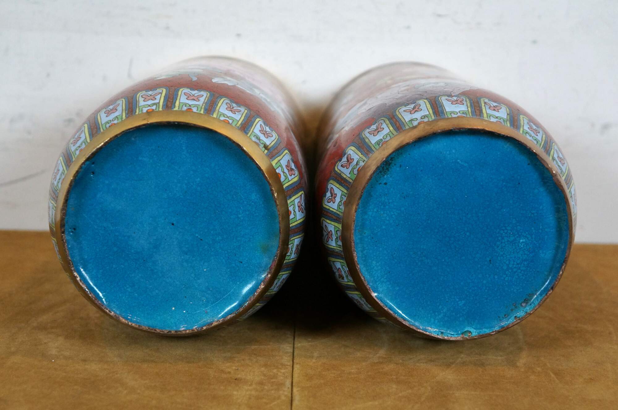 Pair of mid to early 20th-century Chinese cloisonne enamel cylindrical mantel vases/ urns/ hat stands, featuring a red background patterned with interlocking circles behind blue and purple chrysanthemum flowers, green and yellow butterflies, and turquoise floral and butterfly borders. Robin's egg blue/turquoise interior and base.