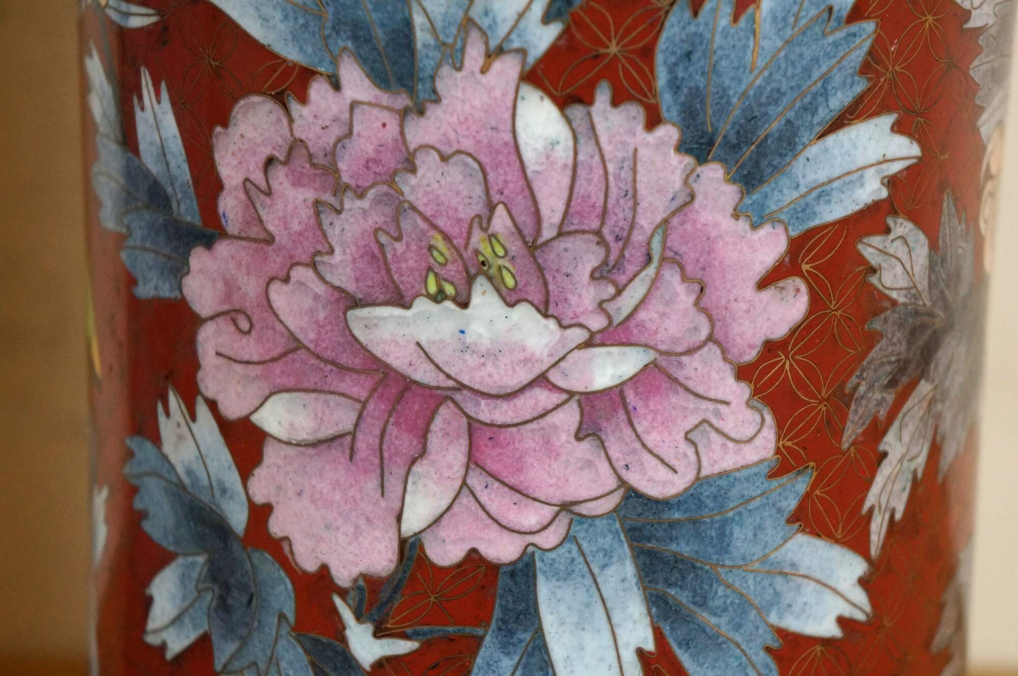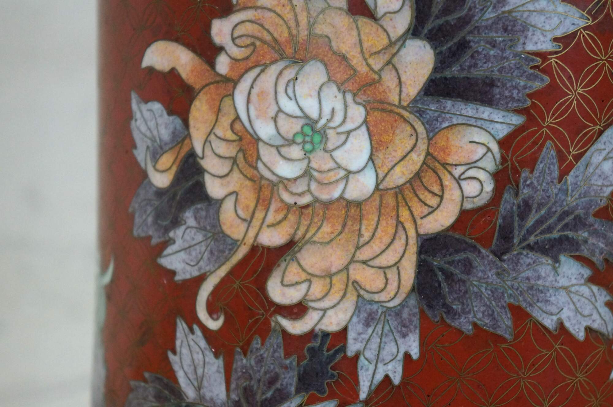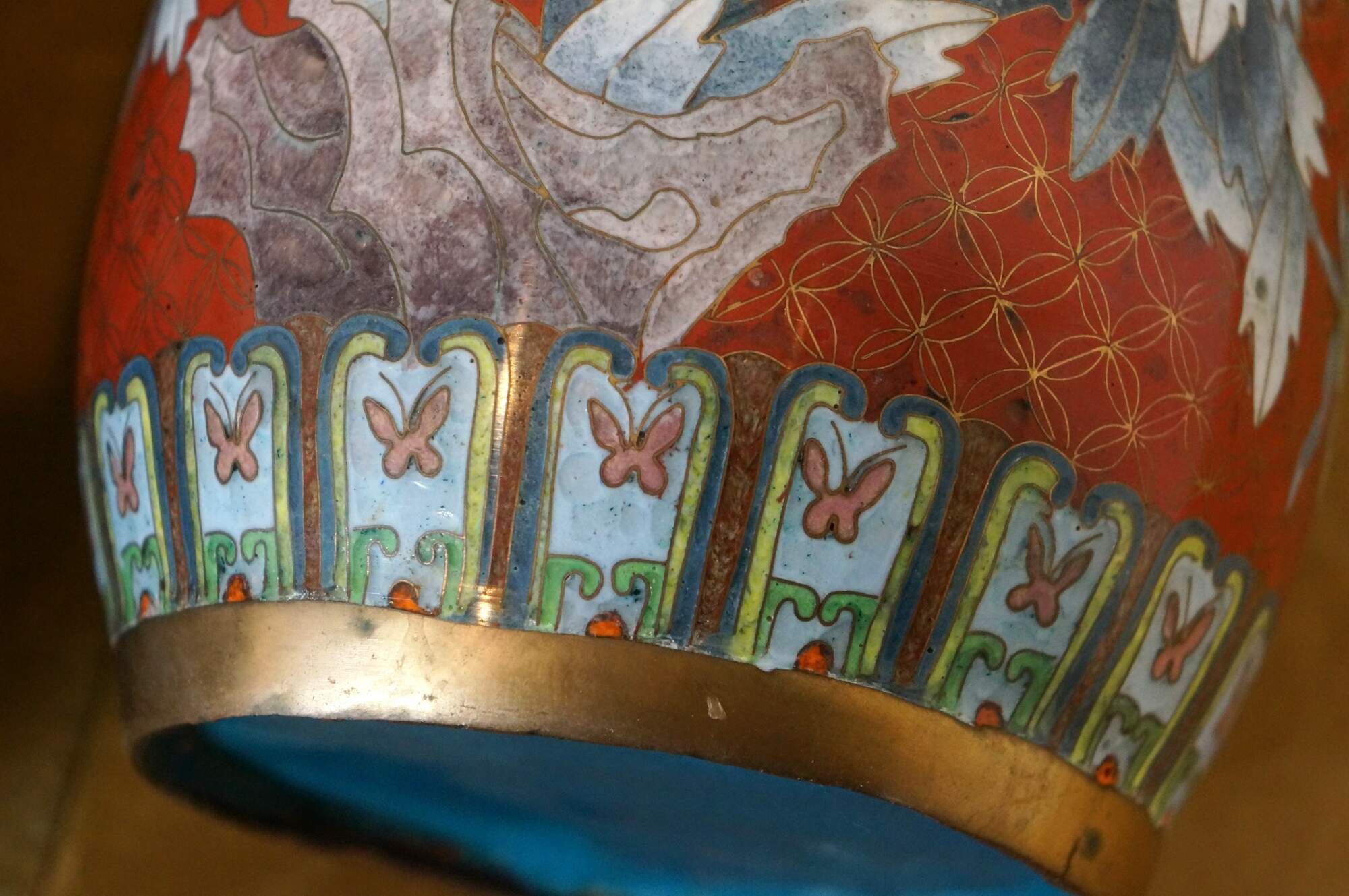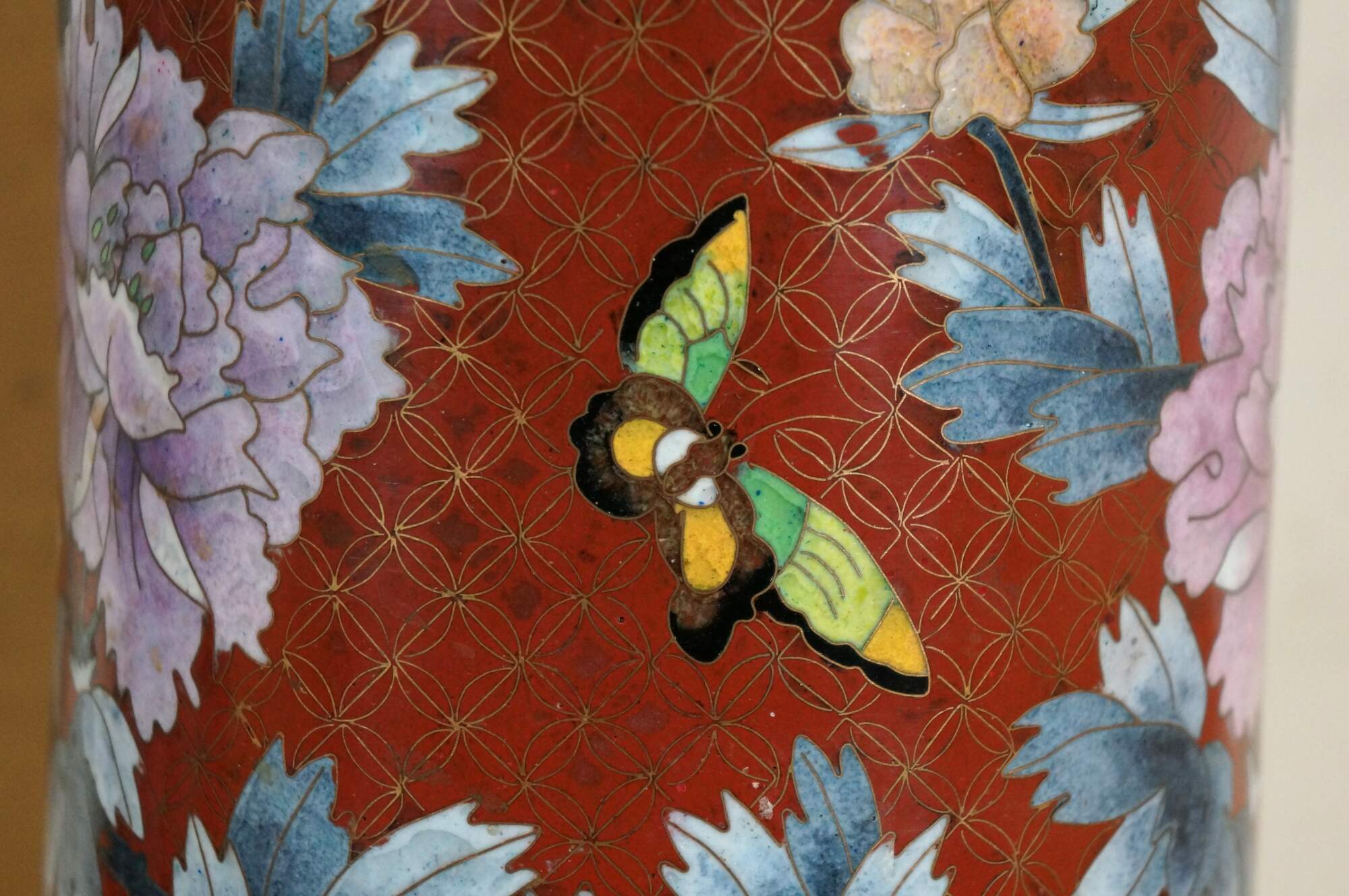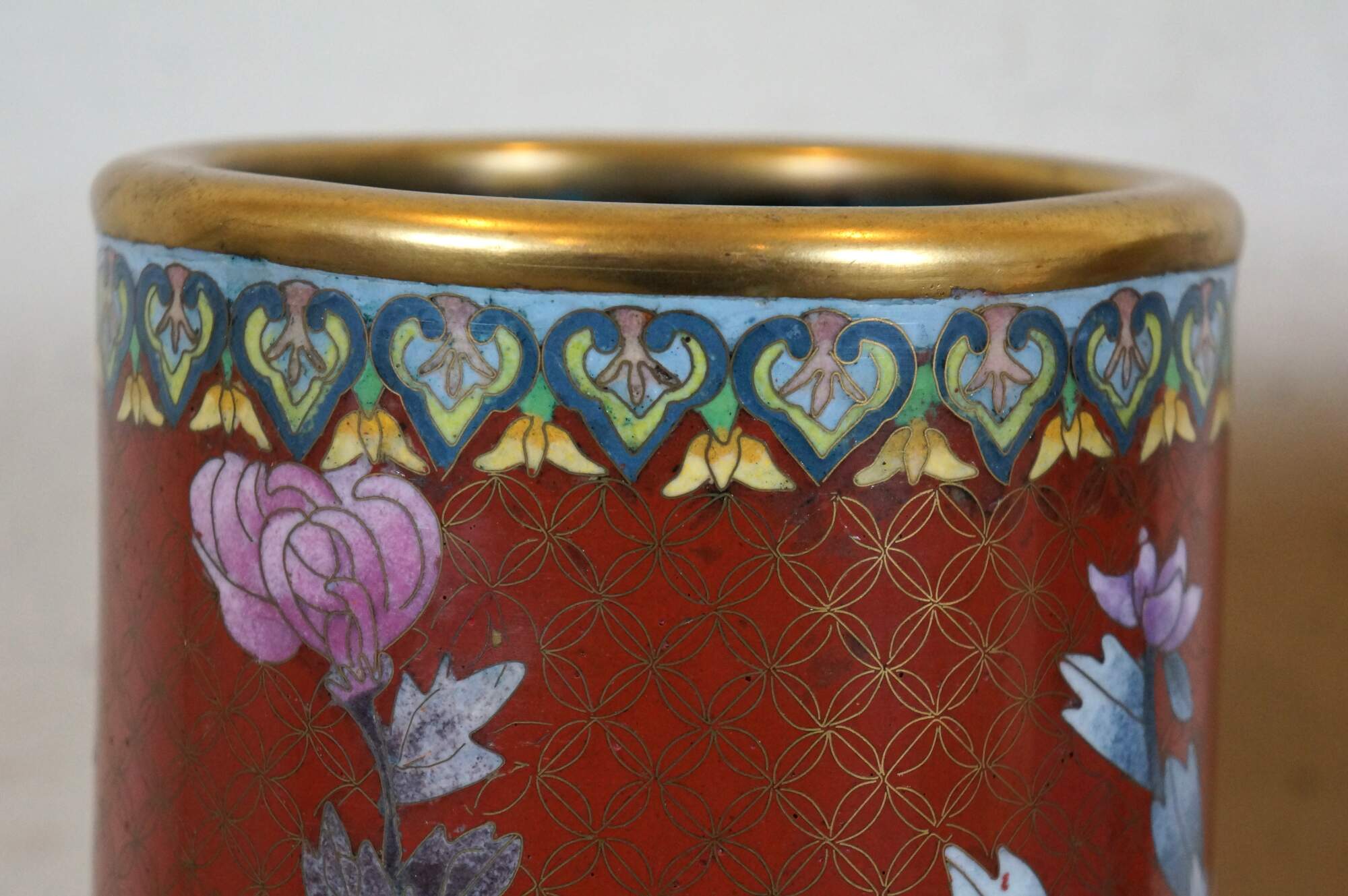 Pair of mid to early 20th-century Chinese cloisonne enamel cylindrical mantel vases/ urns/ hat stands, featuring a red background patterned with interlocking circles behind blue and purple chrysanthemum flowers, green and yellow butterflies, and turquoise floral and butterfly borders. Robin's egg blue/turquoise interior and base.
