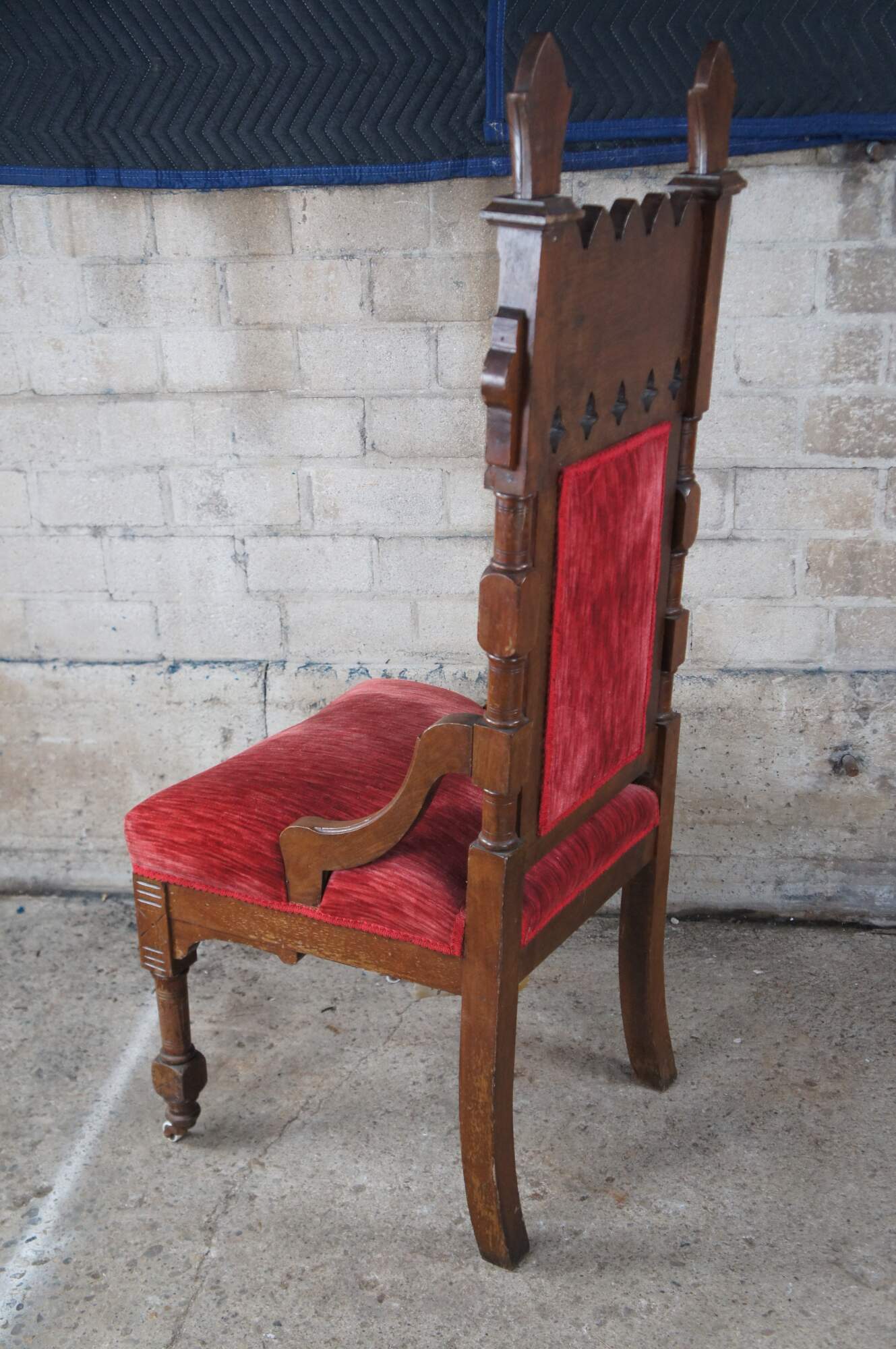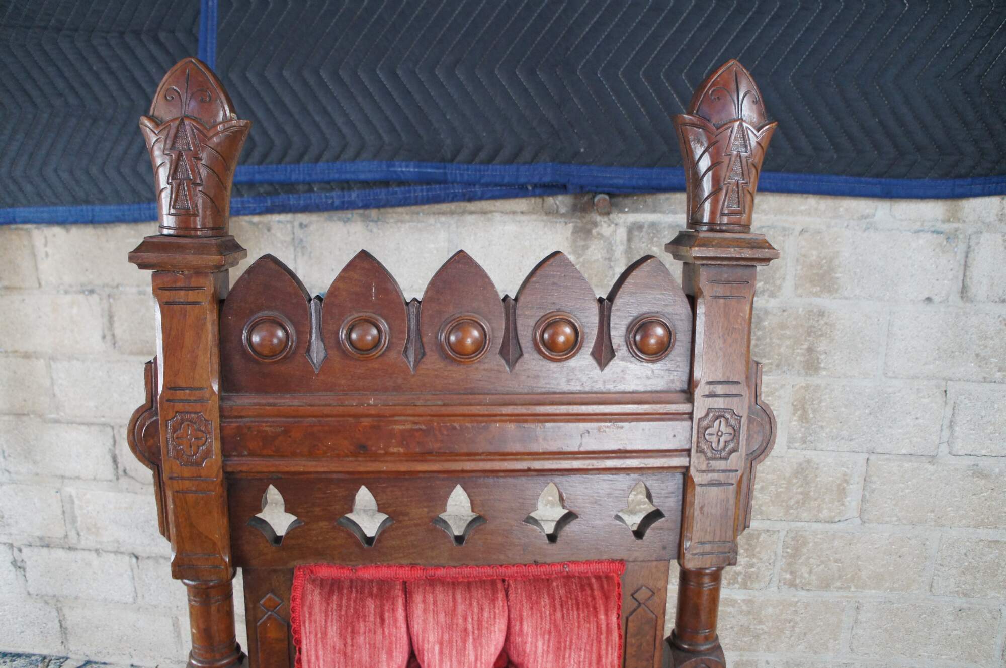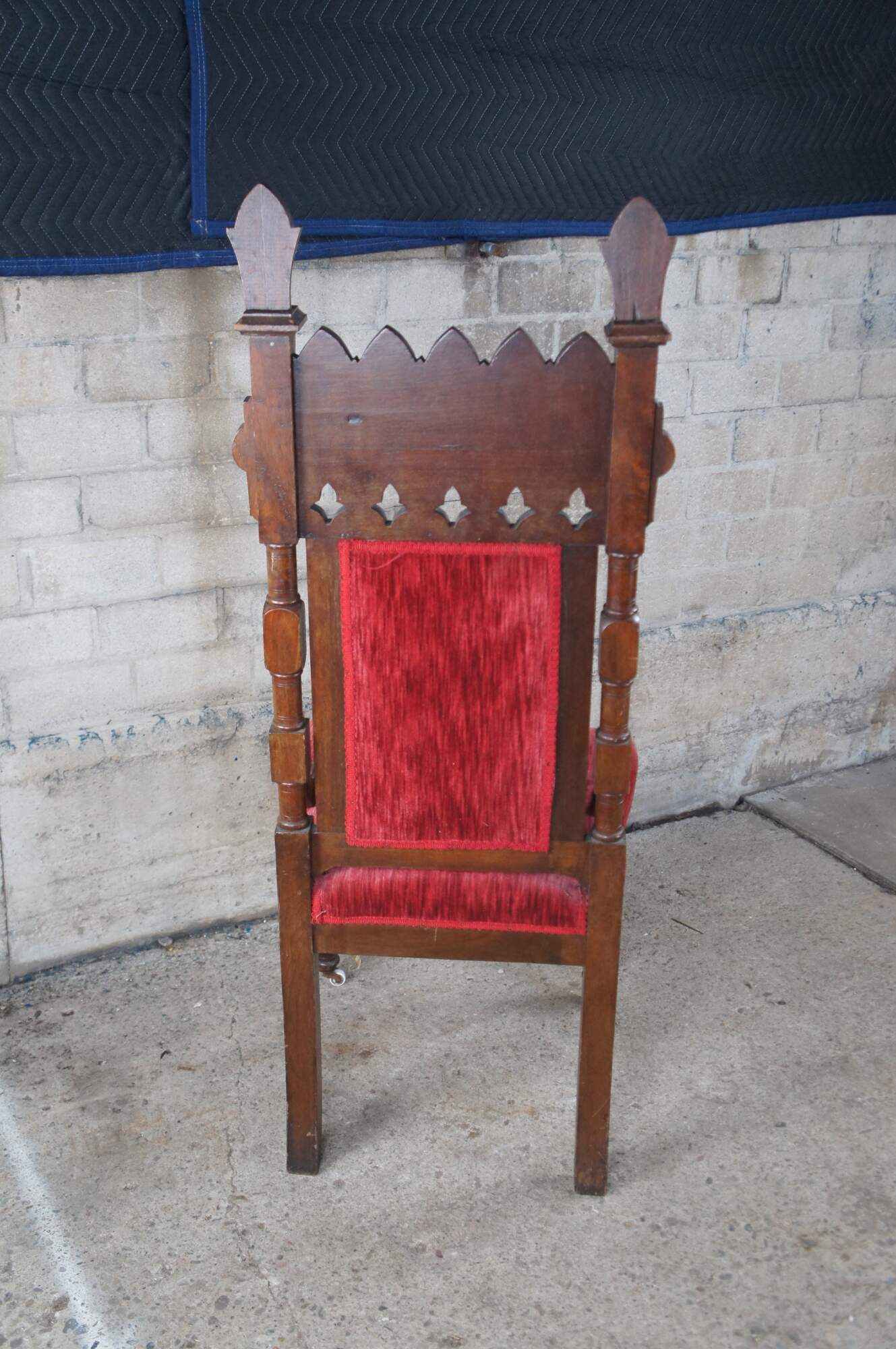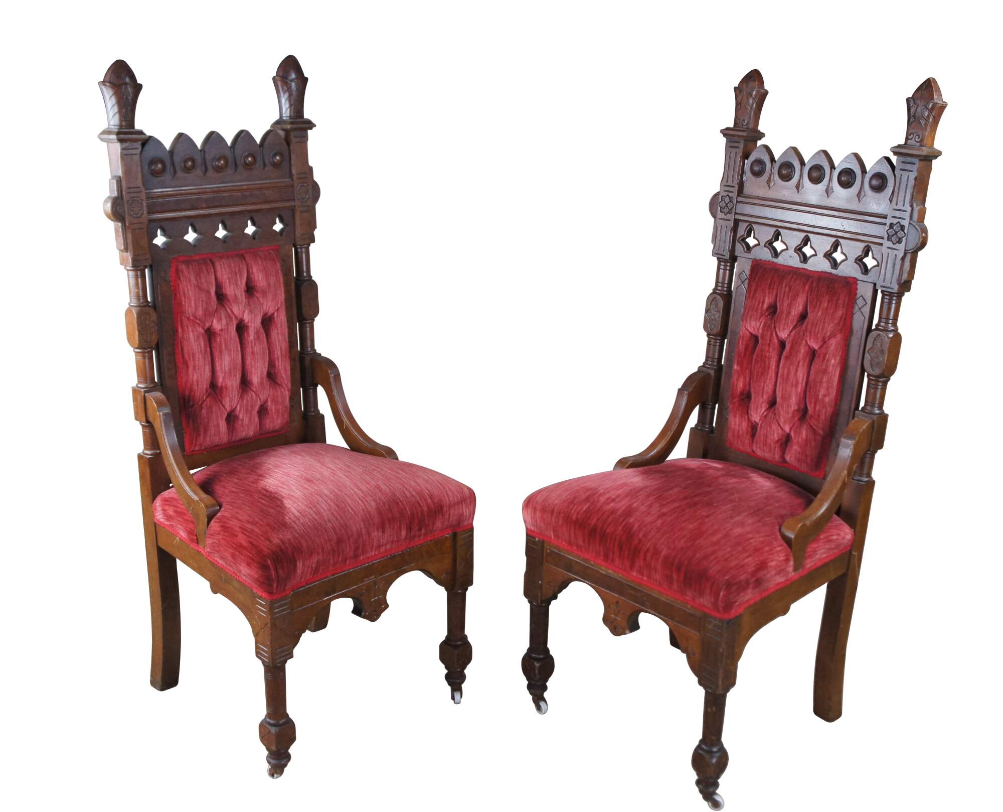 Pair of antique Victorian Gothic-style highback throne chairs. Features a walnut frame with a pierced and carved back, upholstered in a red velvet with a tufted back. The chair is accented by walnut burl panels and topped by mitre hat-carved finials. The mitre hat is the type of headgear often seen on popes and bishops. The chairs are supported by blocked and turned legs with porcelain casters.