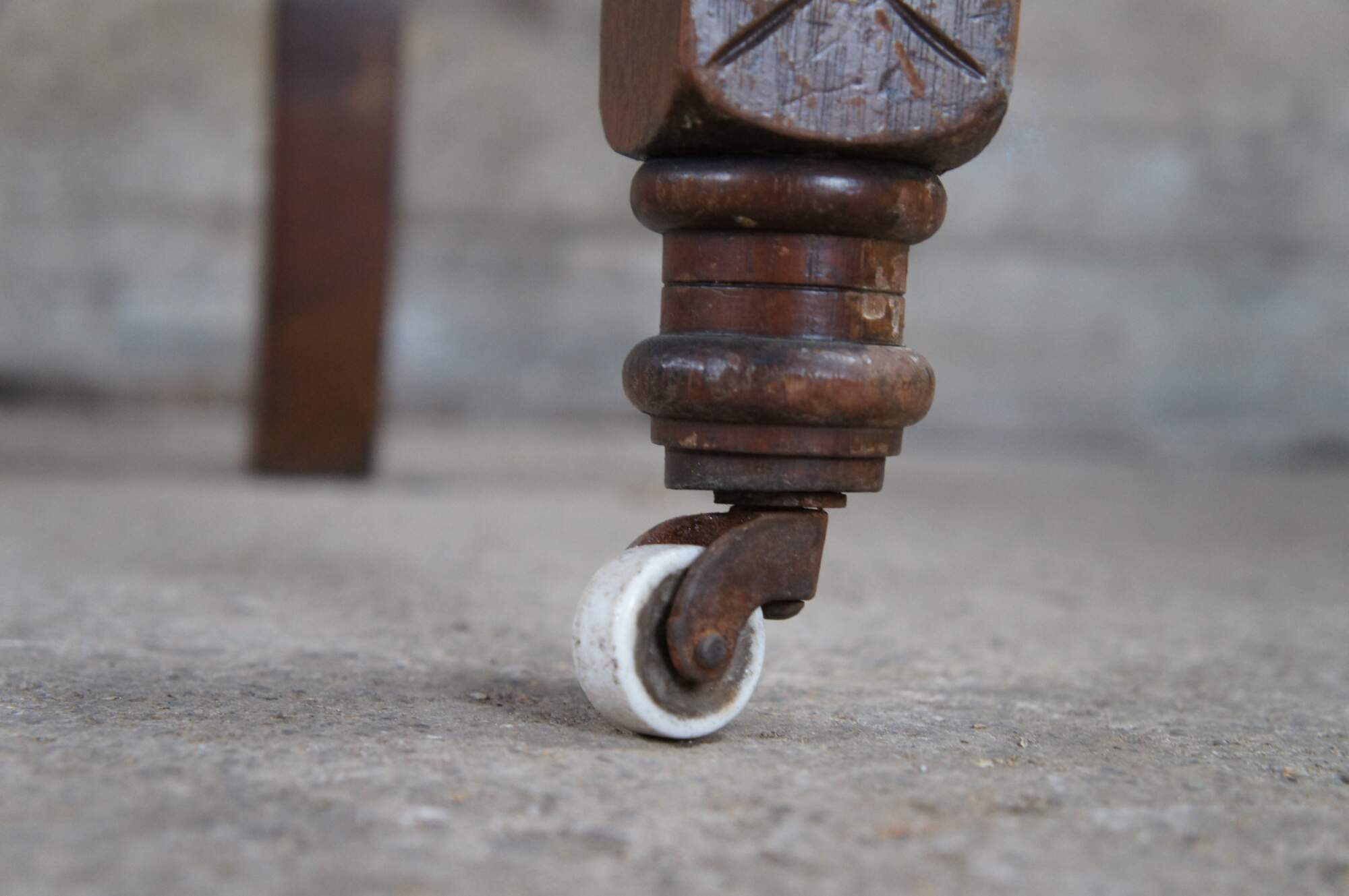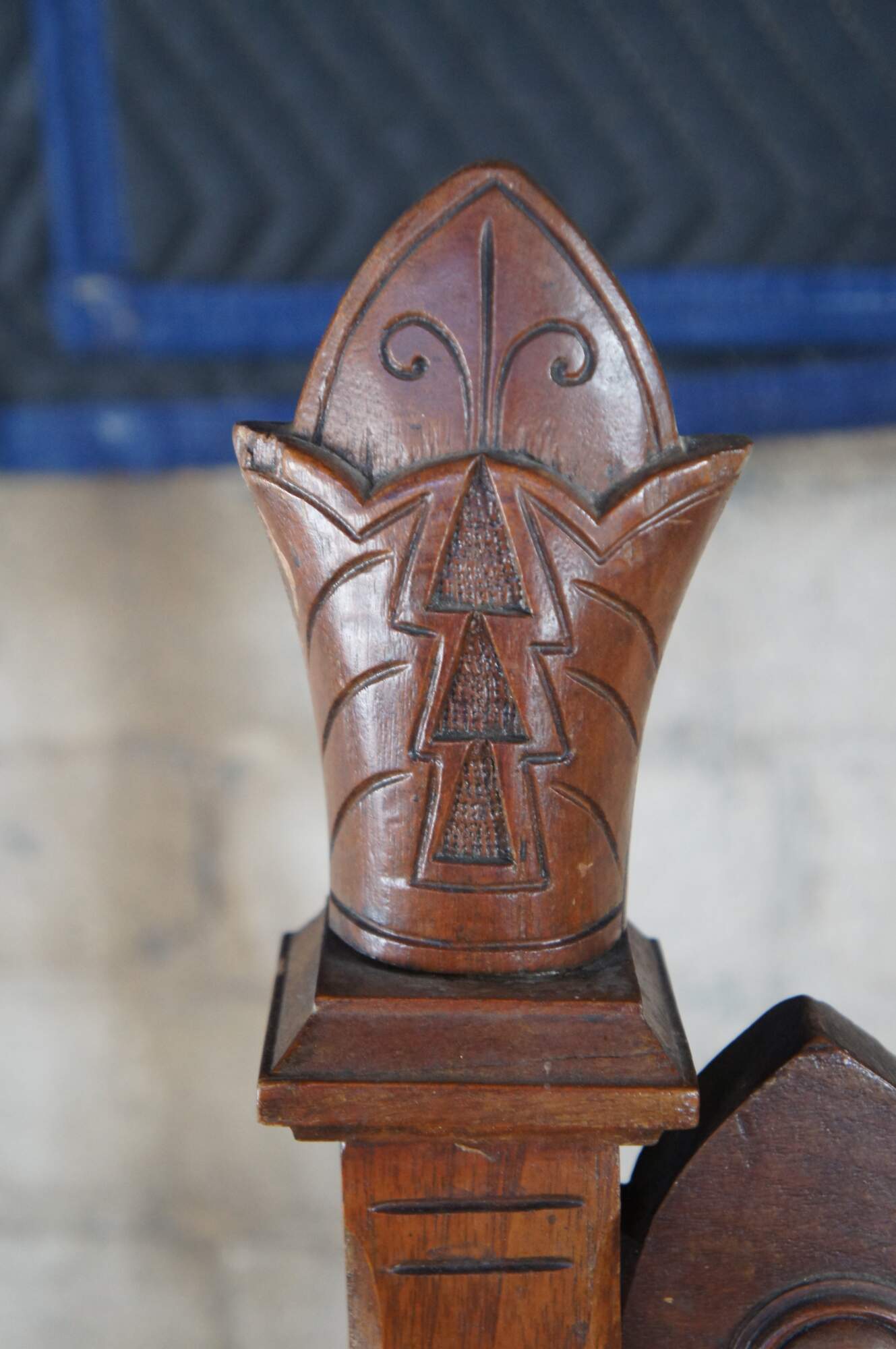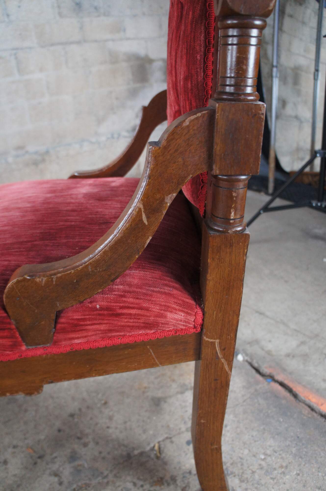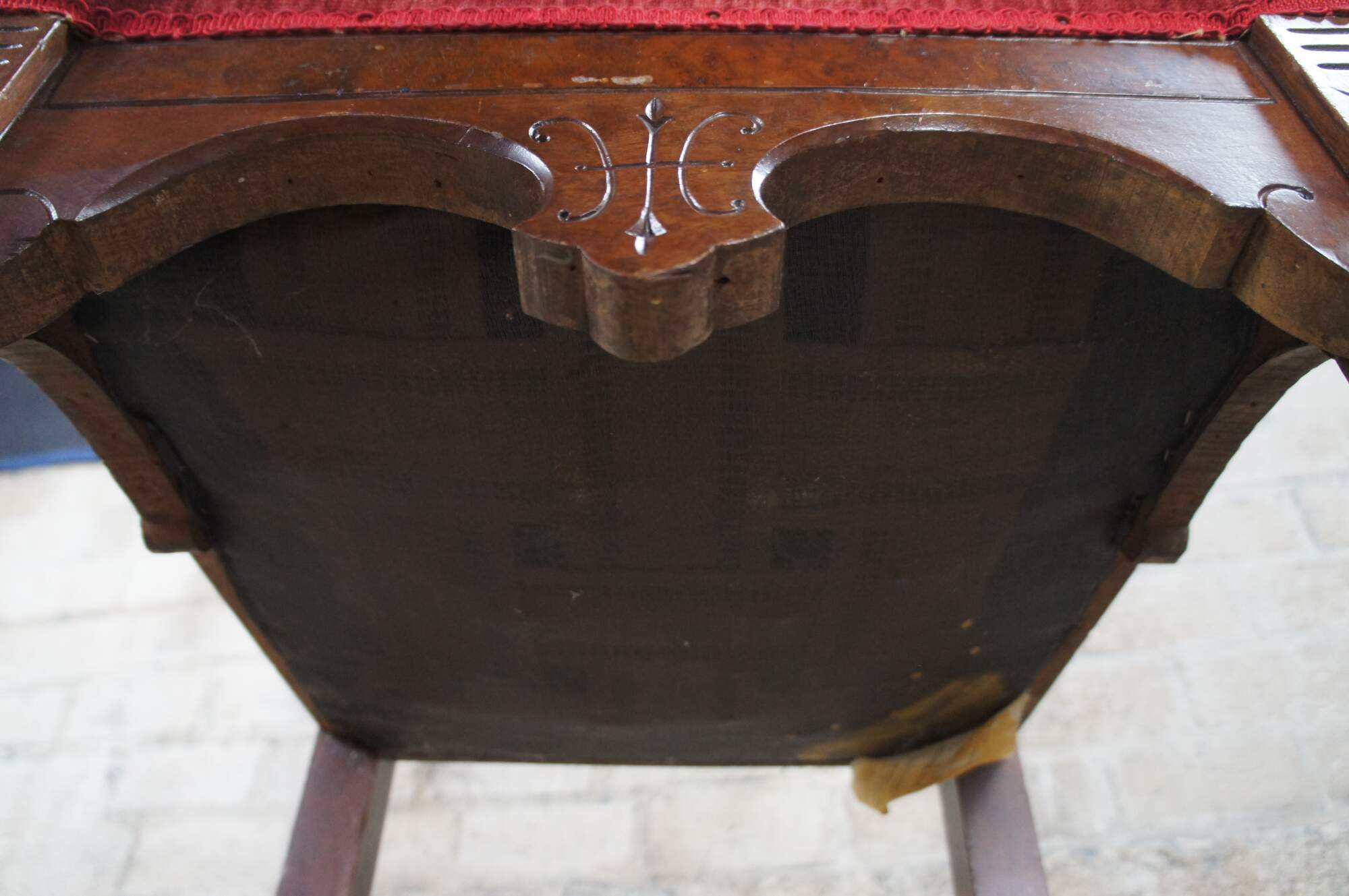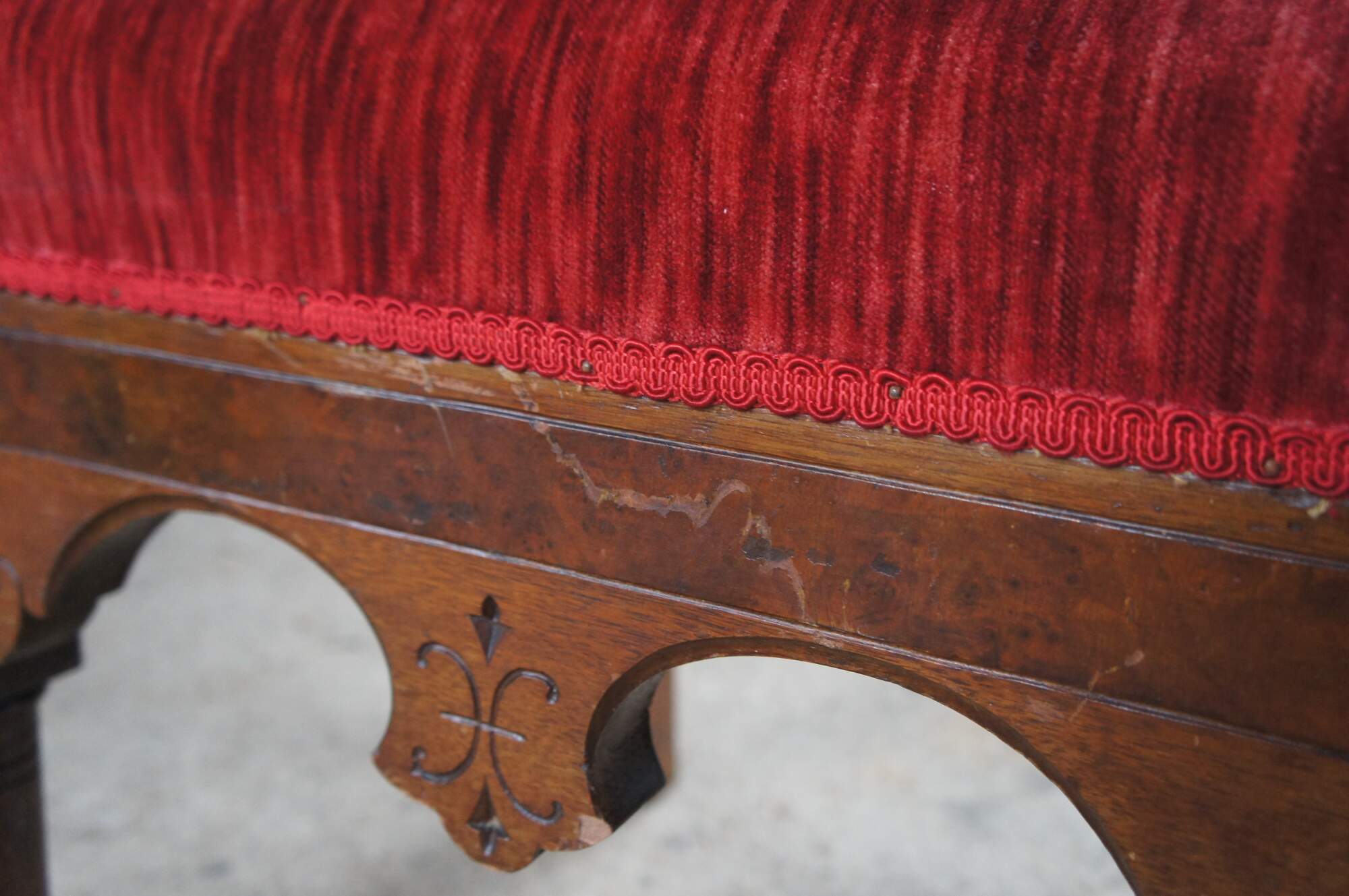 Pair of antique Victorian Gothic-style highback throne chairs. Features a walnut frame with a pierced and carved back, upholstered in a red velvet with a tufted back. The chair is accented by walnut burl panels and topped by mitre hat-carved finials. The mitre hat is the type of headgear often seen on popes and bishops. The chairs are supported by blocked and turned legs with porcelain casters.
